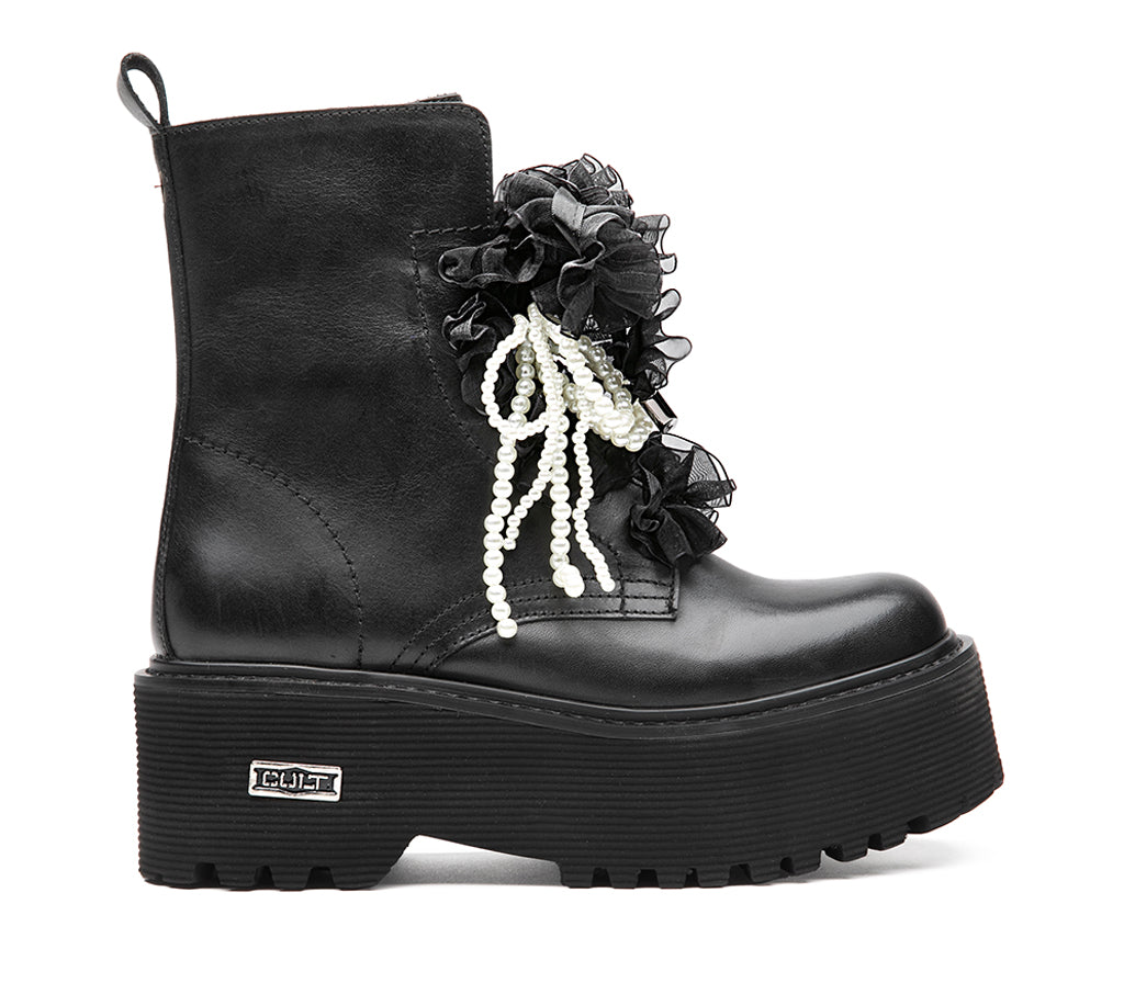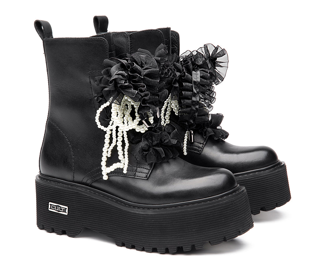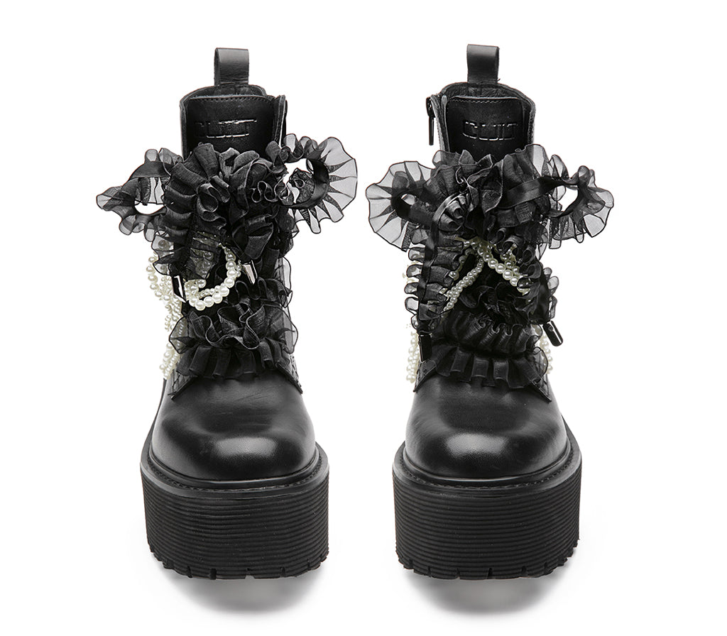 Timeless, these Cult amphibians from the AXL line in black leather combine character and feminine details. The increased volumes are enhanced by metal eyelets and lace-up closure via delicate ruffles and a bow embellished with pearls that give a refined and original touch. These amphibians will add a rock and romantic allure at the same time to any of your outfits.