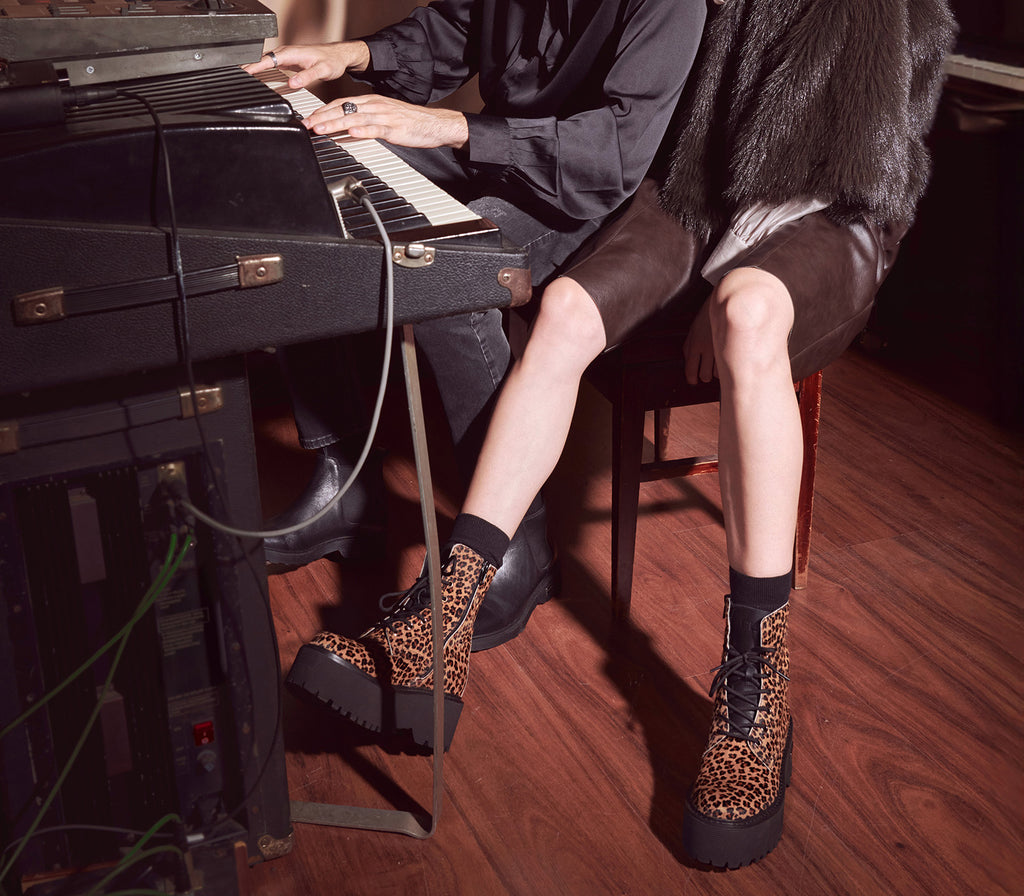 Timeless these Cult signature leather amphibians from the AXL line, in their new and distinctive animal version. Increased volumes with eyelets, metal plaque, contrasting black maxi sole and lace-up closure: this new model will add a rock touch to any of your outfits.