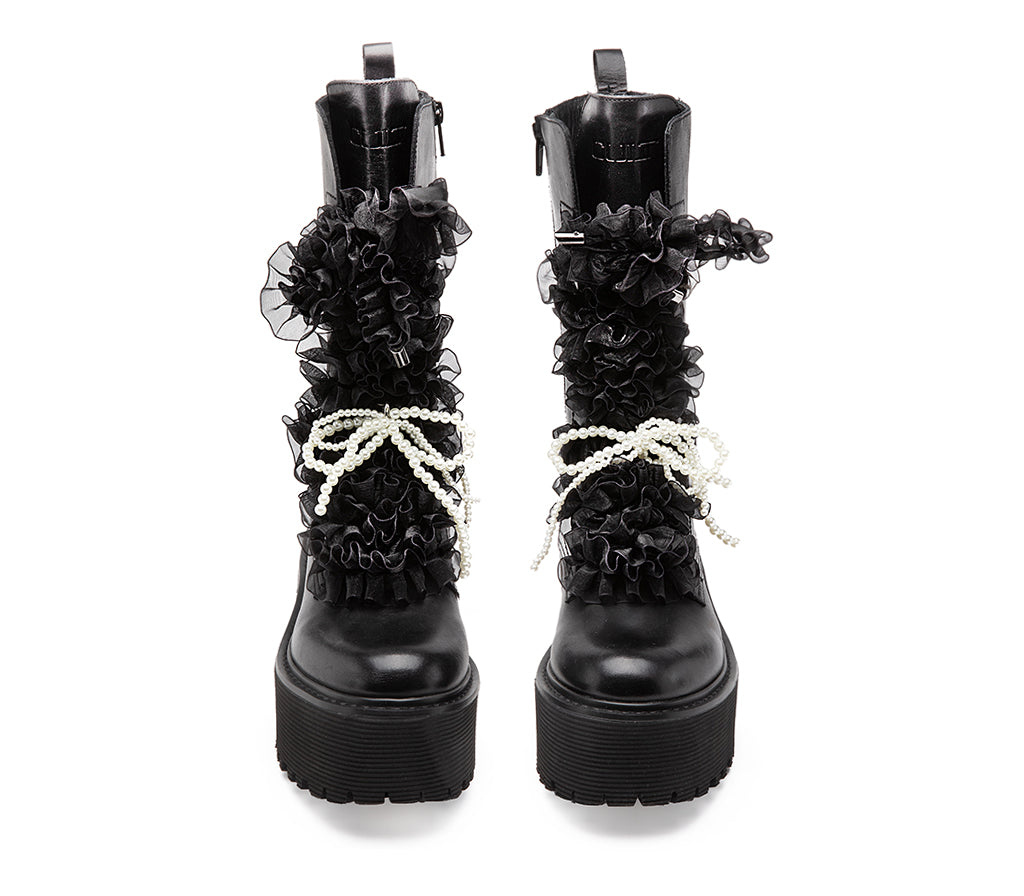 Timeless, these Cult boots from the AXL line in black leather combine character and feminine details. The increased volumes are enhanced by metal eyelets and lace-up closure via delicate ruffles and a bow embellished with pearls that give a refined and original touch. This original model will give any of your outfits a rock and romantic allure at the same time.