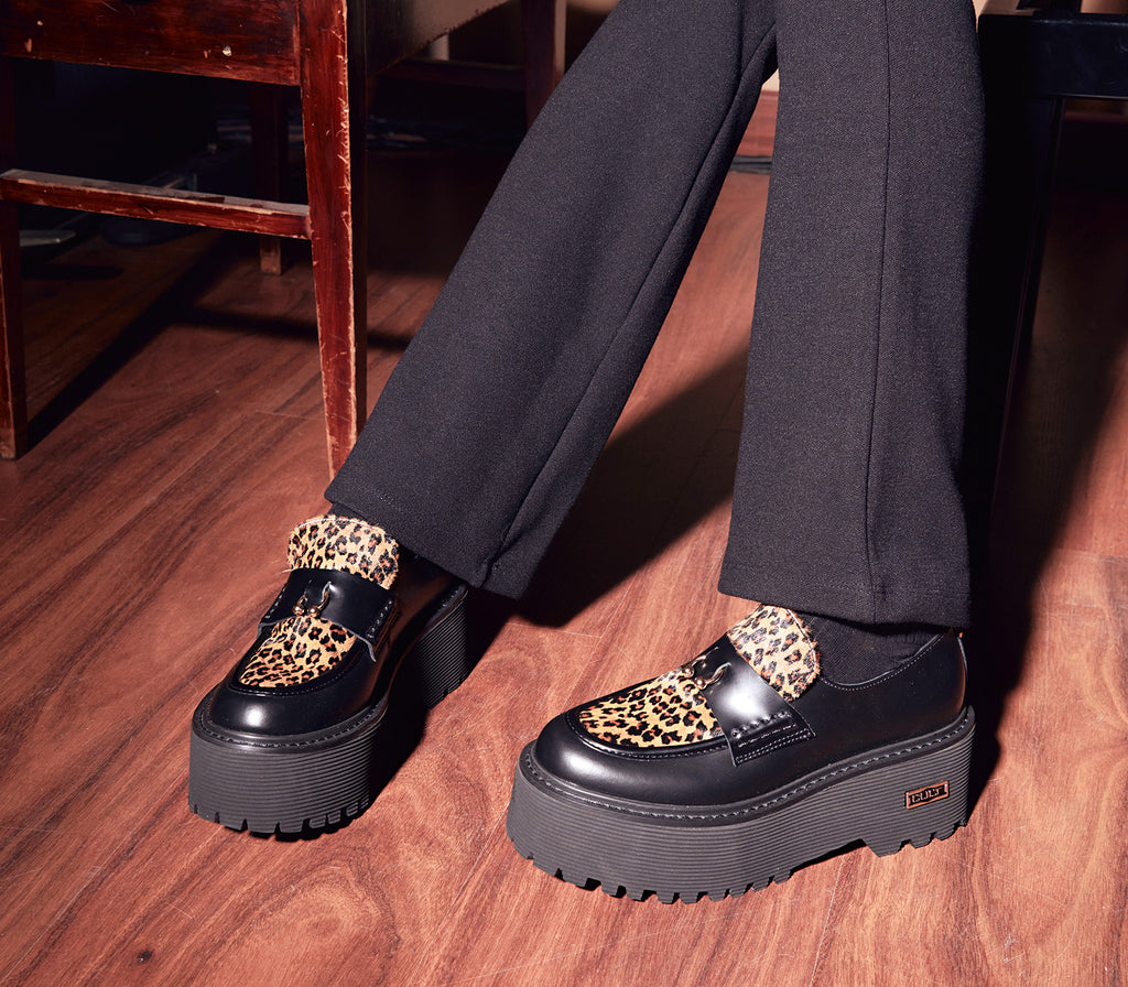 The AXL loafers, made of black leather and signed by Cult, feature a contemporary design and a strong character. The new animalier version enhances the iconic metallic piercing detail, which gives a distinctive and original touch, while the extralight EVA maxi sole adds volume to face winter with style and lightness. Complemented by the iconic logo plaque, these loafers express a bold design with timeless character.