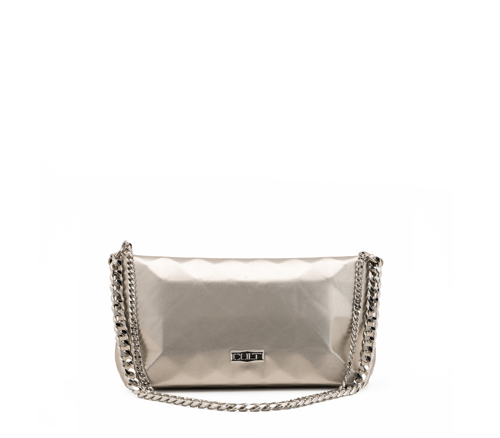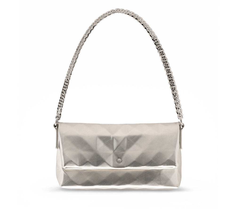 Avanguardia pura e riflessi metallici: la borsa a tracolla Gordon per la stagione SS26 ridefinisce il concetto di accessorio urban-glam. Realizzata in un’esclusiva tonalità silver, si distingue per la patta frontale con lavorazione geometrica 3D a piramidi, che crea un ipnotico gioco di luci e ombre. La doppia tracolla in catena metallica e il design strutturato la rendono il pezzo perfetto per chi cerca un'eleganza magnetica e futuristica. Dimensioni: 30,5x16x7,5