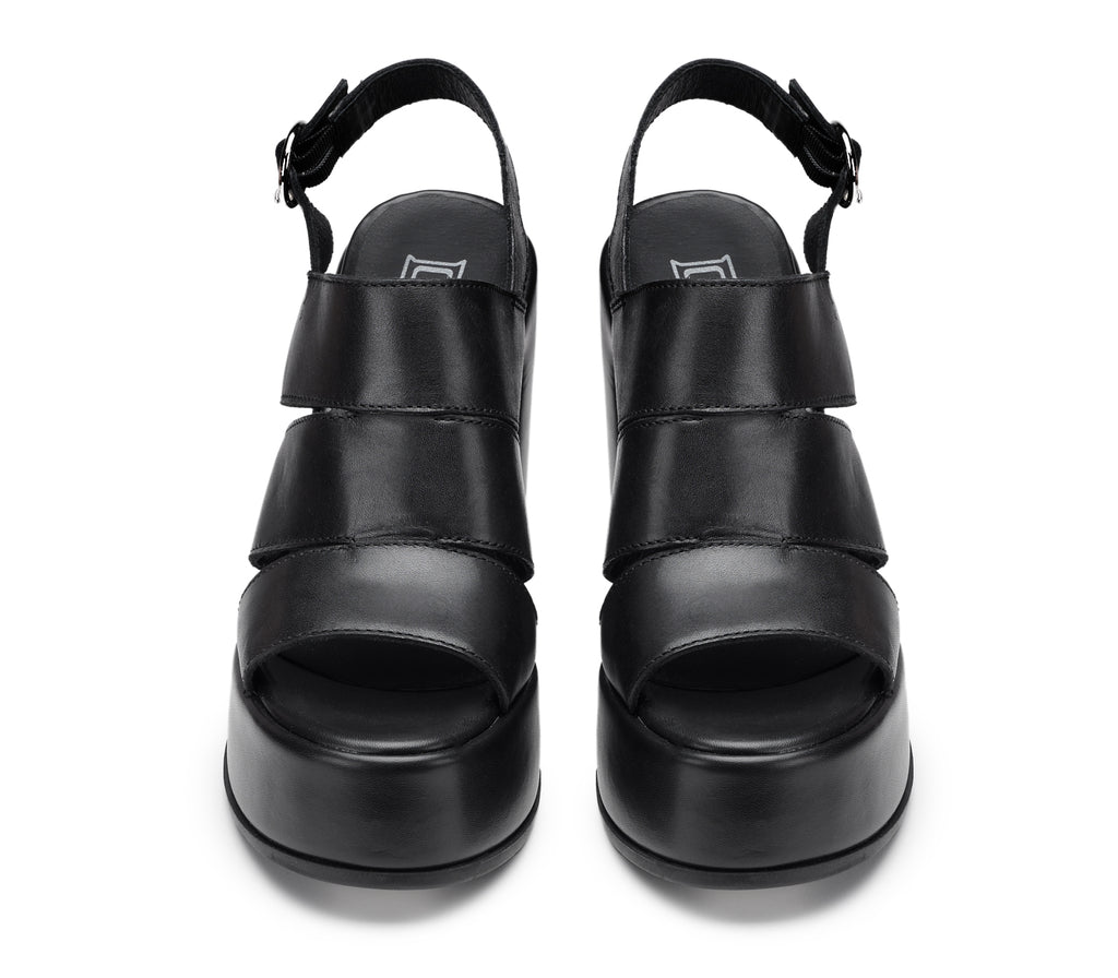Let your style shine with the black leather BJORK sandals by Cult for this new season. Featuring a bold block heel and generous platform, they stand out for their triple top strap that enhances an unmistakable silhouette. A must-have for female glam-rock lovers.