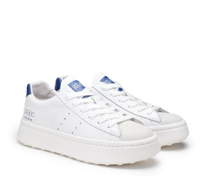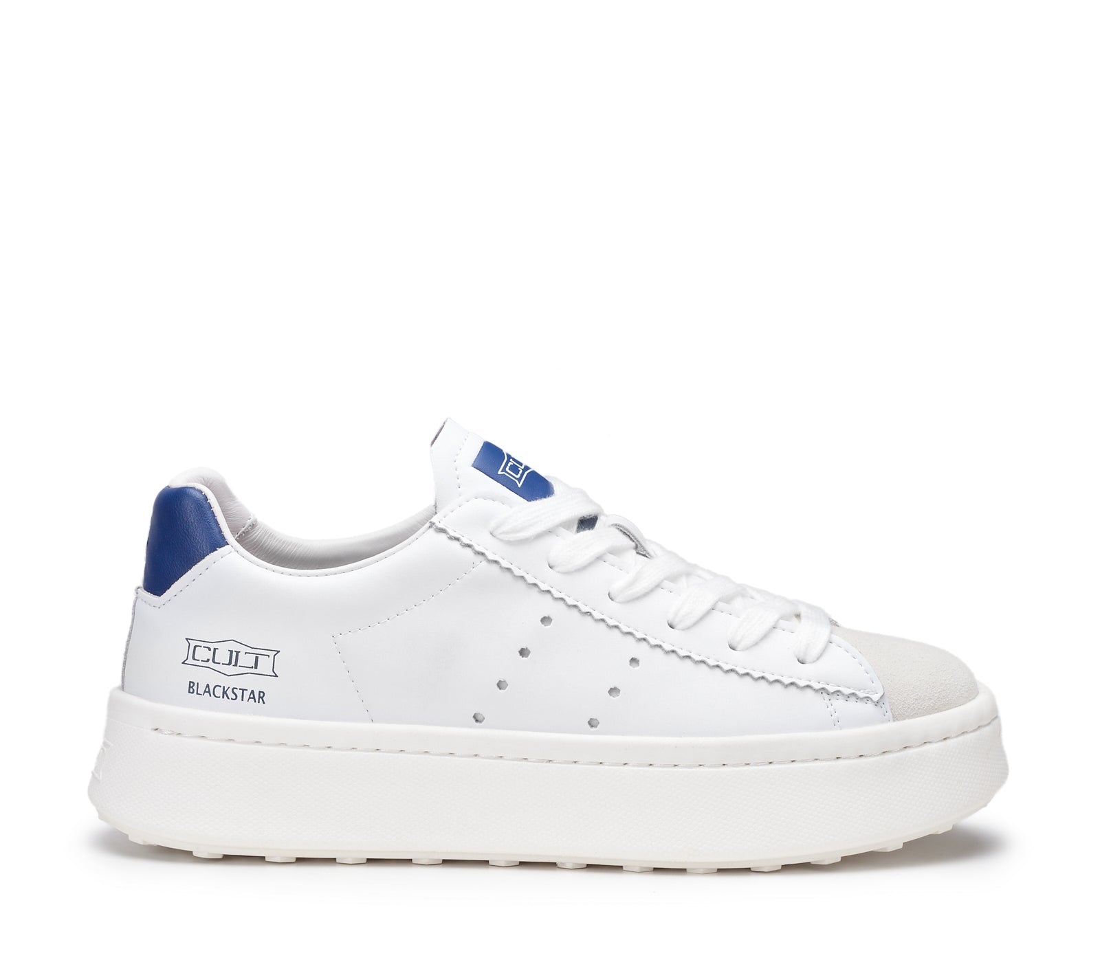 Minimal and contemporary design for the new BLACKSTAR white leather sneakers by CULT Man. They feature elegant contrasting blue details, a voluminous rubber sole and suede toe cap for a sporty-casual attitude. Contrasting brand logo on the side.
