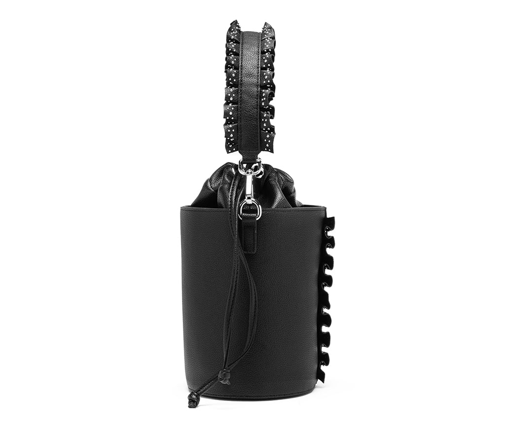 Elegant and compact, this black bucket bag features a cylindrical shape with a drawstring closure at the top. The handle, embellished with a refined curled detail, adds a touch of originality to the design. Modern and distinctive look. Perfect for casual and dressy outfits