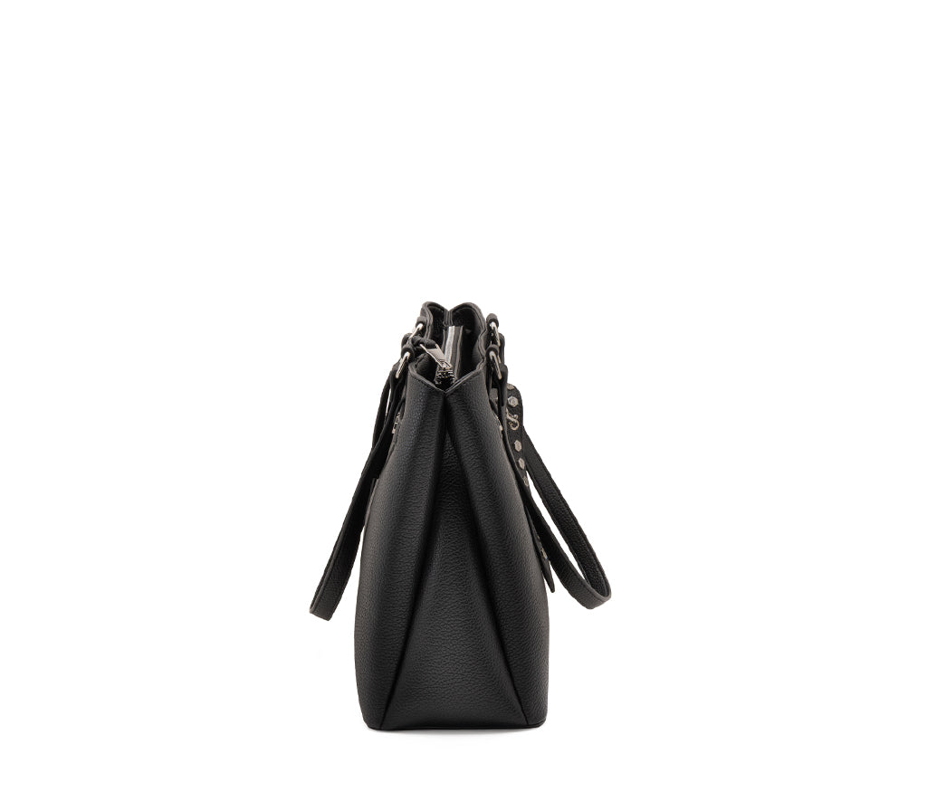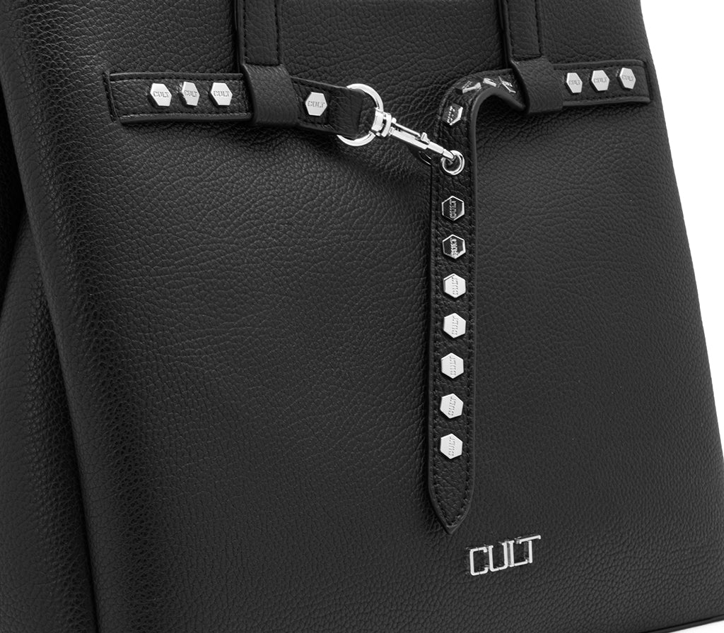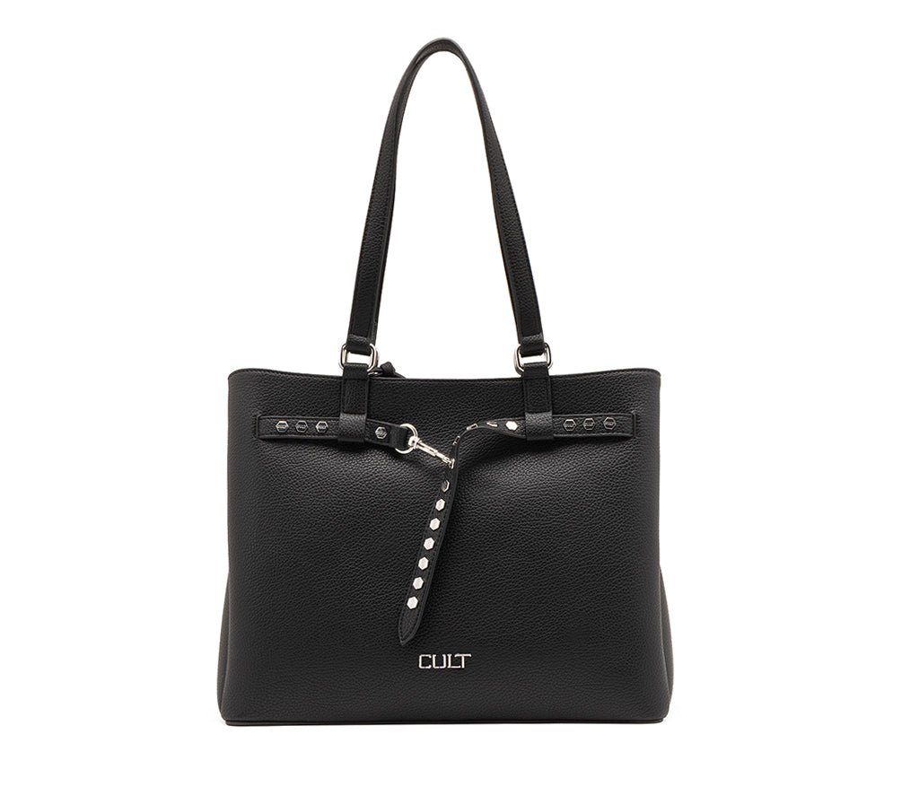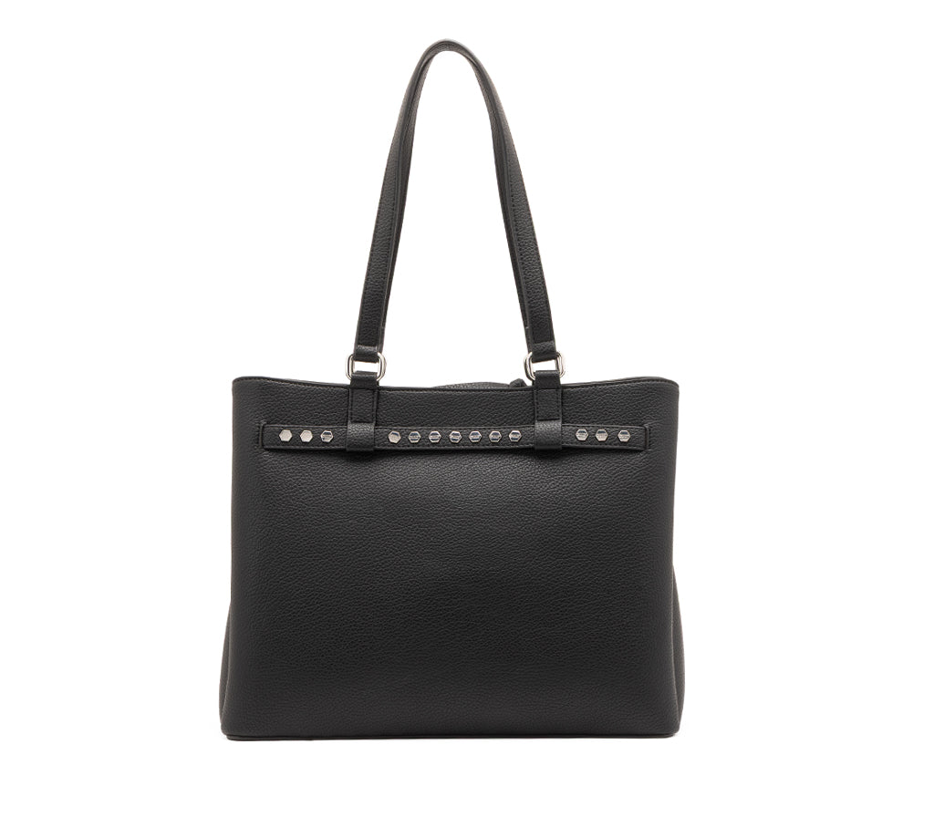 Rigore formale e dettagli di carattere si incontrano nella borsa a spalla Wilson per la stagione SS26, una borsa dalla silhouette verticale pensata per chi cerca un accessorio spazioso e sofisticato. Realizzata in ecopelle nera con grana naturale, si distingue per il design minimalista arricchito da un cinturino decorativo centrale con fibbia e piccole borchie silver che aggiungono un tocco grintoso. La struttura a soffietto e i doppi manici lunghi la rendono la scelta ideale per accompagnare con stile ogni impegno quotidiano. Dimensioni: 40x28x13