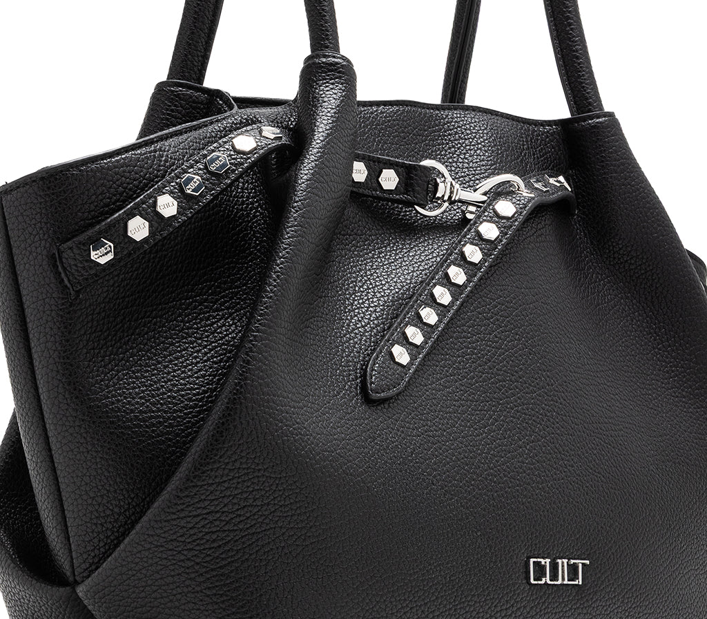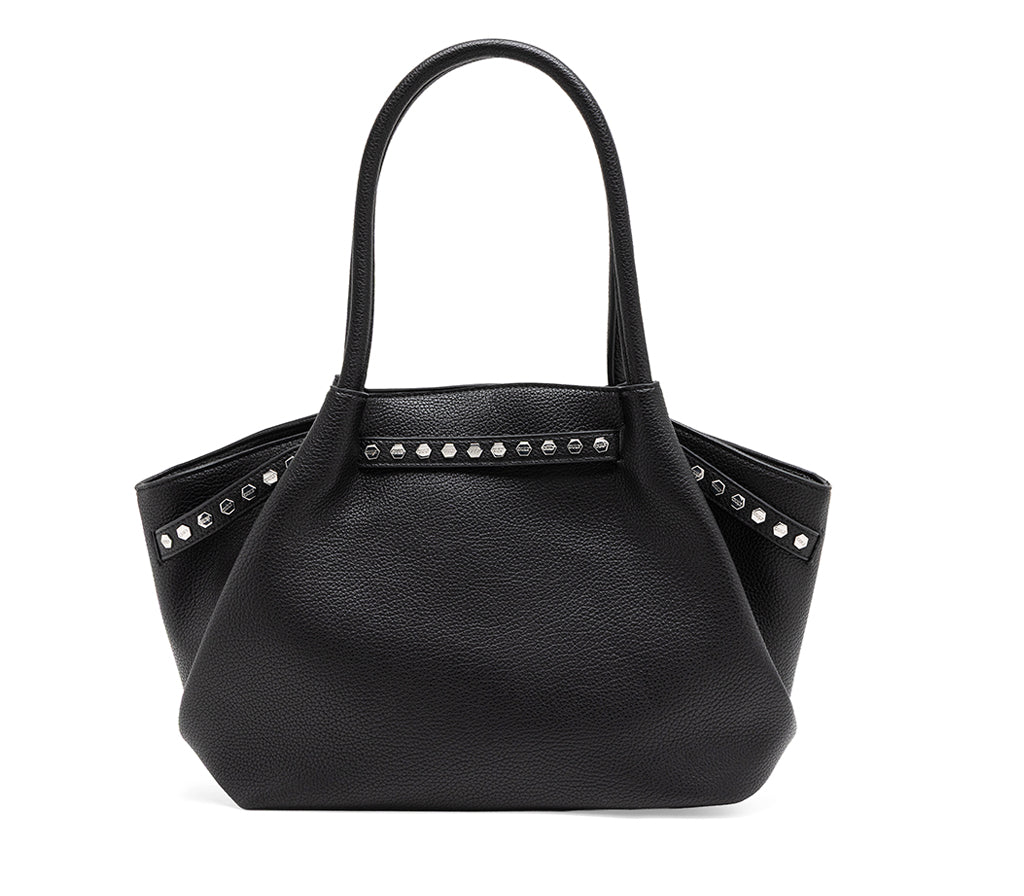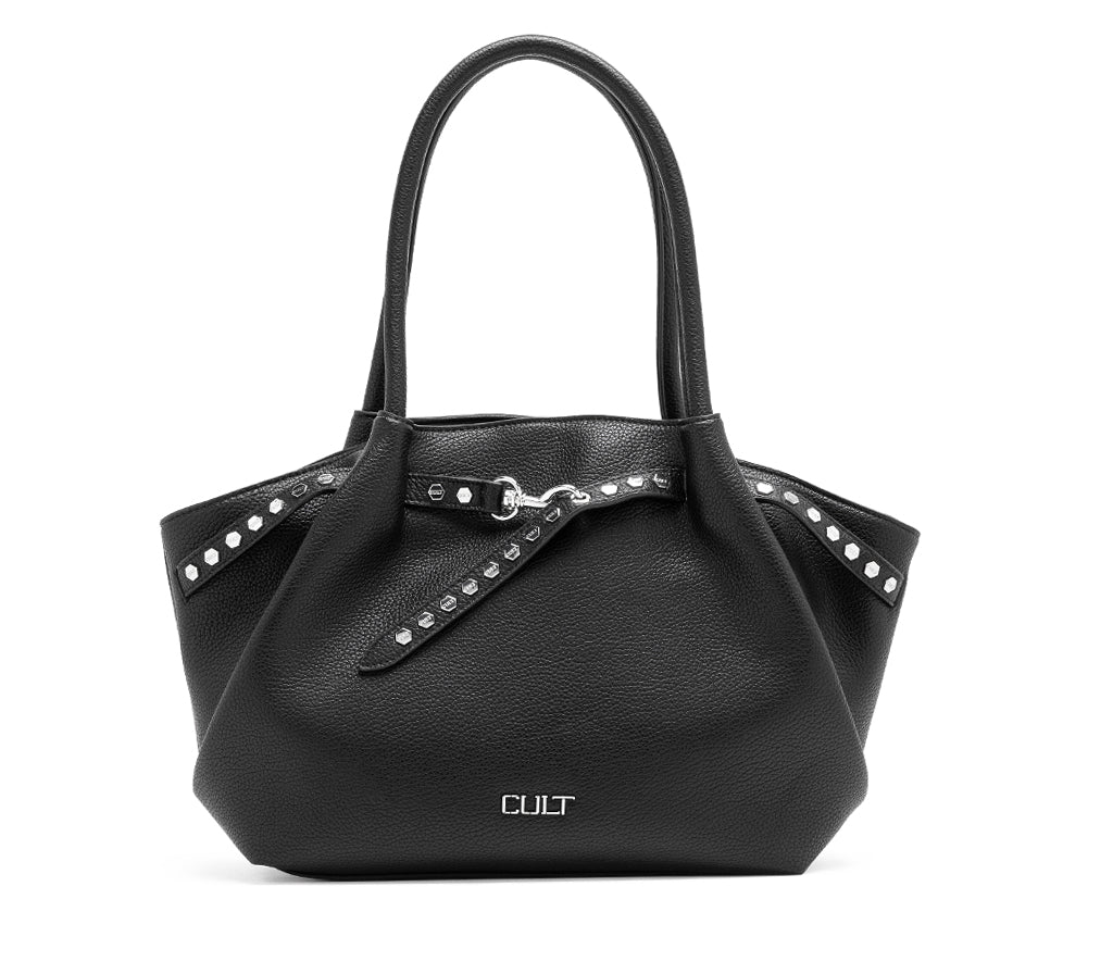 Linee decise e un'estetica contemporanea definiscono la borsa a spalla Wilson per la stagione SS26, un accessorio studiato per chi desidera unire eleganza e attitudine rock. Realizzata in ecopelle nera dalla grana naturale, si distingue per la sua particolare forma svasata e per il cinturino decorativo frontale, impreziosito da una fila di borchie metalliche esagonali con il nome del brand che corrono lungo i profili laterali. La chiusura con moschettone metallico e i doppi manici lunghi la rendono la compagna ideale per affrontare la giornata con uno stile sofisticato e fuori dagli schemi. Dimensioni: 41x26,5x12,5