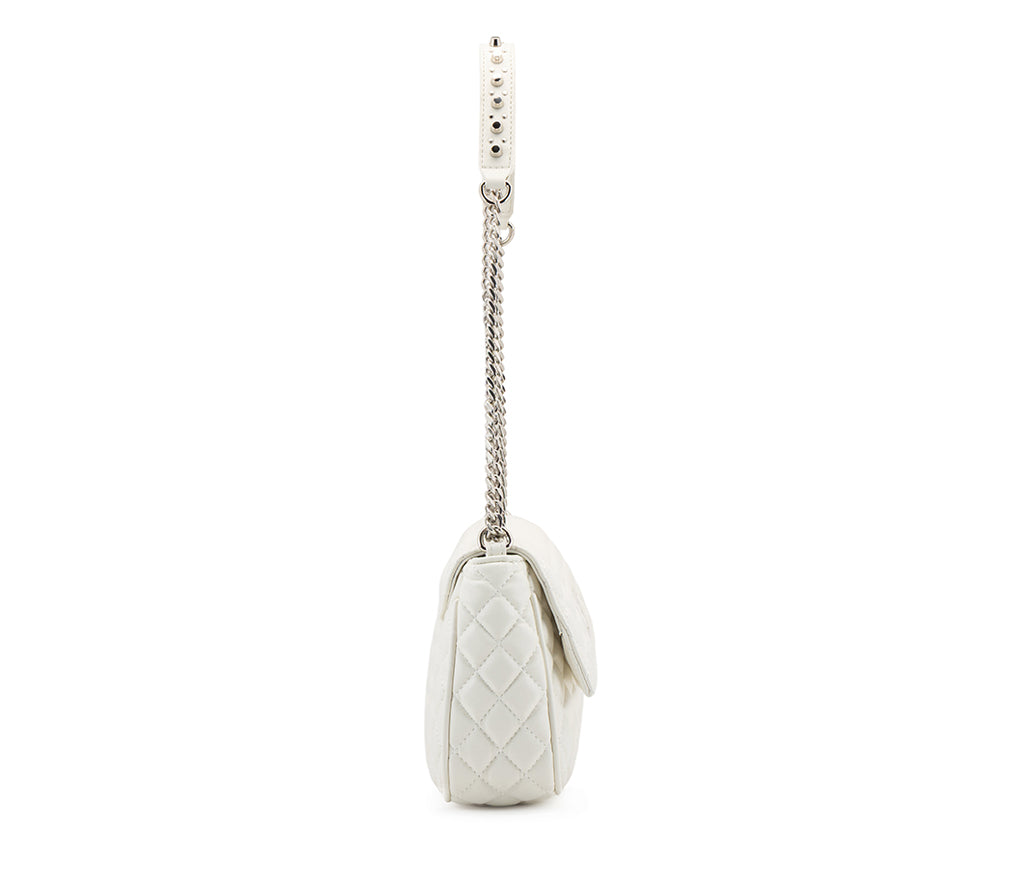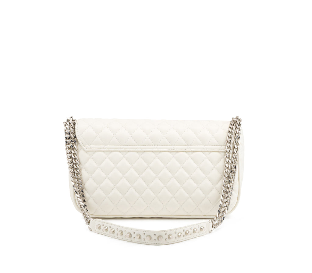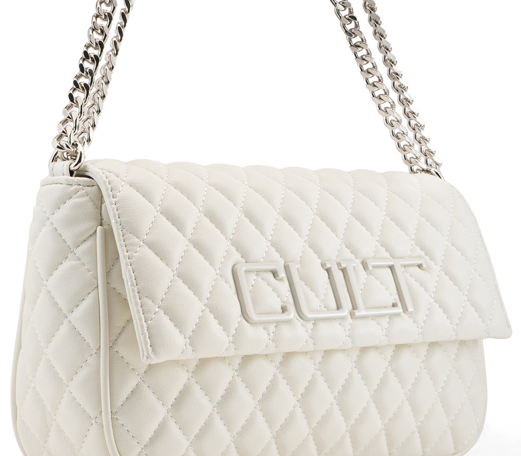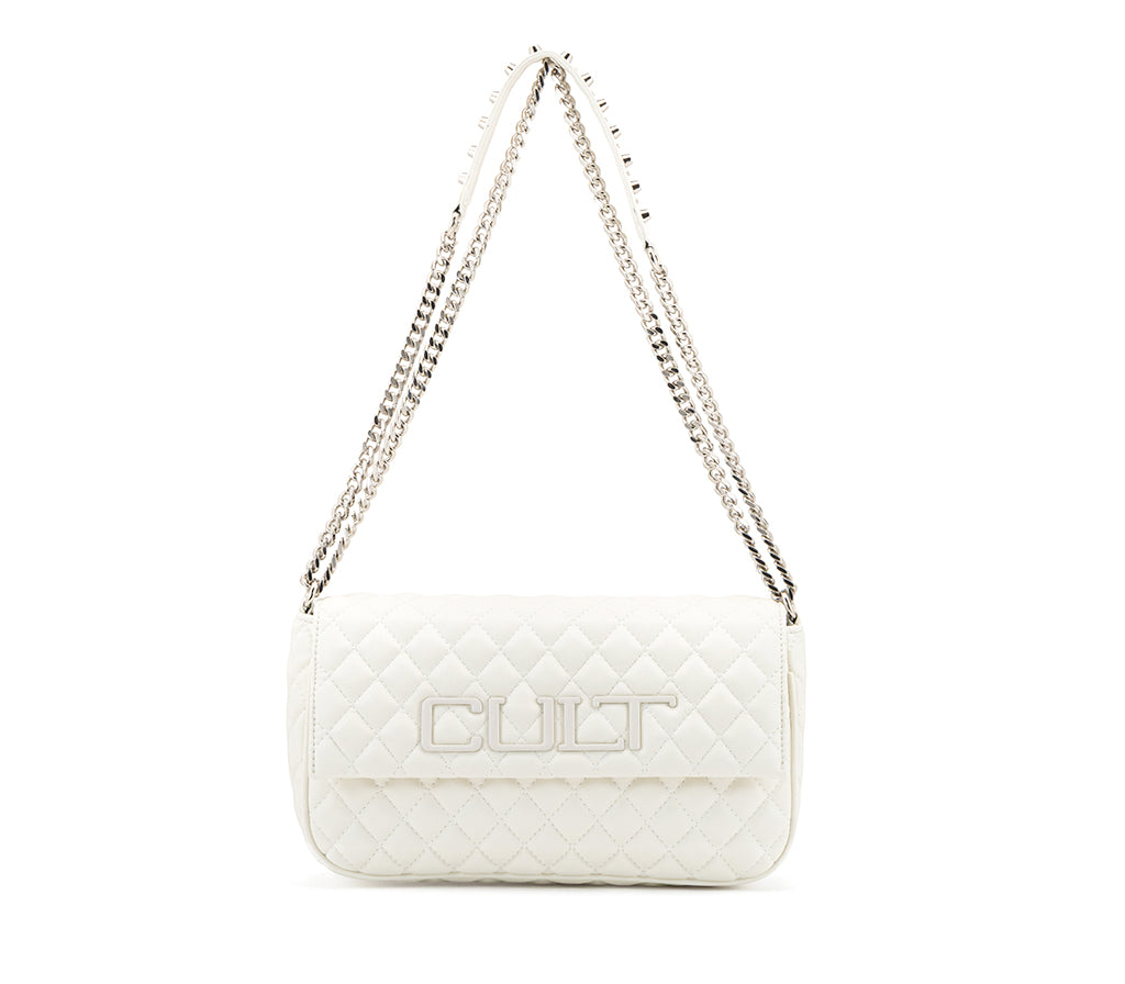 Audace, vibrante e ricca di personalità: la nuova borsa a tracolla Girlschool per la stagione SS26 è l'accessorio che trasforma ogni outfit in una dichiarazione di stile. Realizzata in ecopelle bianca, si distingue per la pregiata lavorazione trapuntata a diamante e per il maxi logo CULT a rilievo cucito sulla patta frontale. Completata da una tracolla a catena grintosa e piccoli dettagli metallici, questa borsa fonde un'estetica giocosa con un'anima profondamente rock. Dimensioni: 27x15x6