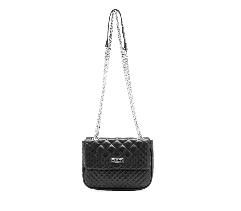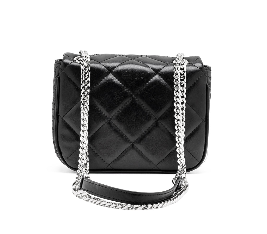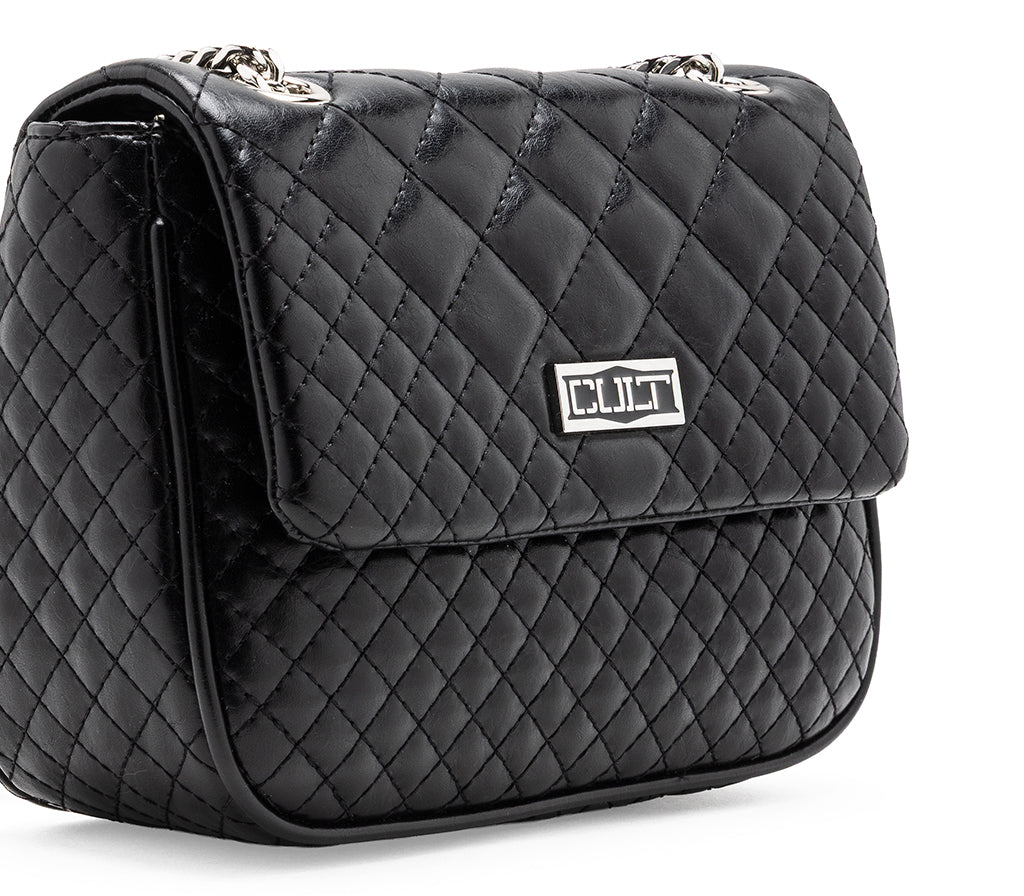 Un'icona di stile che non passa inosservata: la nuova borsa a tracolla con patta firmata Cult per la stagione SS26 eleva l'anima glam-rock del brand con un'elegante lavorazione trapuntata a diamante. Realizzata in morbida ecopelle nera, questa borsa fonde un'estetica sofisticata con dettagli grintosi, rendendola l'accessorio perfetto per chi cerca un look audace, cool ma dal tocco romantico. La pattina frontale presenta con l'iconica placca logo metallica CULT in argento, mentre la tracolla è caratterizzata da un'elegante catena metallica con inserto in ecopelle per il massimo comfort e uno stile deciso. La chiusura, pratica e sicura è ideale per custodire i tuoi essenziali con attitudine. Dimensioni: 22x16,5x9.
