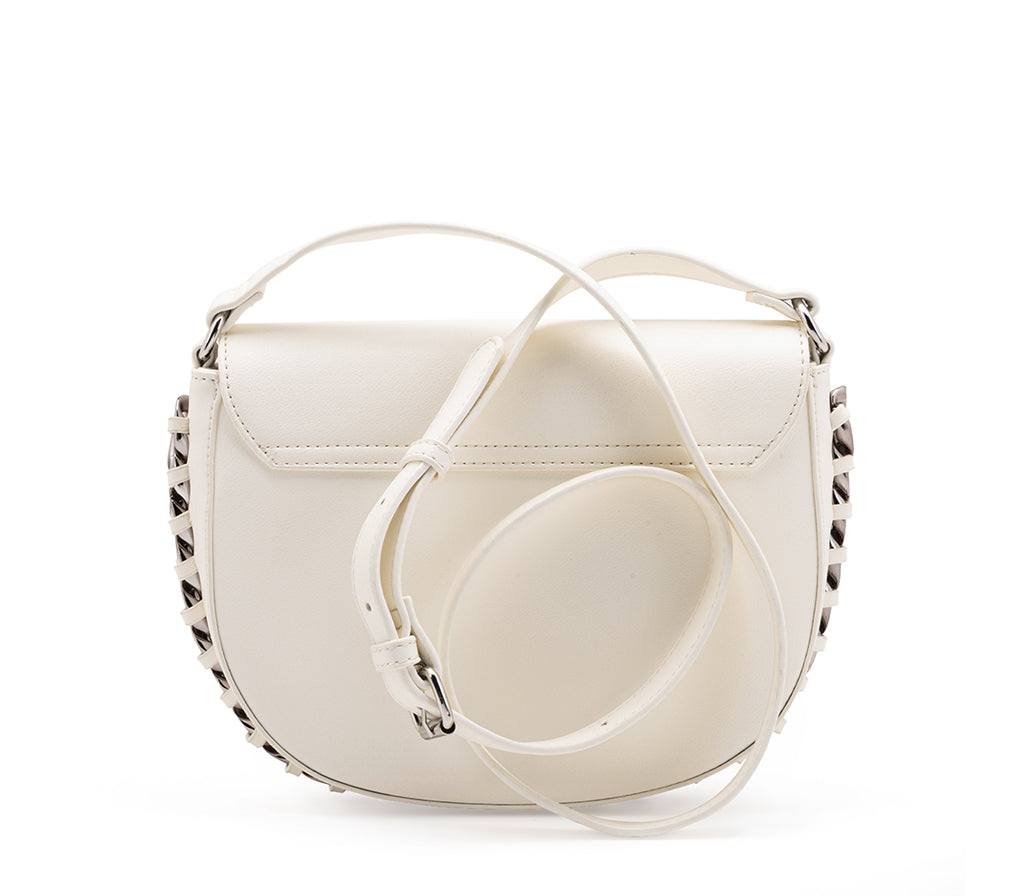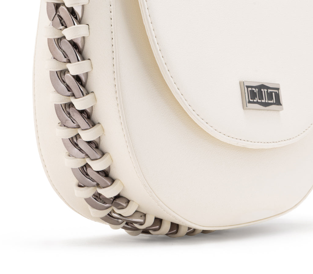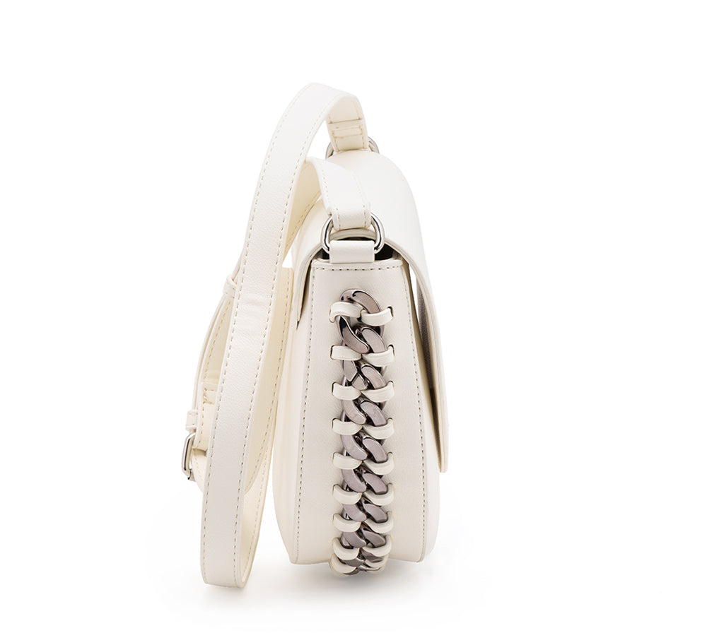Design iconico e dettagli bold definiscono la borsa a tracolla Rock Chain per la stagione SS26, un accessorio che cattura l'essenza punk-chic del brand. Realizzata in ecopelle bianca dalla finitura liscia, si distingue per la silhouette a sella con patta arrotondata, impreziosita da una catena metallica intrecciata lungo l'intero profilo laterale. La placca logo argentata frontale sigla un modello compatto e di grande personalità, ideale per illuminare i look stagionali con un tocco deciso. Dimensioni: 26x17,5x6.