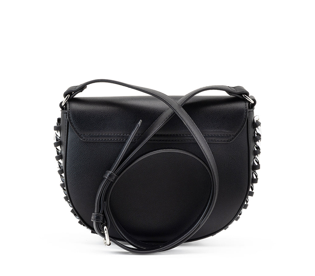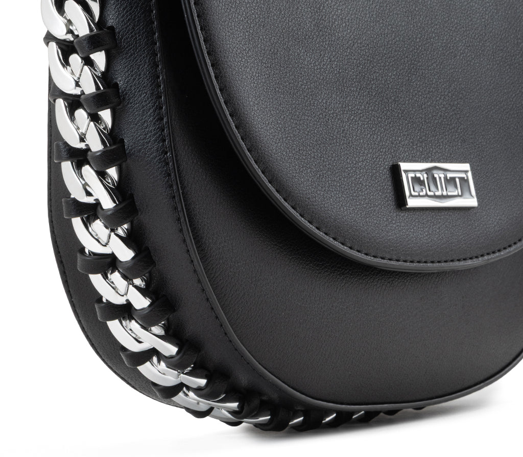 Design iconico e dettagli bold definiscono la borsa a tracolla Rock Chain per la stagione SS26, un accessorio che cattura l'essenza punk-chic del brand. Realizzata in ecopelle nera dalla finitura liscia, si distingue per la silhouette a sella con patta arrotondata, impreziosita da una catena metallica intrecciata lungo l'intero profilo laterale. La placca logo argentata frontale sigla un modello compatto e di grande personalità, ideale per illuminare i look stagionali con un tocco deciso. Dimensioni: 26x17,5x6.