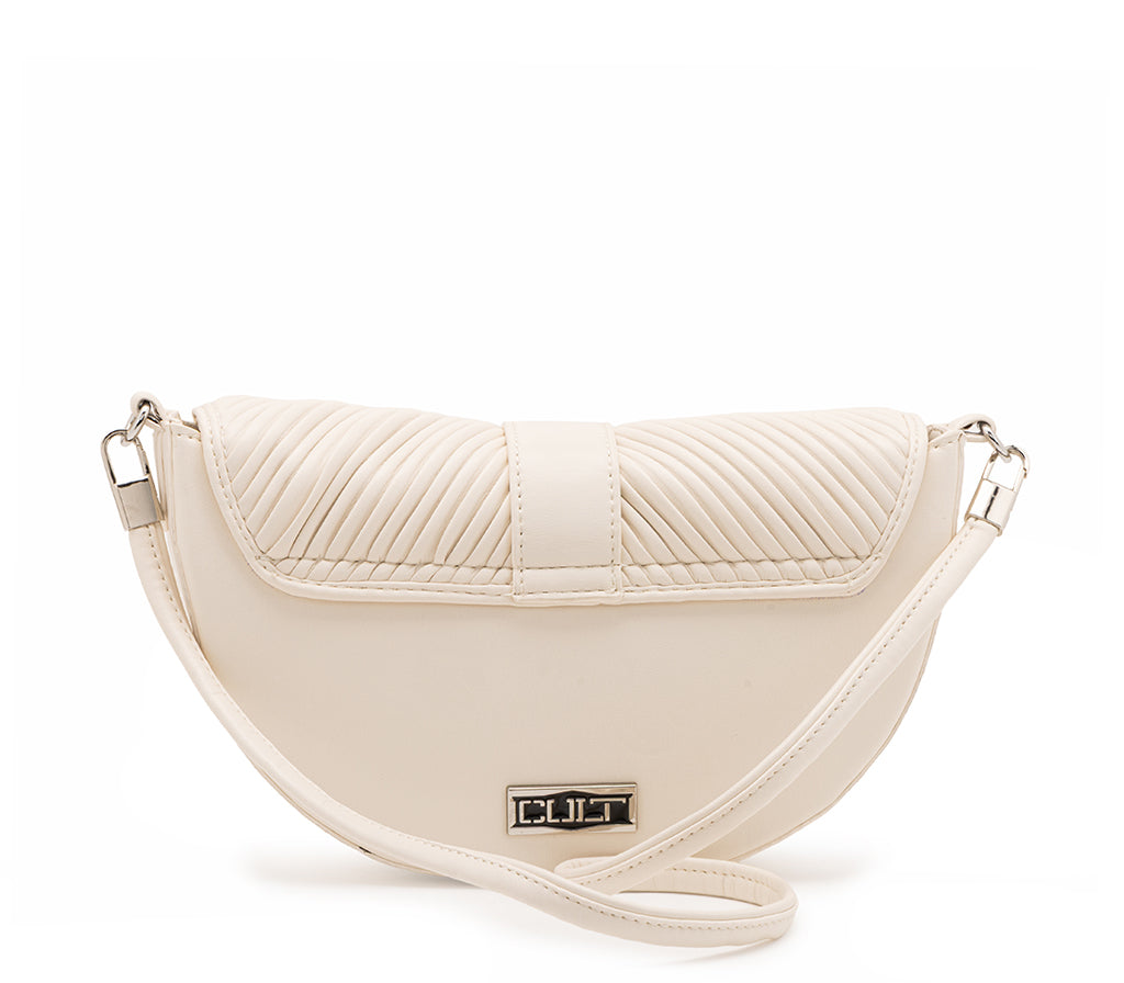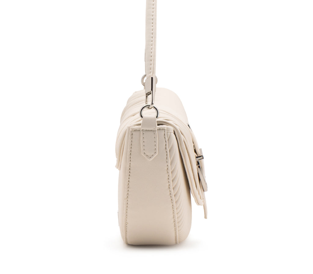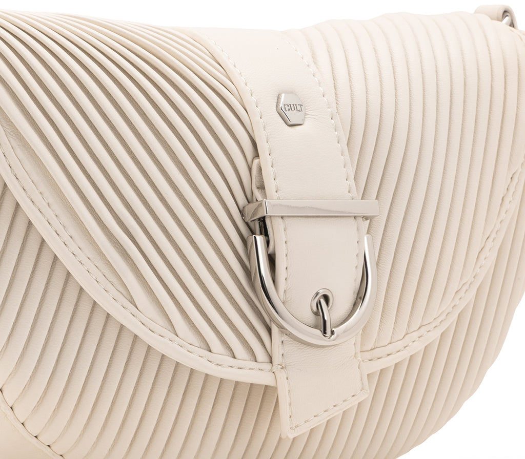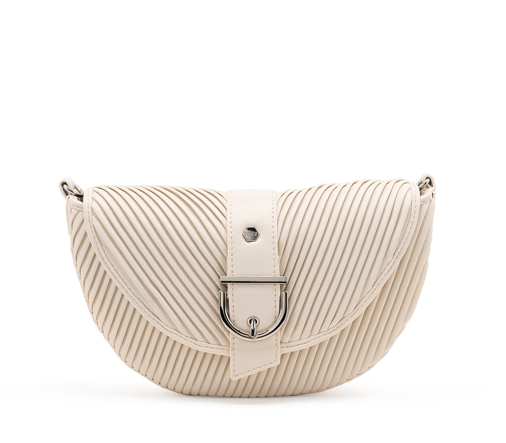 conica e dinamica, la borsa a tracolla Turner per la stagione SS26 si distingue per la sua silhouette a sella e la distintiva texture a micro-nervature orizzontali in ecopelle panna. Il design è impreziosito da una patta frontale con una vistosa fibbia metallica decorativa in finitura silver e dall'immancabile placca logo laterale. Dotata di una tracolla regolabile e rimovibile, questa borsa fonde un’estetica urban contemporanea a dettagli di ispirazione tecnica, rendendola l’accessorio cool perfetto per chi cerca uno stile deciso e originale. Dimensioni: 27x17x6
