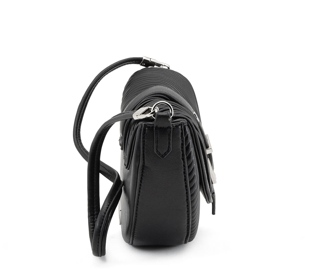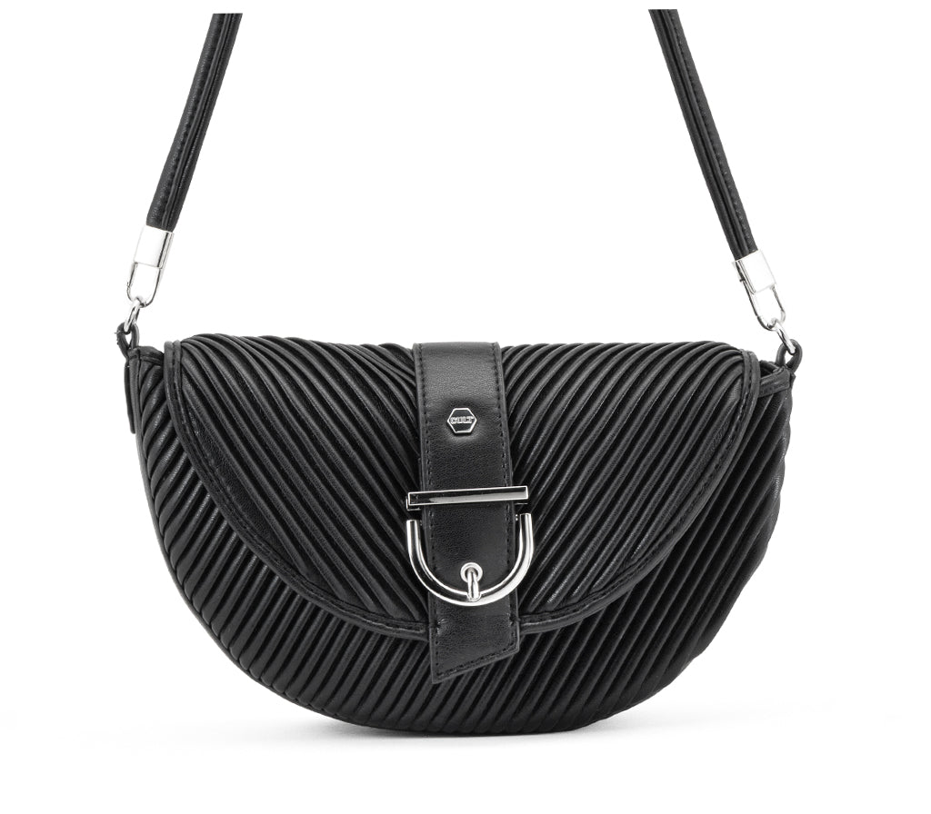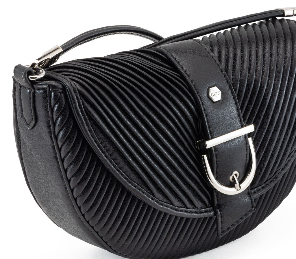 conica e dinamica, la borsa a tracolla Turner per la stagione SS26 si distingue per la sua silhouette a sella e la distintiva texture a micro-nervature orizzontali in ecopelle nera. Il design è impreziosito da una patta frontale con una vistosa fibbia metallica decorativa in finitura silver e dall'immancabile placca logo laterale. Dotata di una tracolla regolabile e rimovibile, questa borsa fonde un’estetica urban contemporanea a dettagli di ispirazione tecnica, rendendola l’accessorio cool perfetto per chi cerca uno stile deciso e originale. Dimensioni: 27x17x7