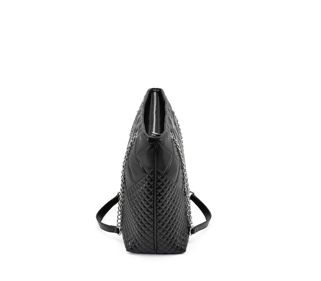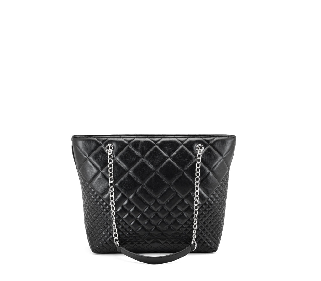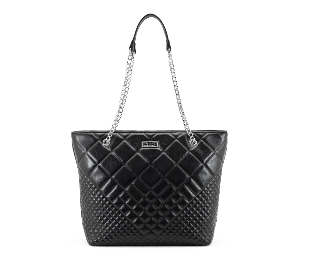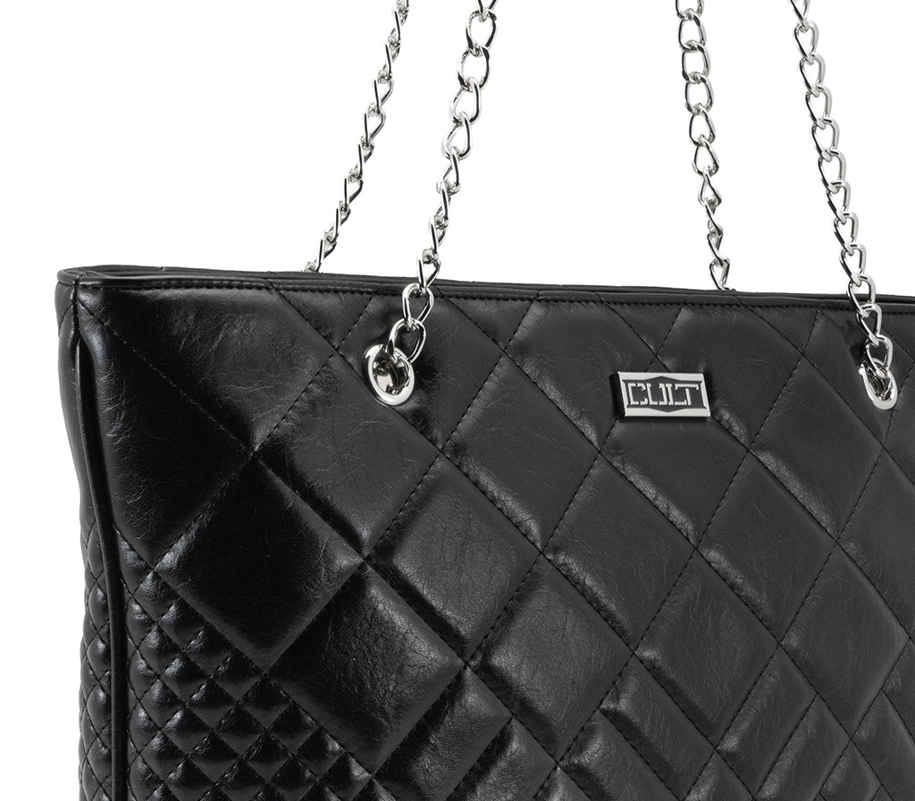 Grintosa, capiente e inarrestabile: la nuova shopping bag Harvey firmata Cult per la stagione SS26 eleva il concetto di borsa da giorno con un'attitudine puramente glam-rock. Realizzata in ecopelle nera con una raffinata lavorazione trapuntata a diamante, questa borsa è pensata per chi desidera unire l'eleganza di un design iconico a un'anima ribelle e contemporanea. La silhouette verticale e slanciata la rende l'alleata perfetta per affrontare la giungla urbana con stile. L'ampio scomparto principale, ideale per device e quotidiani, si unisce a manici a catena metallica intrecciata dal tocco industriale e all'iconica placca logo CULT argentata per un look decisamente cool. Dimensioni: 40x30x11,5.