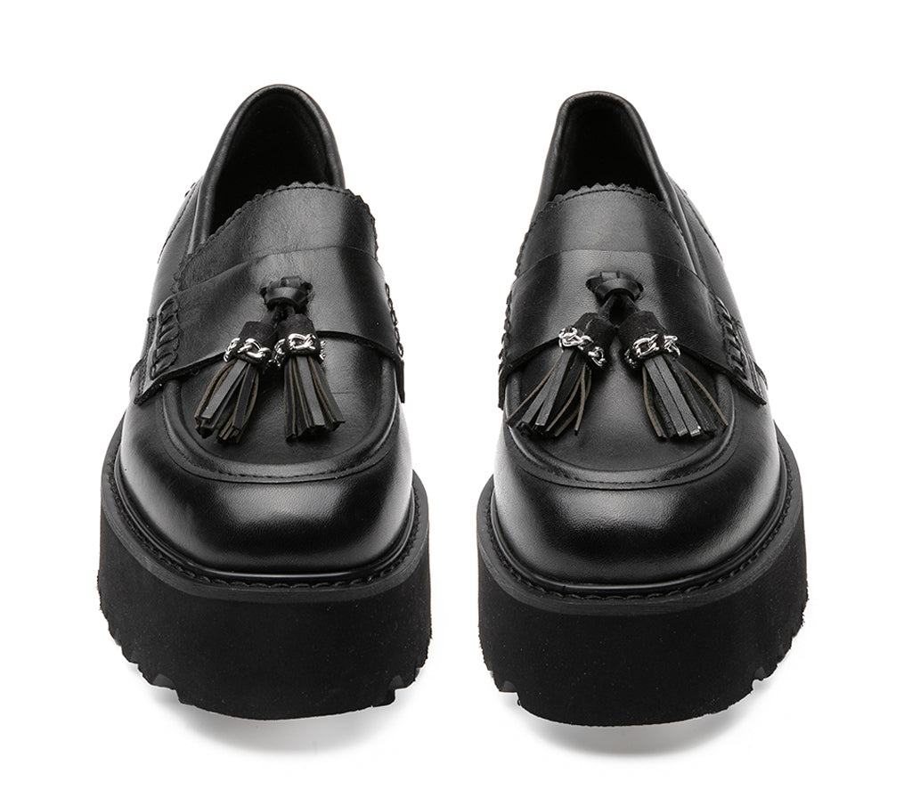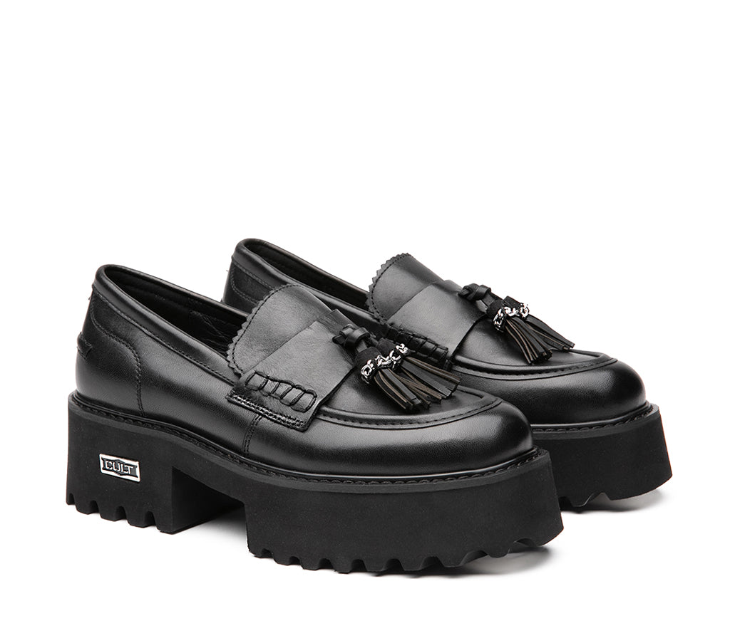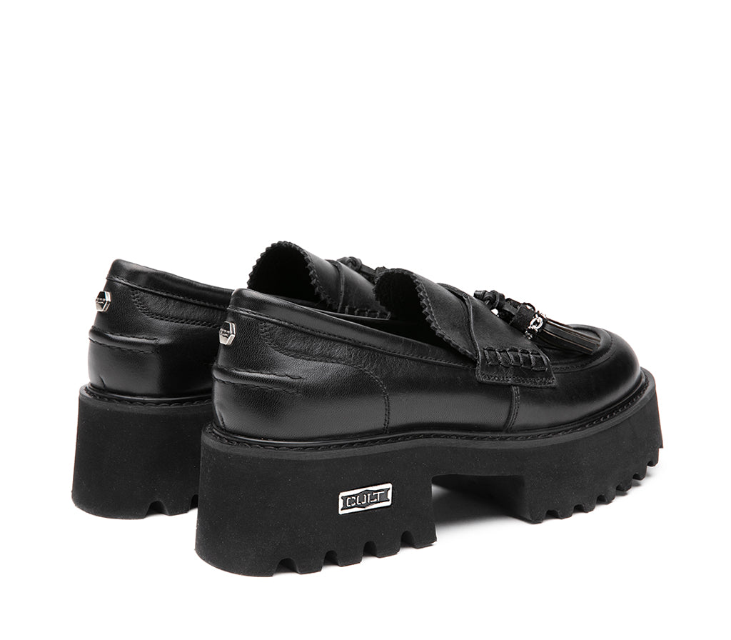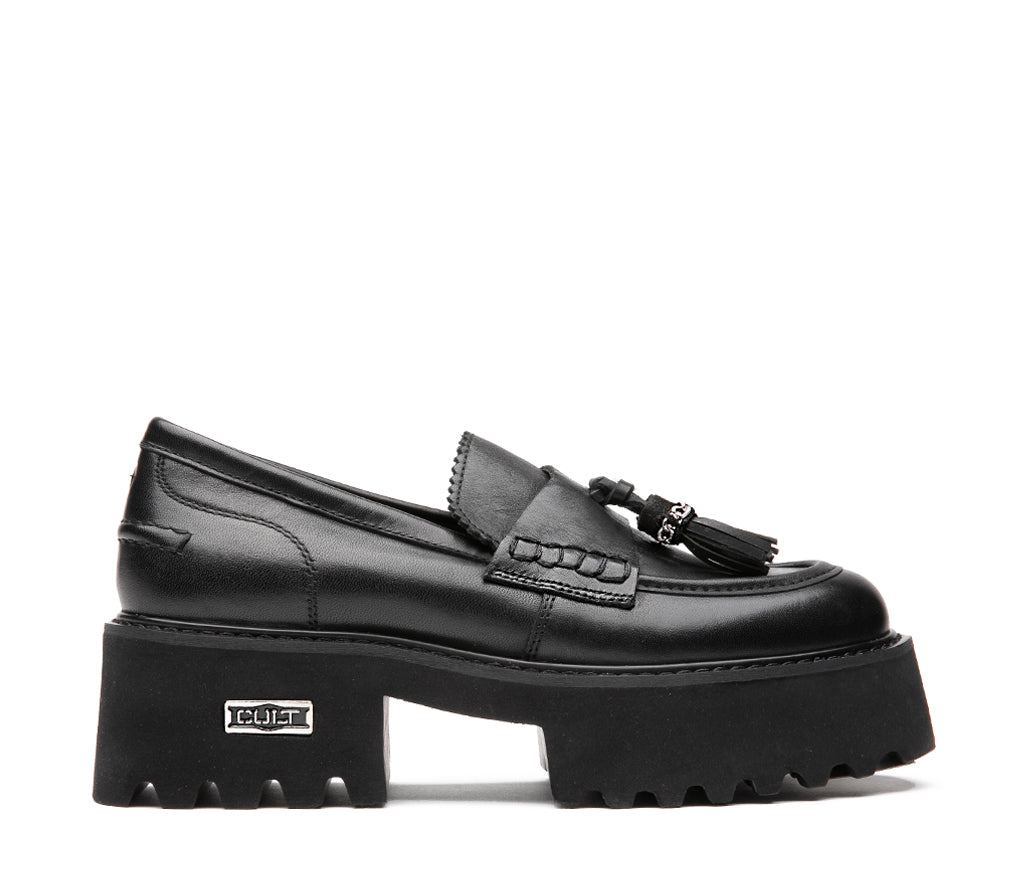 Classic rebel, the new moccasin from the CHER by CULT line breaks the mold with a traditional silhouette reinterpreted in an urban key. Made of black leather with a sculpted chunky sole, it combines the elegance of the gusset with the grit of the metal chain. The iconic detail? The CULT logo plate applied on the side sole, which gives uniqueness and recognizability. A shoe designed for those who want to stand out, even with a classic touch. 5 cm heel height.