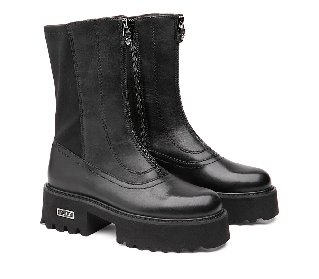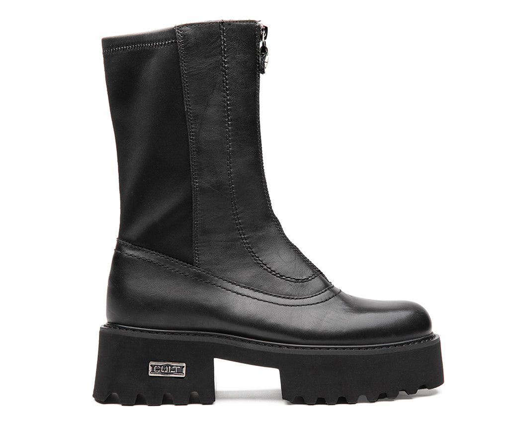 Be won over by the new ankle boot from the CHER line by Cult, a bold design that combines smooth leather and Lycra inserts for a snug fit. The side zipper lacing adds a contemporary and practical touch, while the front zipper finishes the silhouette, the chunky carrarmate-effect sole offers stability and personality. The metallic side logo signs each step with character. Ideal for those who love urban style with a rock soul. 5 cm heel height.