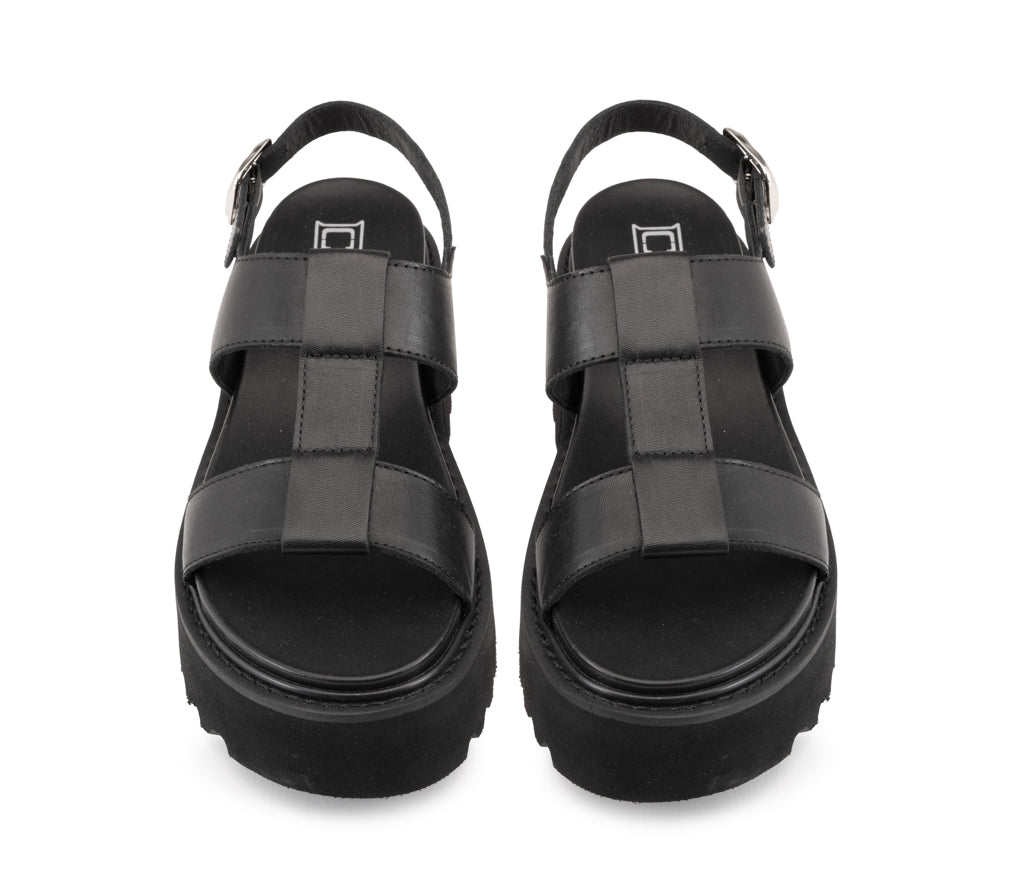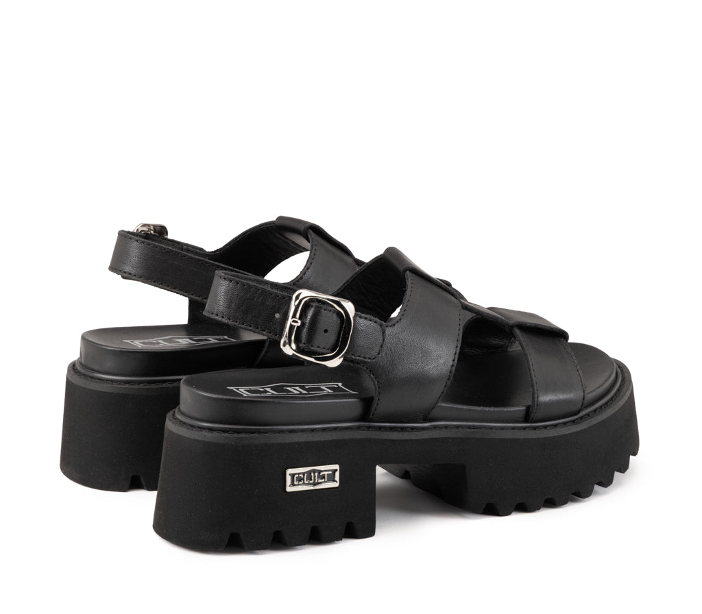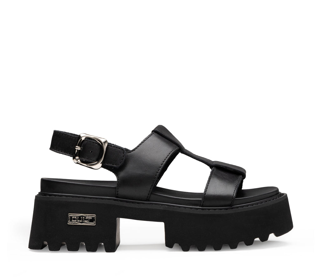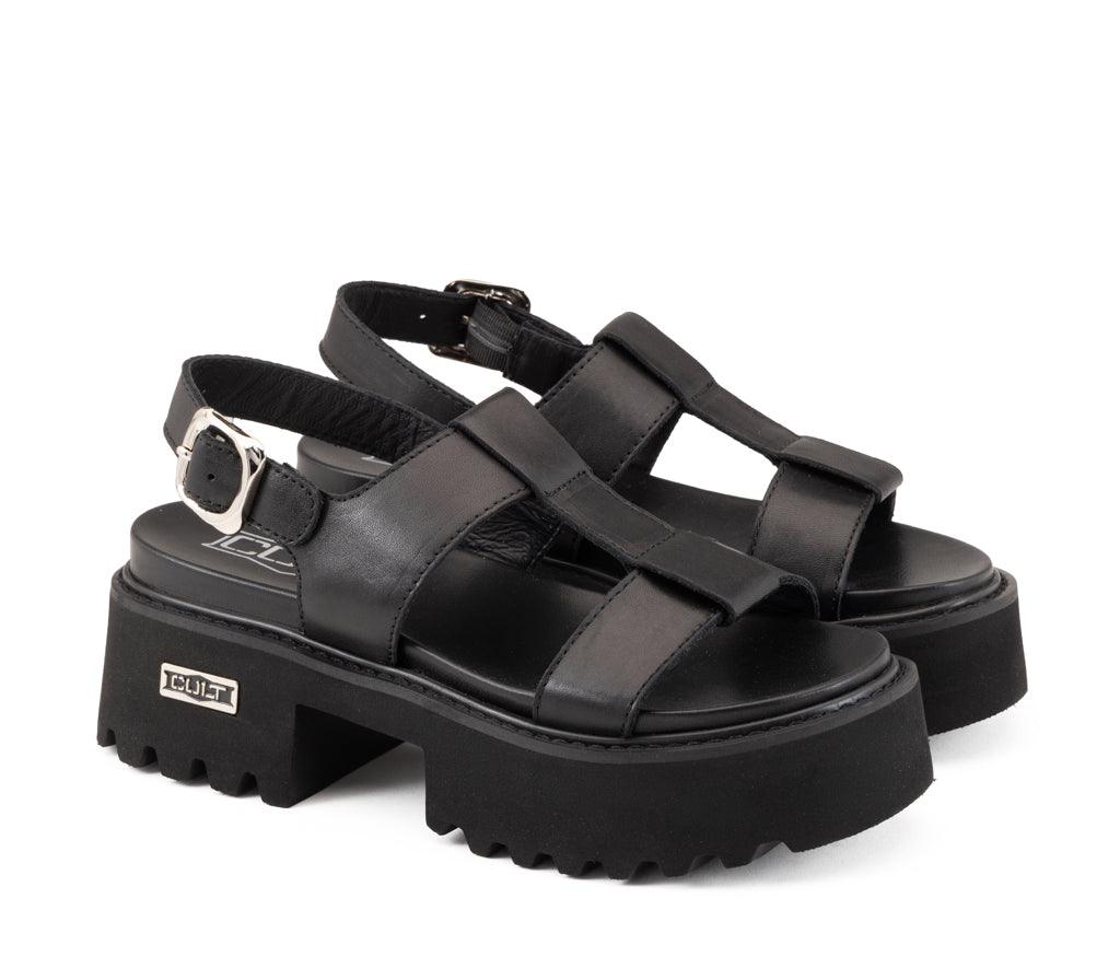 L'attitudine rebel di Cult si esprime con forza in questo sandalo platform dalla suola carrarmato ultra-grintosa. Le fasce in pelle nera, arricchite da una cinturino con fibbia metallica dal design industriale, rendono questa calzatura un pilastro del look glam-rock di stagione, ideale per chi cerca uno stile cool e d'impatto in ogni contesto urban.