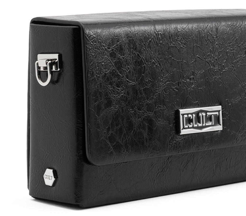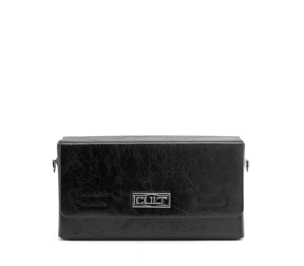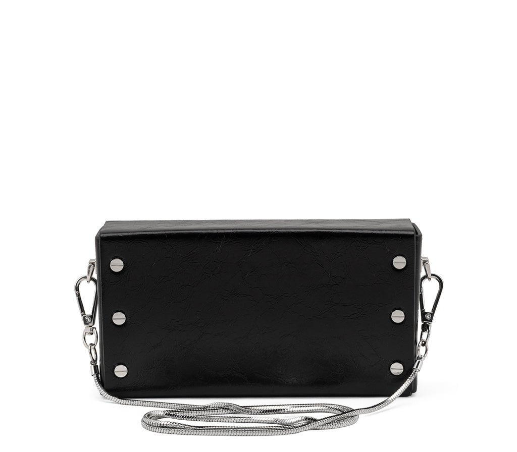 Design minimalista e carattere deciso: la clutch Lennox per la stagione SS26 è l'accessorio definitivo per un look serale dall'anima ribelle. Realizzata in ecopelle nera con una particolare texture effetto "crinkled", presenta una silhouette squadrata e compatta. L'iconica placca logo argentata e la sottile tracolla a catena removibile la rendono un pezzo cool e versatile, perfetto per chi cerca uno stile audace e senza compromessi. Dimensioni: 19x10x5