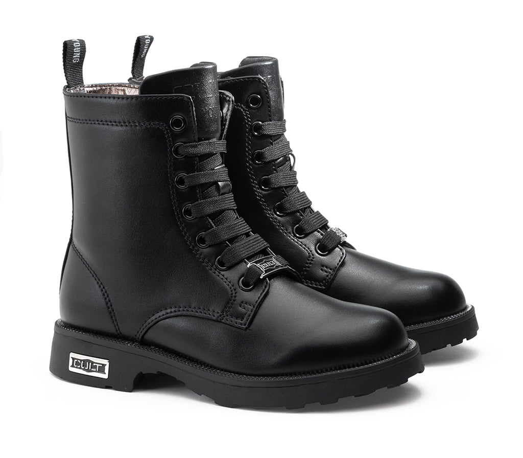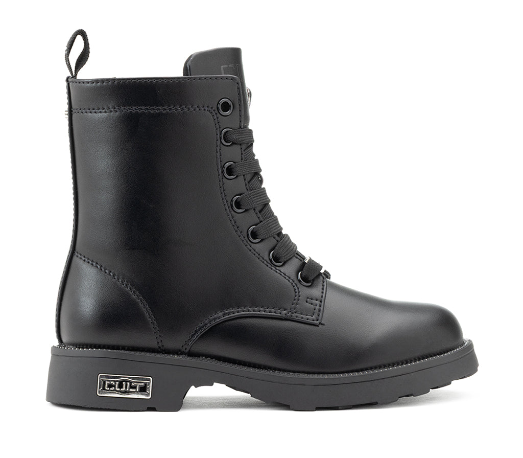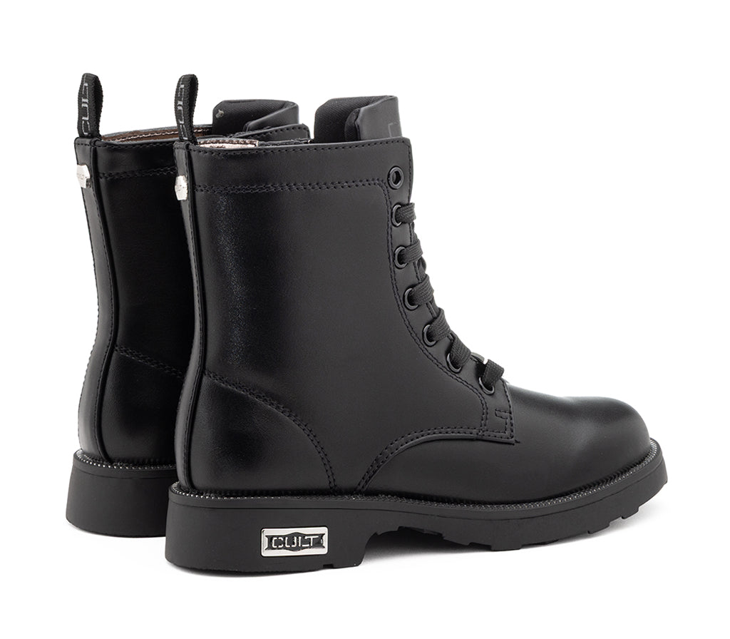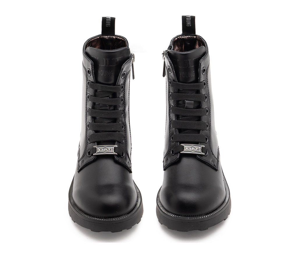 Gritty and charming, these Cult Kids faux leather boots are perfect for adding a unique touch to your little girl's look. The tall design, inspired by the classic amphibian, is embellished with two rows of heart-shaped studs, which give a sweet and rock touch. The lace-up closure and practical side zipper ensure a secure and fast fit. The rugged, non-slip carrarmato sole is decorated with a row of small studs on the edge and a Cult logo tag that completes the bold style.