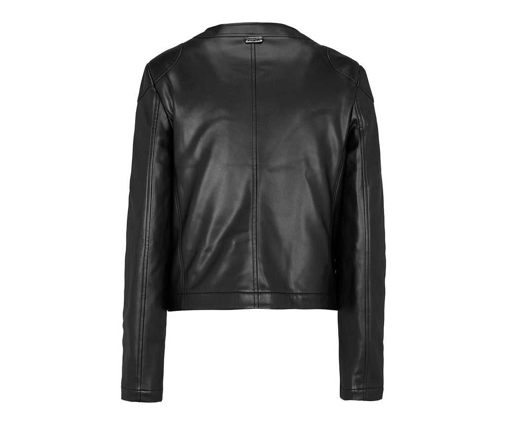 Elegant and essential lines for this faux leather jacket with a boxy silhouette. The bold and sophisticated, structured and slightly cropped garment is defined by a round neck and snap button closure. The logo completes the distinctive design with an iconic touch.