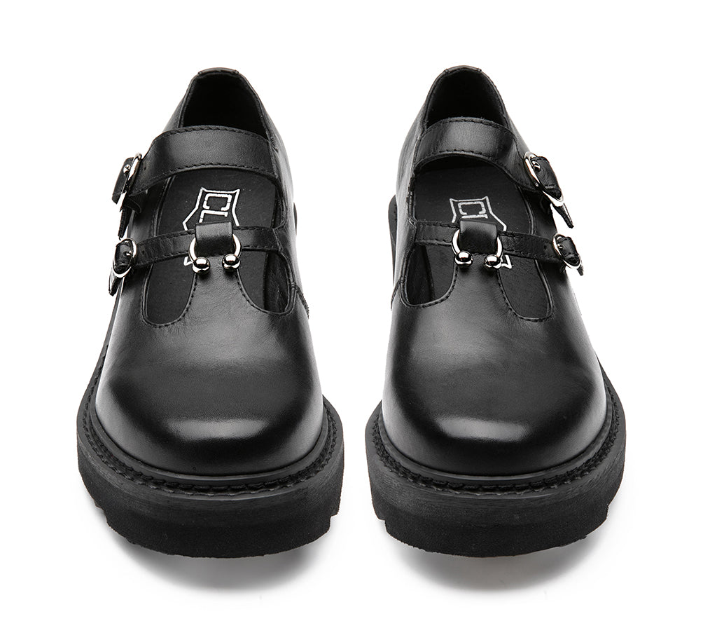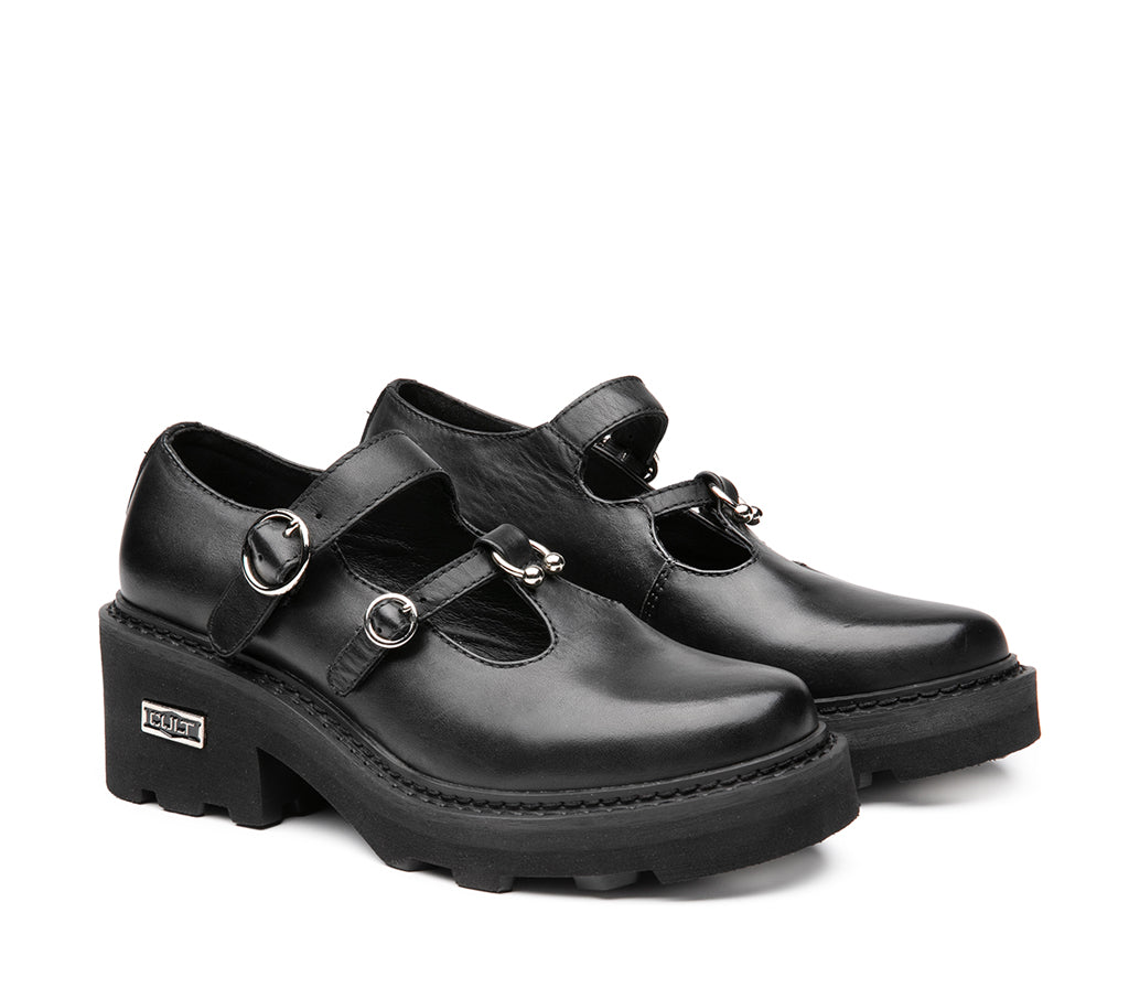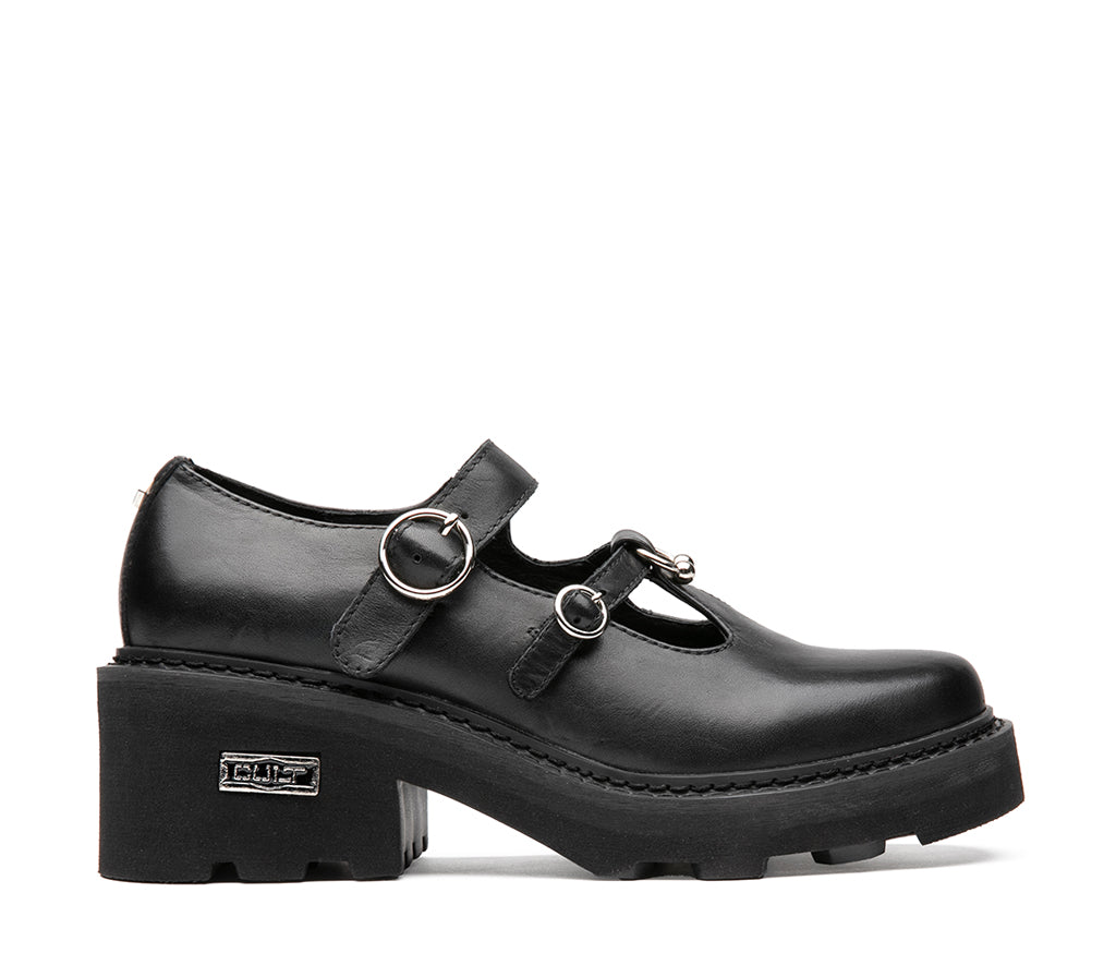 Rebel Mary Jane with chunky platform: this new GRACE by Cult model reinvents the classic Mary Jane in a bold, alternative key. The glossy black leather upper is enhanced by two straps with silver metal buckles and piercings, which give grit and definition. The real star is the chunky platform bottom: massive, sculpted, with firm grip and urban soul. On the side stands out the metallic CULT logo, stylishly signing the silhouette. The rounded toe design balances sturdiness and femininity. 5 cm heel height.