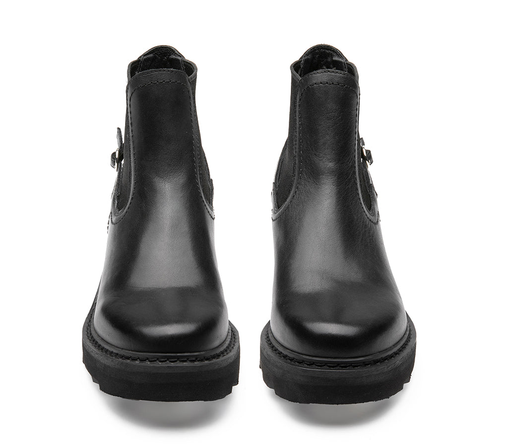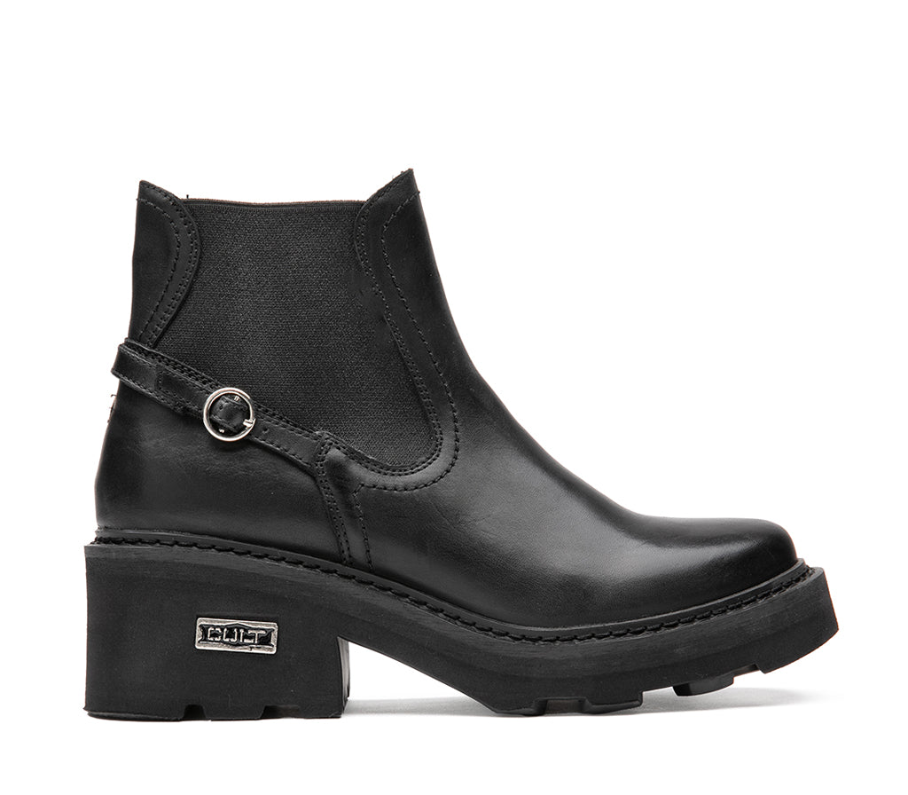 Strong character for this new CULT signed Beatle from the GRACE line in black leather with sculpted platform bottom for maximum visual impact and urban grip. The decorative strap with round metal buckle on the side gives a rock touch, while the "CULT" logo engraved on the metal plate seals the model with style. The chunky heel and sole construction make these ankle boots perfect for bold outfits and personalities who want to stand out. 5 cm heel height.
