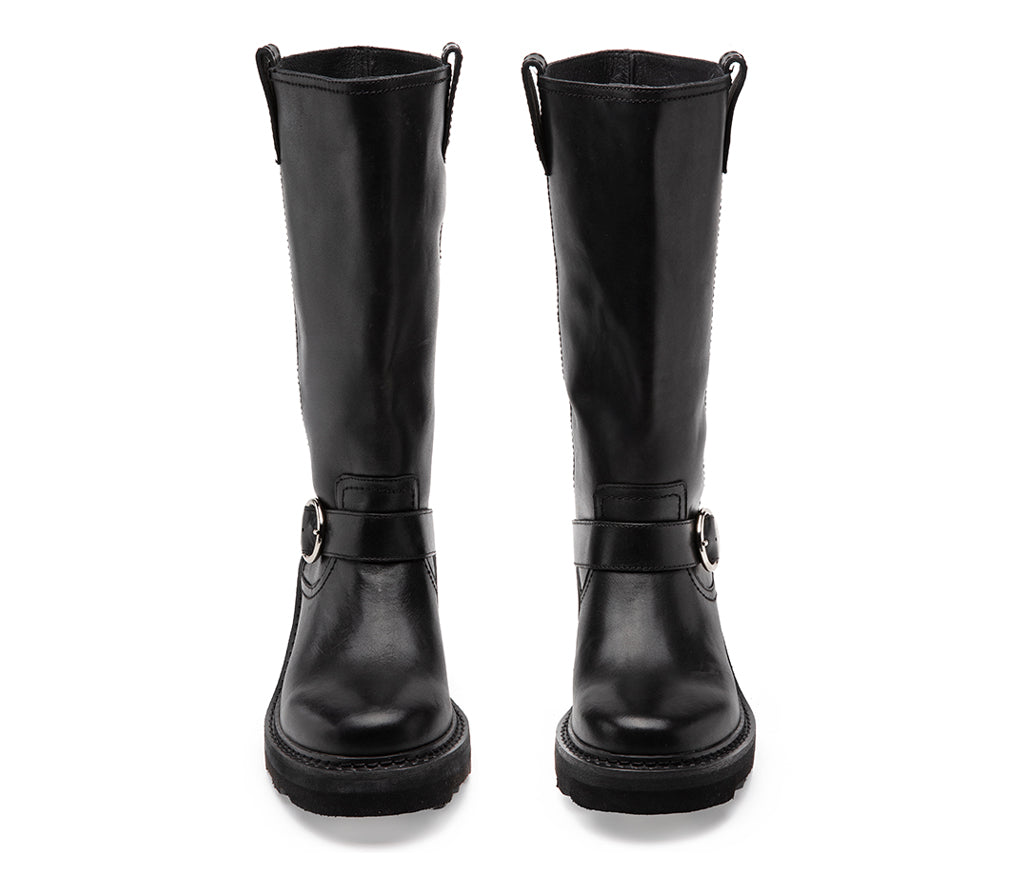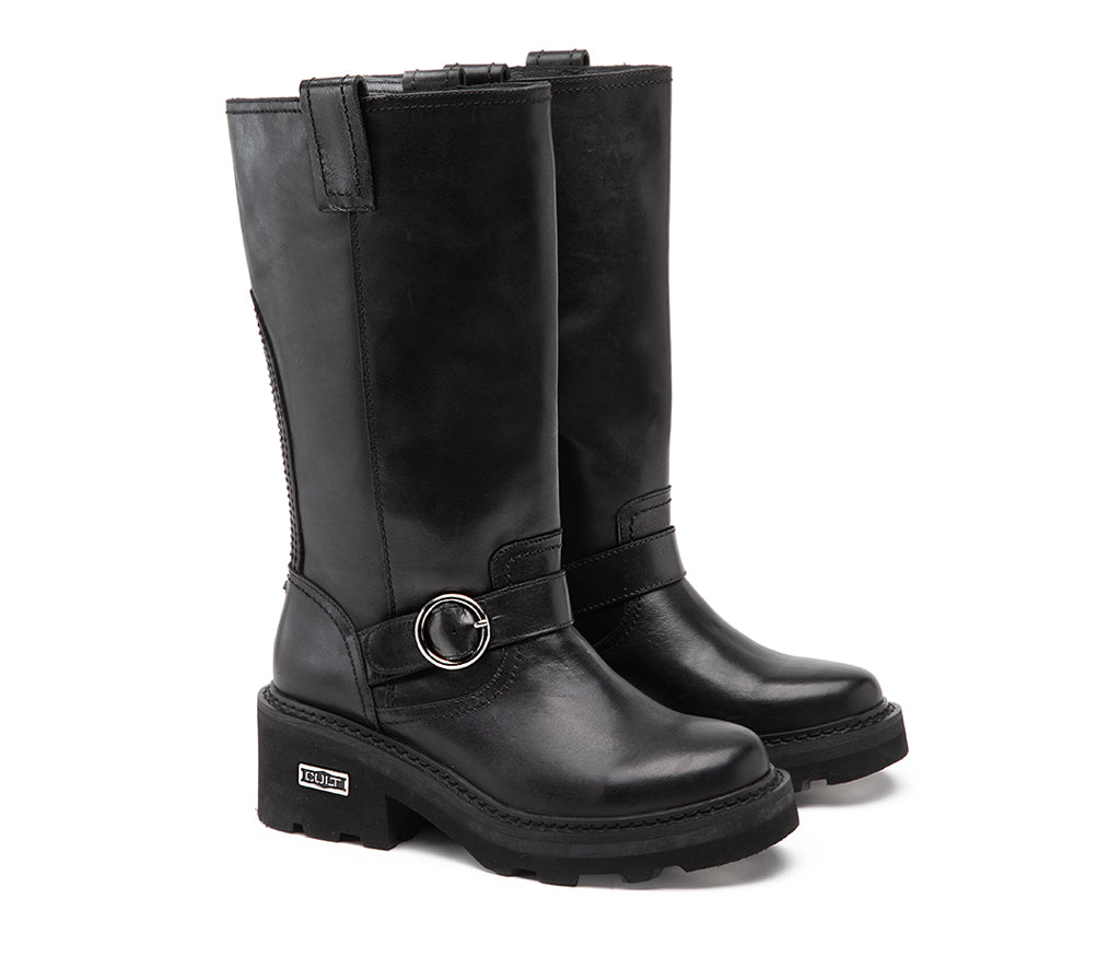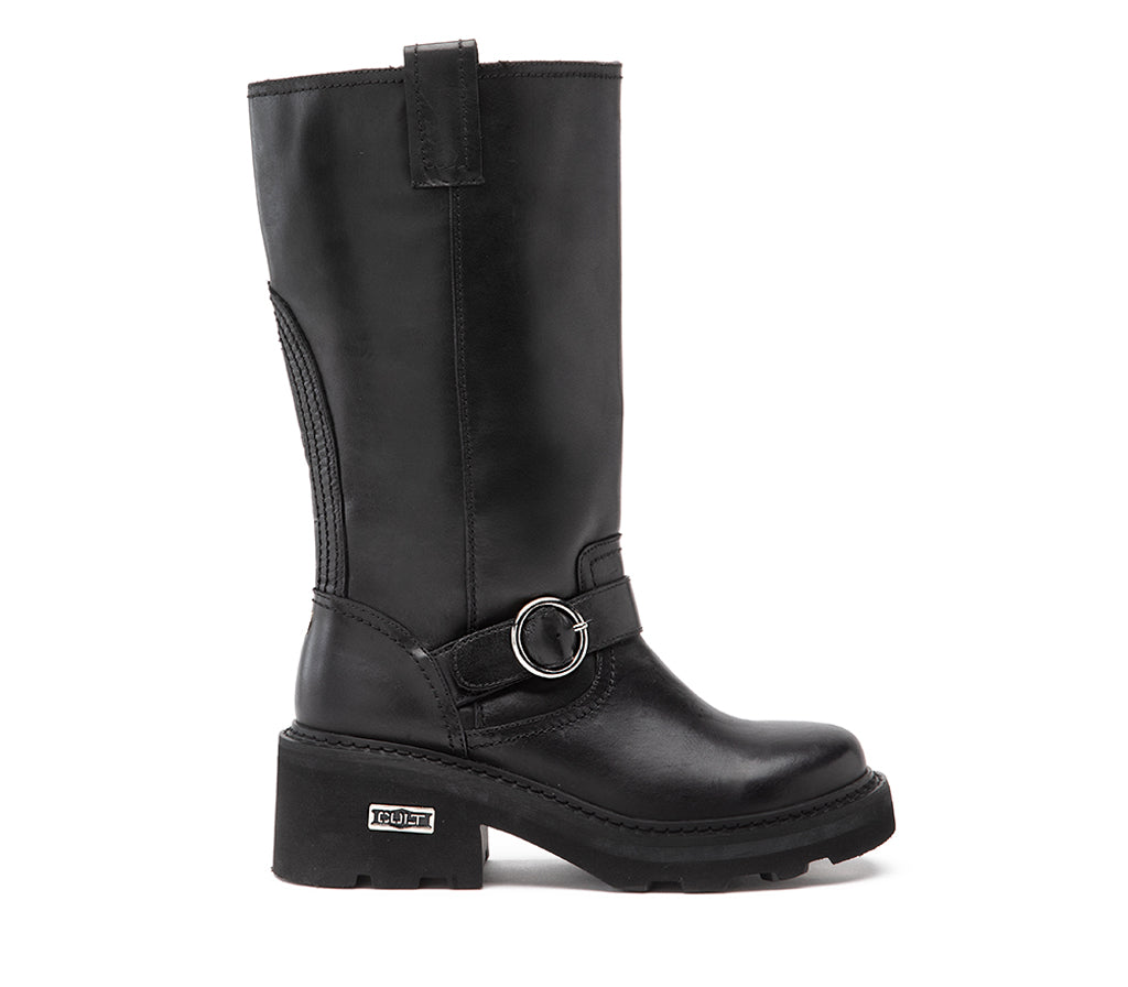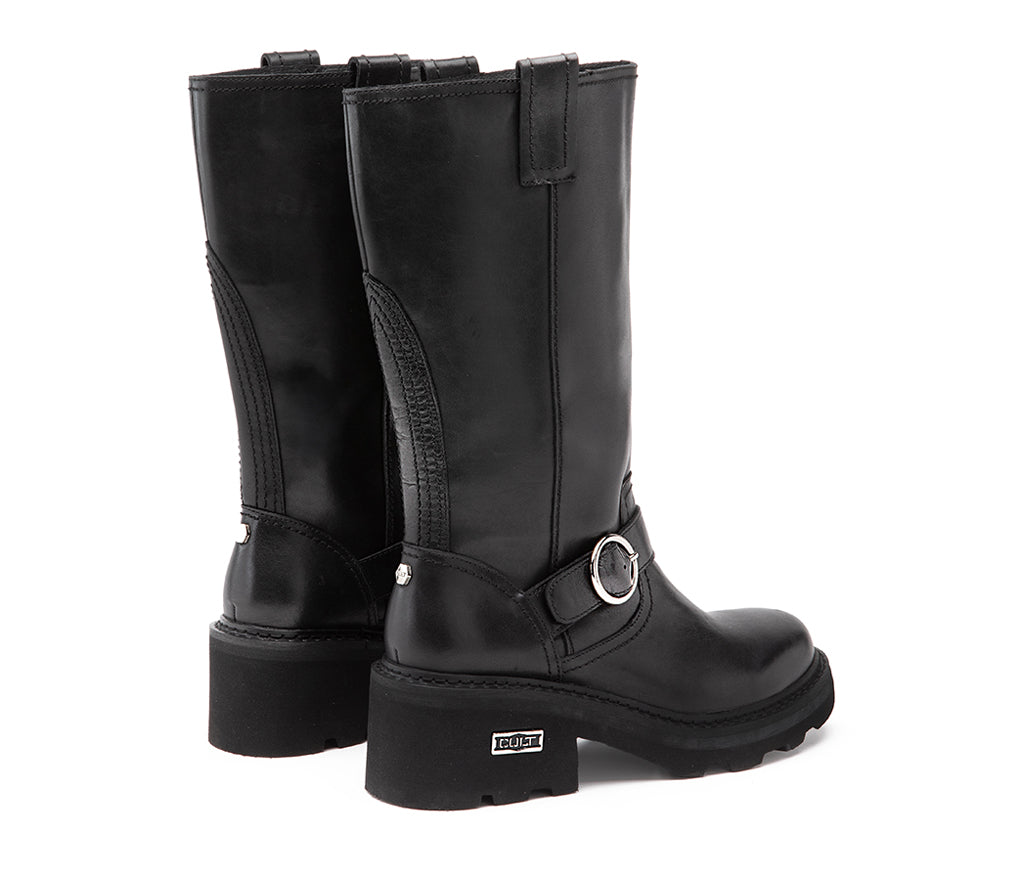 Rebel elegance with a fashion soul for this mid-calf ankle boot by CULT. It features a rugged construction, perfect for an urban-chic attitude: black leather upper, knurled sole and chunky heel to take on the city in style. The decorative strap with round silver buckle and CULT metal plaque on the heel add grit and recognition to the design. Ideal for edgy looks and for those who like to stand out. 5 cm heel height.