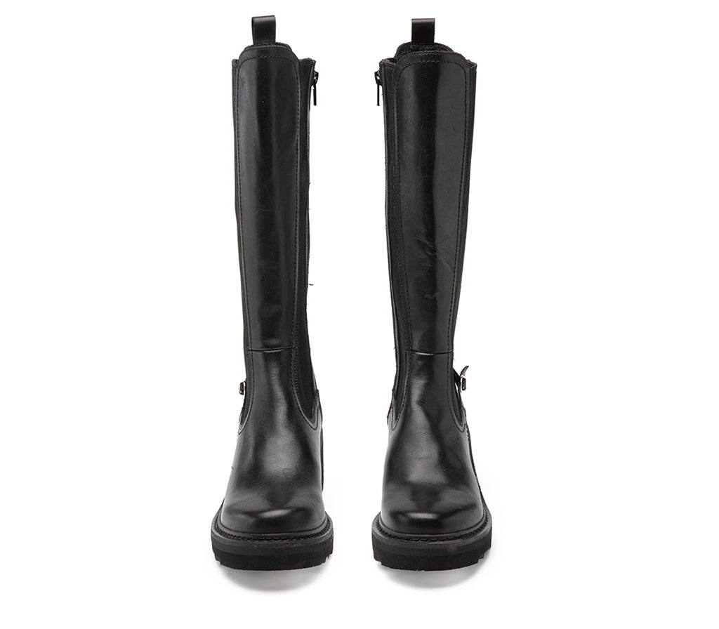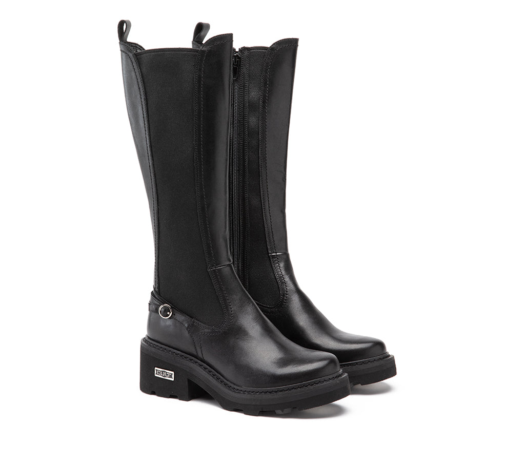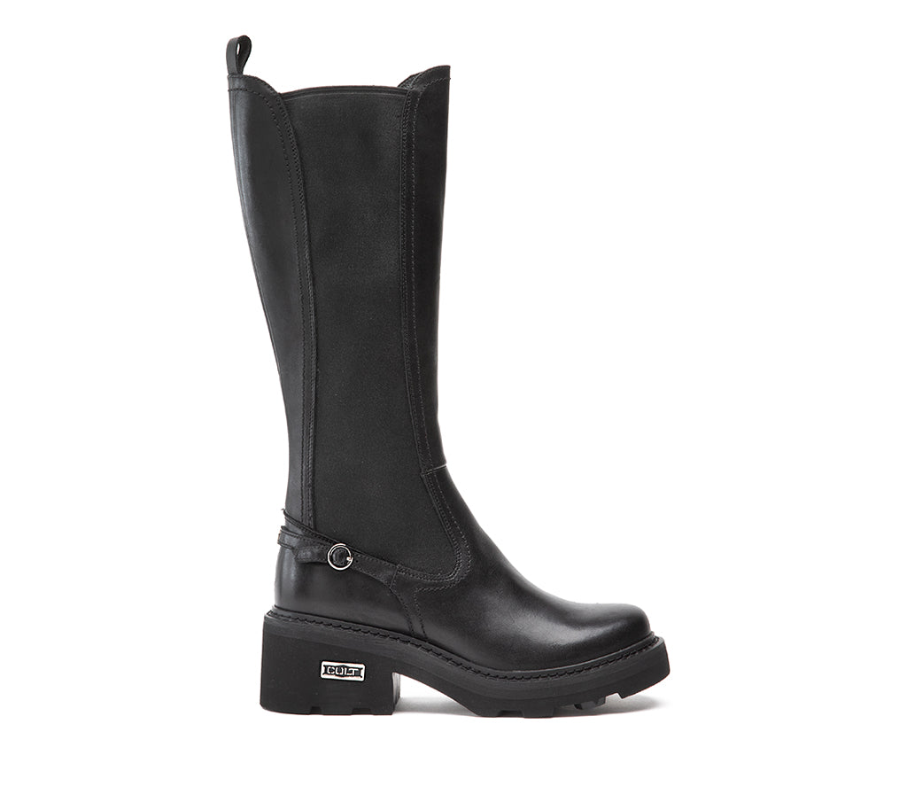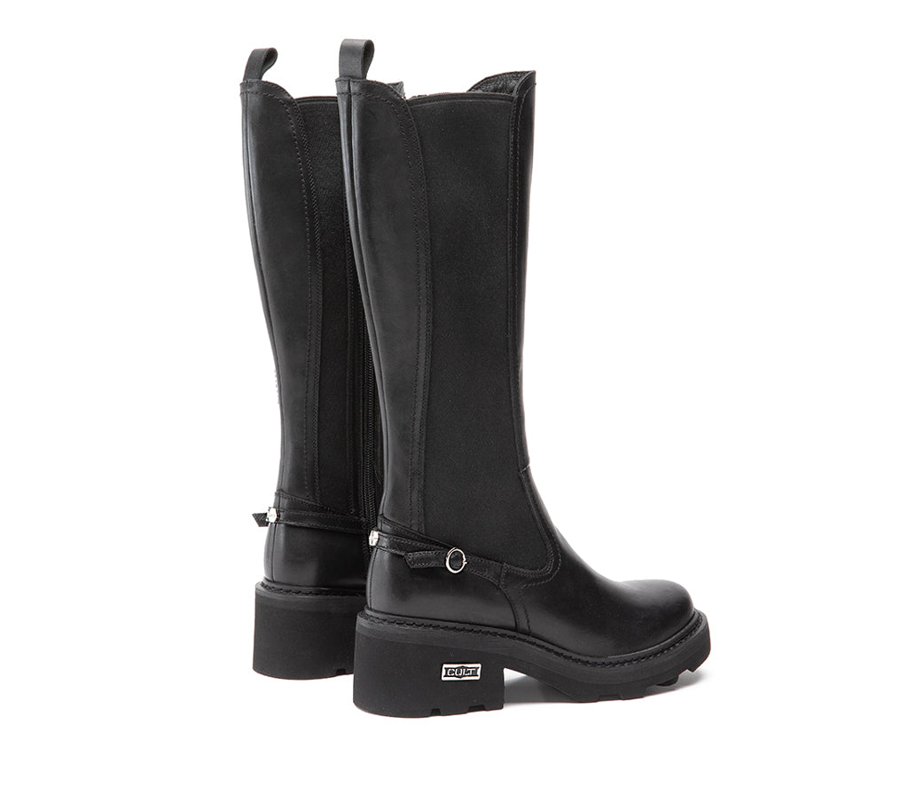 Rebel elegance with a fashion soul for this boot signed CULT. It features a rugged construction perfect for an urban-chic attitude: black leather upper, knurled sole and chunky heel to take on the city in style. The decorative strap with round silver buckle and CULT metal plaque on the heel add grit and recognition to the design. Ideal for edgy looks and for those who like to stand out. 5 cm heel height.
