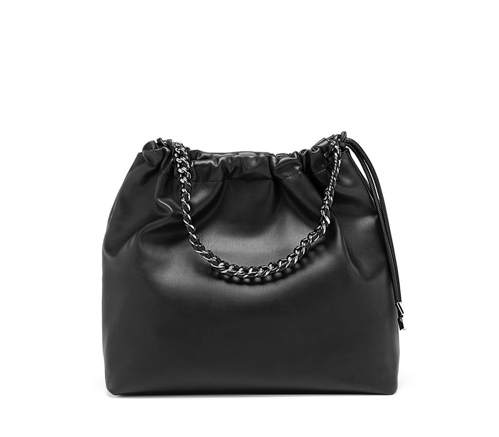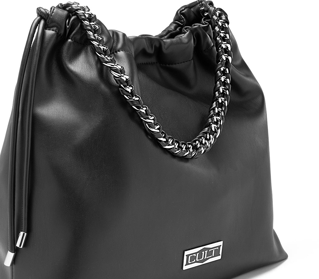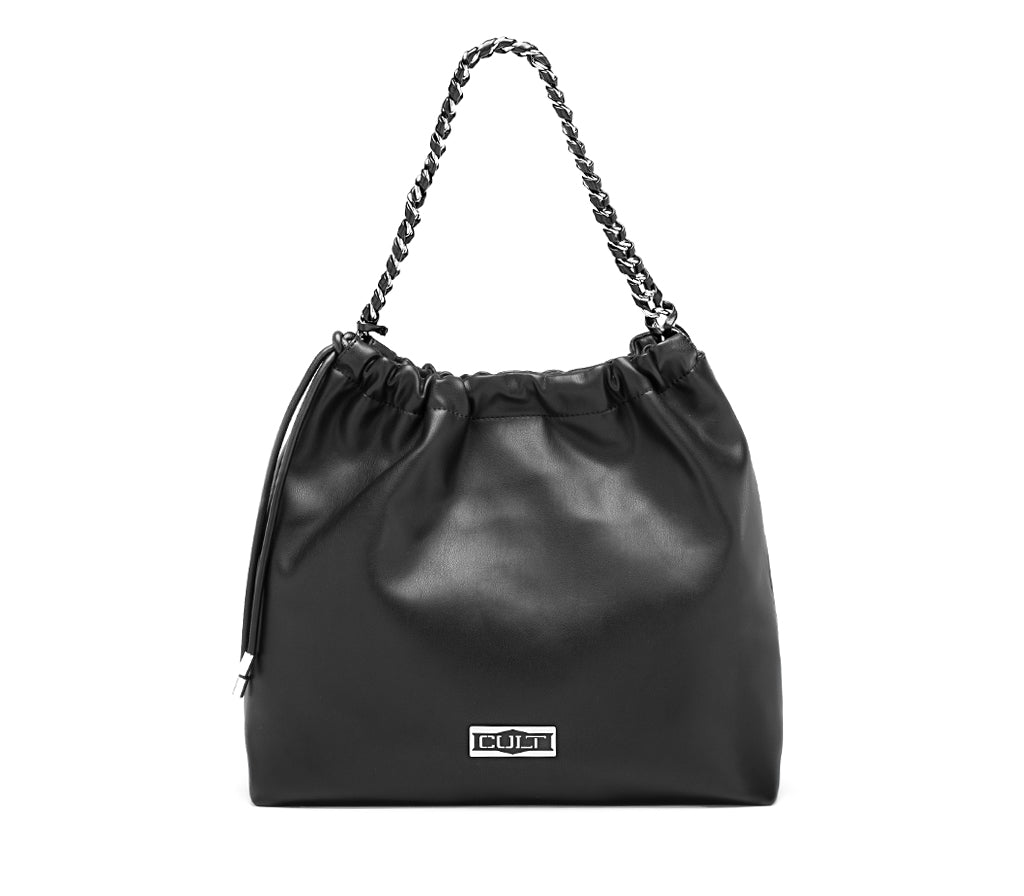 This black faux leather handbag combines clean lines and refined details. The rectangular silhouette with slightly rounded corners is enhanced by a chain handle and a metal logo plaque on the front. A versatile and chic accessory, perfect for completing both daytime and evening looks.
