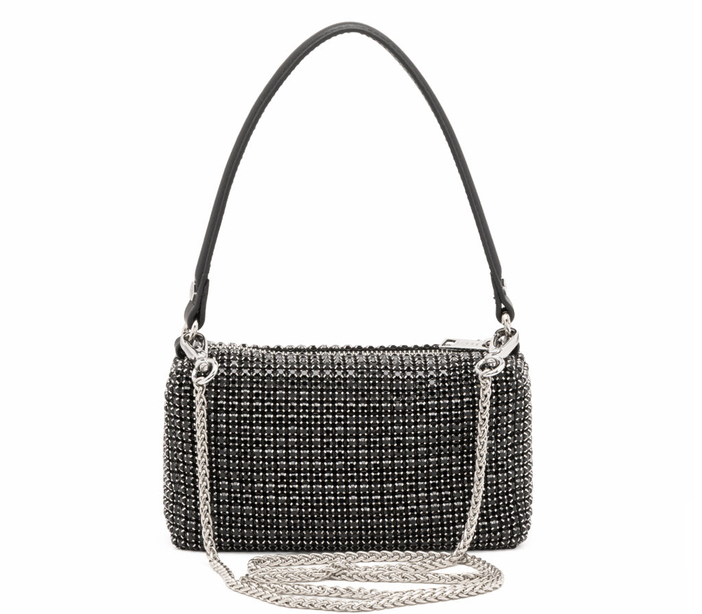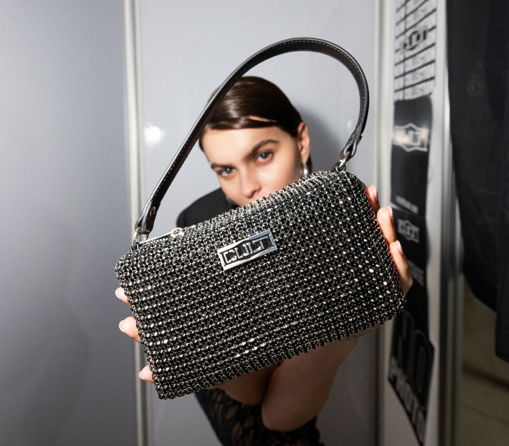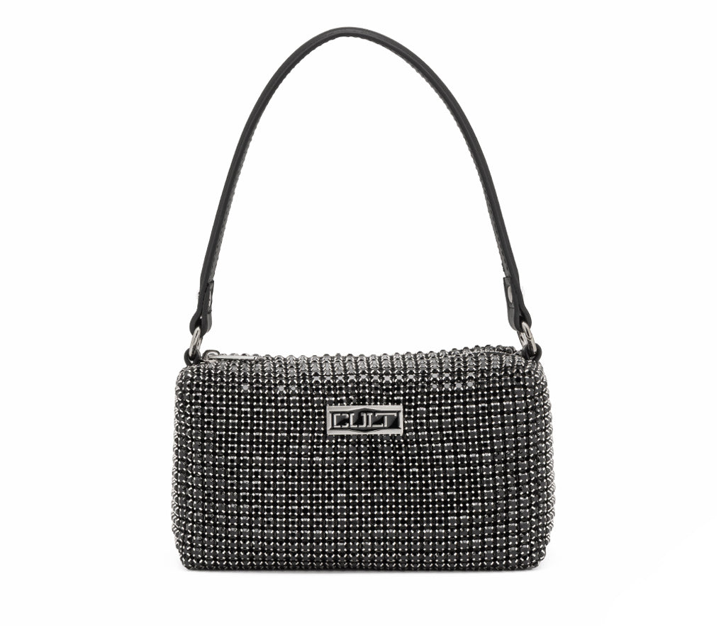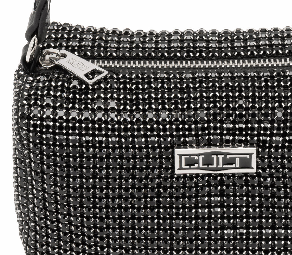 Eleganza scintillante e anima rock si fondono in questa nuova mini borsa gioiello modello Glam Rock realizzata da CULT per la stagione SS26. Una borsa preziosa concepita come un vero e proprio pezzo di gioielleria. La silhouette compatta e strutturata è interamente rivestita da una fitta trama di cristalli neri disposti orizzontalmente, che catturano la luce a ogni movimento. Dotata di un manico superiore in ecopelle nera e dell'immancabile placca logo argentata, questa borsa è l'accessorio definitivo per chi desidera un look da gran sera che non rinuncia all'attitudine grintosa del brand. Dimensioni: 18x10,5x7,5.