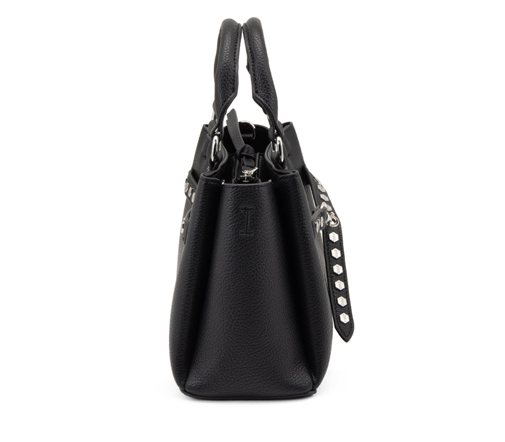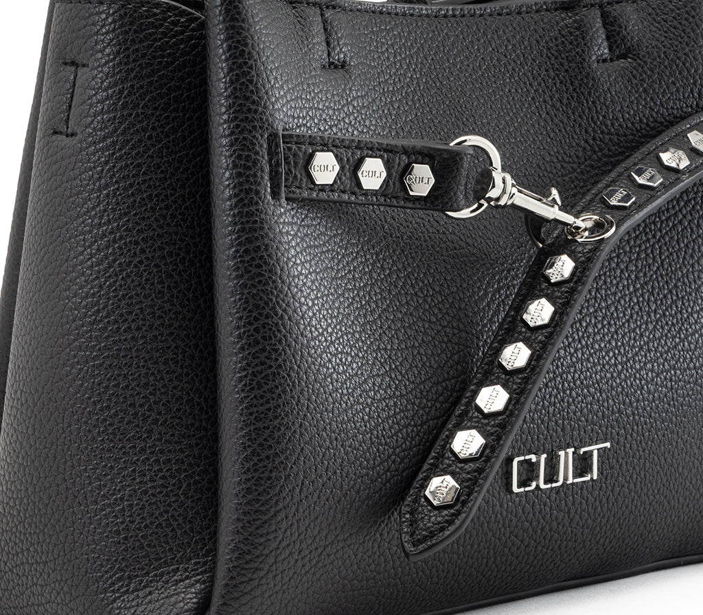 Rigore formale e dettagli di carattere si incontrano nella handbag Wilson per la stagione SS26, una borsa dalla silhouette verticale pensata per chi cerca un accessorio contemporaneo e sofisticato. Realizzata in ecopelle nera con grana naturale, si distingue per il design minimalista arricchito da un cinturino decorativo centrale con fibbia e piccole borchie silver che aggiungono un tocco grintoso. La struttura a soffietto e i doppi manici lunghi la rendono la scelta ideale per accompagnare con stile ogni impegno quotidiano. Dimensioni: 22x18,5x10,5