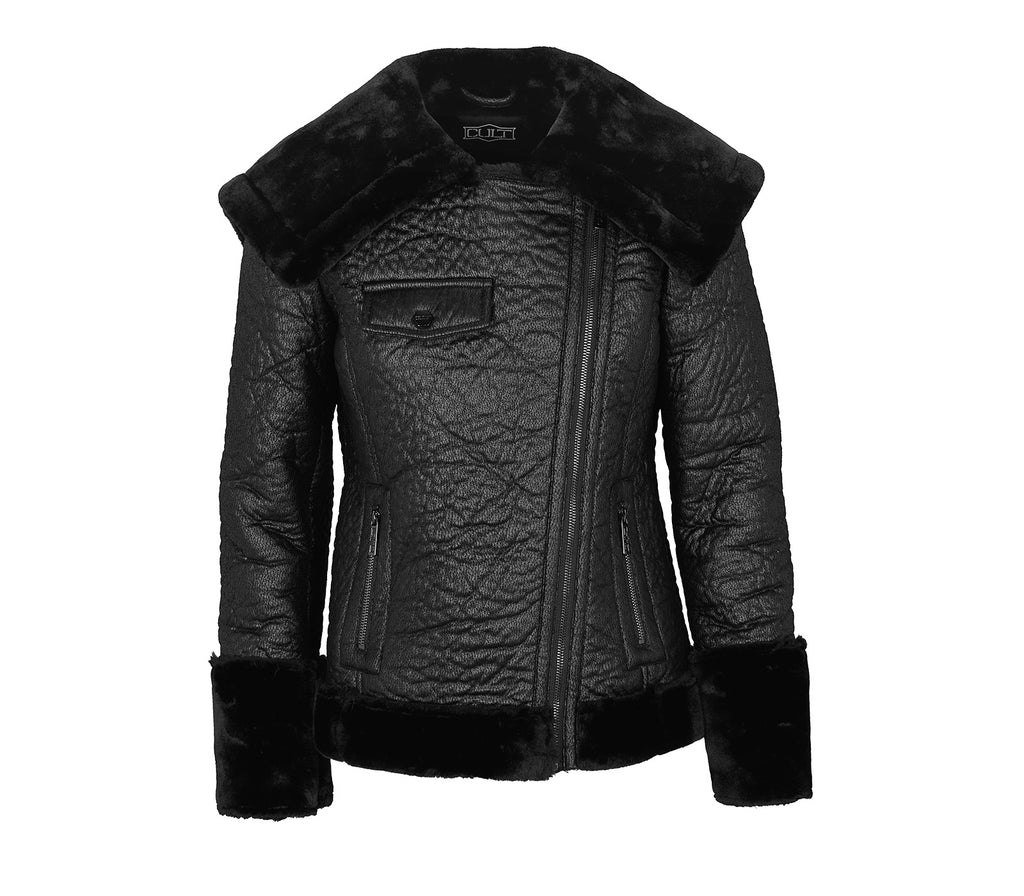 Glamorous and essential, this soft faux shearling aviator jacket won't go unnoticed. The wide shearling collar, cuffs and bottom provide warmth and comfort, while the asymmetrical zipper adds a touch of practicality. With two zippered side pockets, this jacket is a blend of functionality and design.