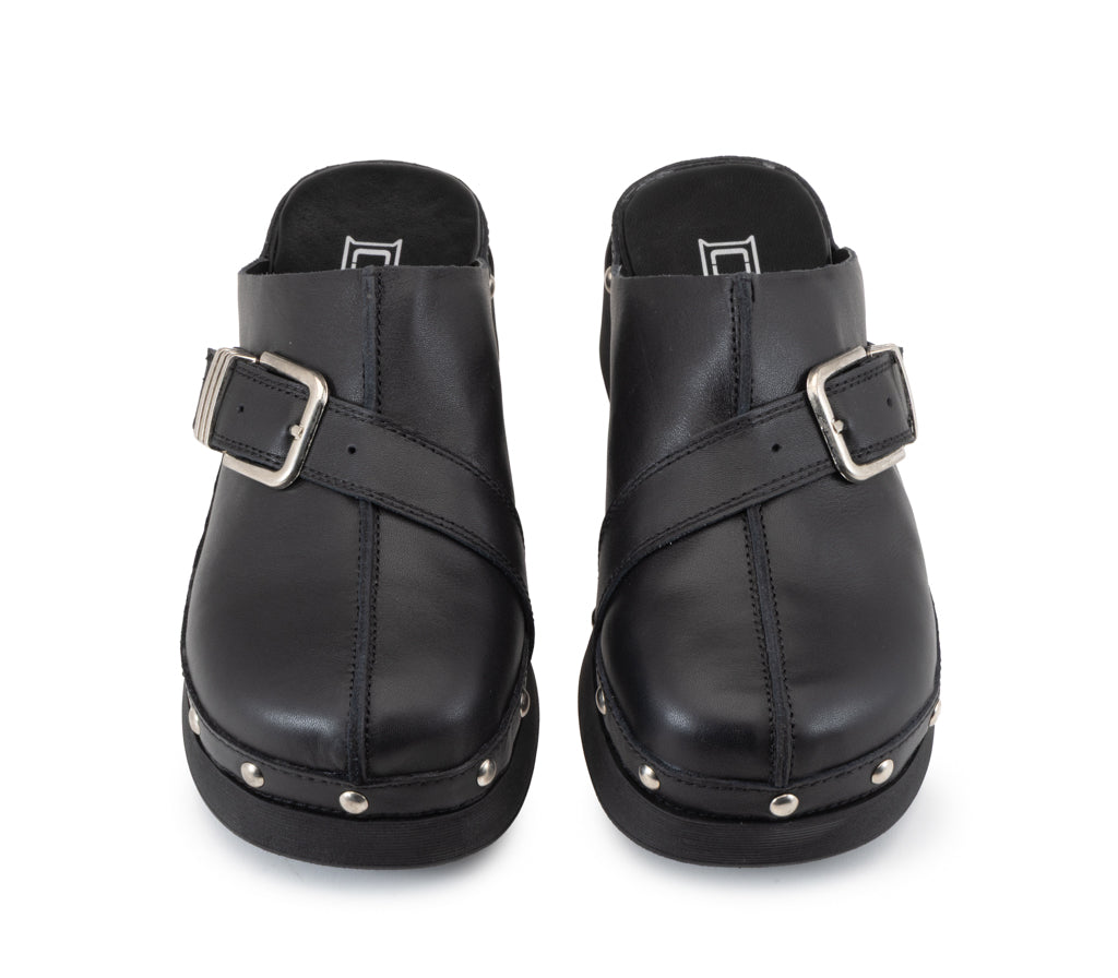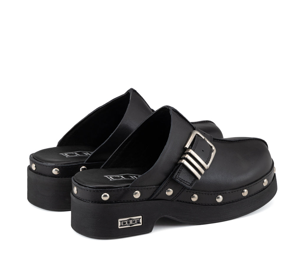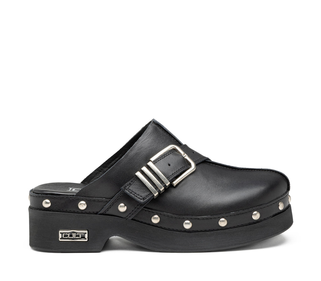 L'identità ribelle di Cult si manifesta nel nuovo modello clog in pelle nera, Muse, caratterizzato da una struttura solida e profili decorati con borchie metalliche. La maxi fibbia e il logo in rilievo sulla suola platform definiscono un look cool e glam-rock, ideale per chi desidera una calzatura di carattere per dominare la scena urbana.
