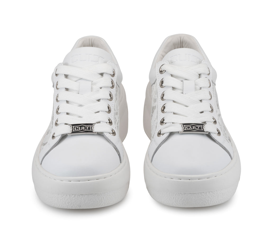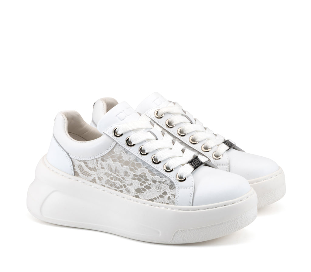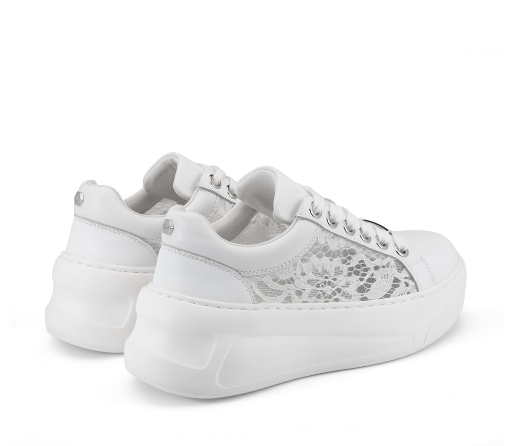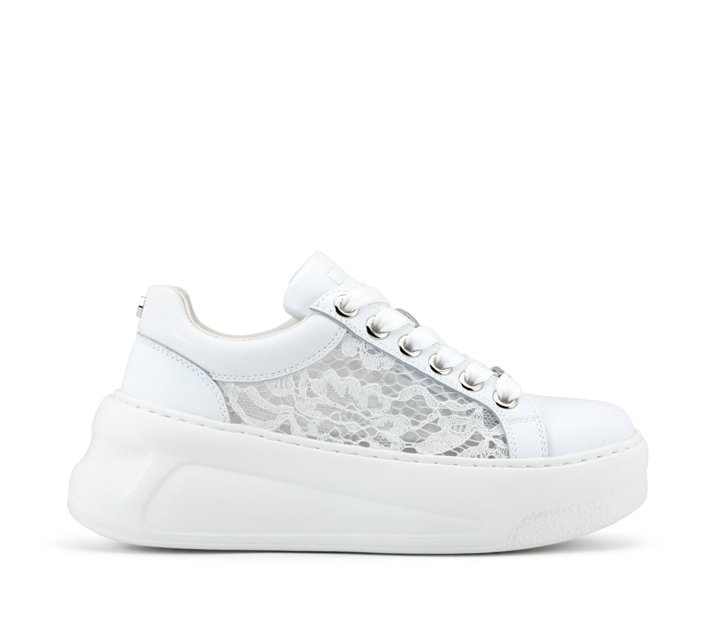 L’anima rock incontra l’eleganza del pizzo nella sneaker Nirvana: una texture romantica e traforata si fonde alla struttura in pelle total white. La maxi suola platform scultorea e gli occhielli metallici creano un contrasto audace, perfetto per chi vuole unire attitudine rebel e femminilità.