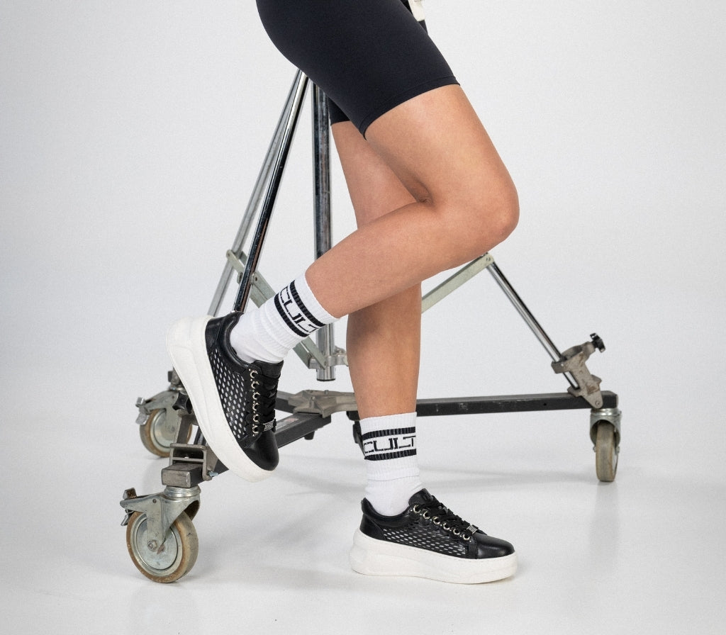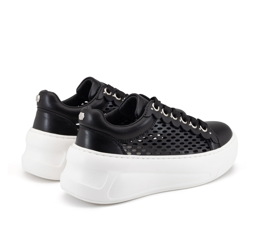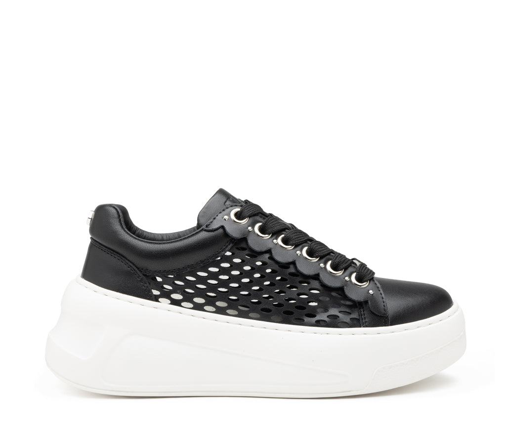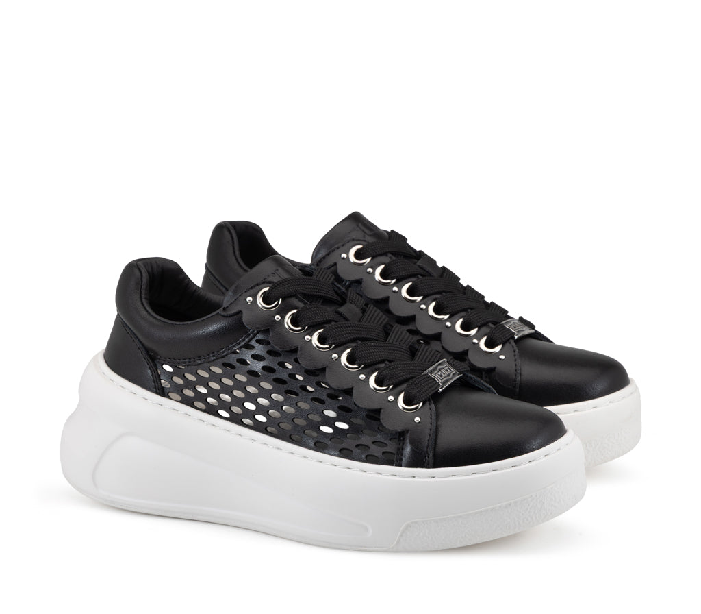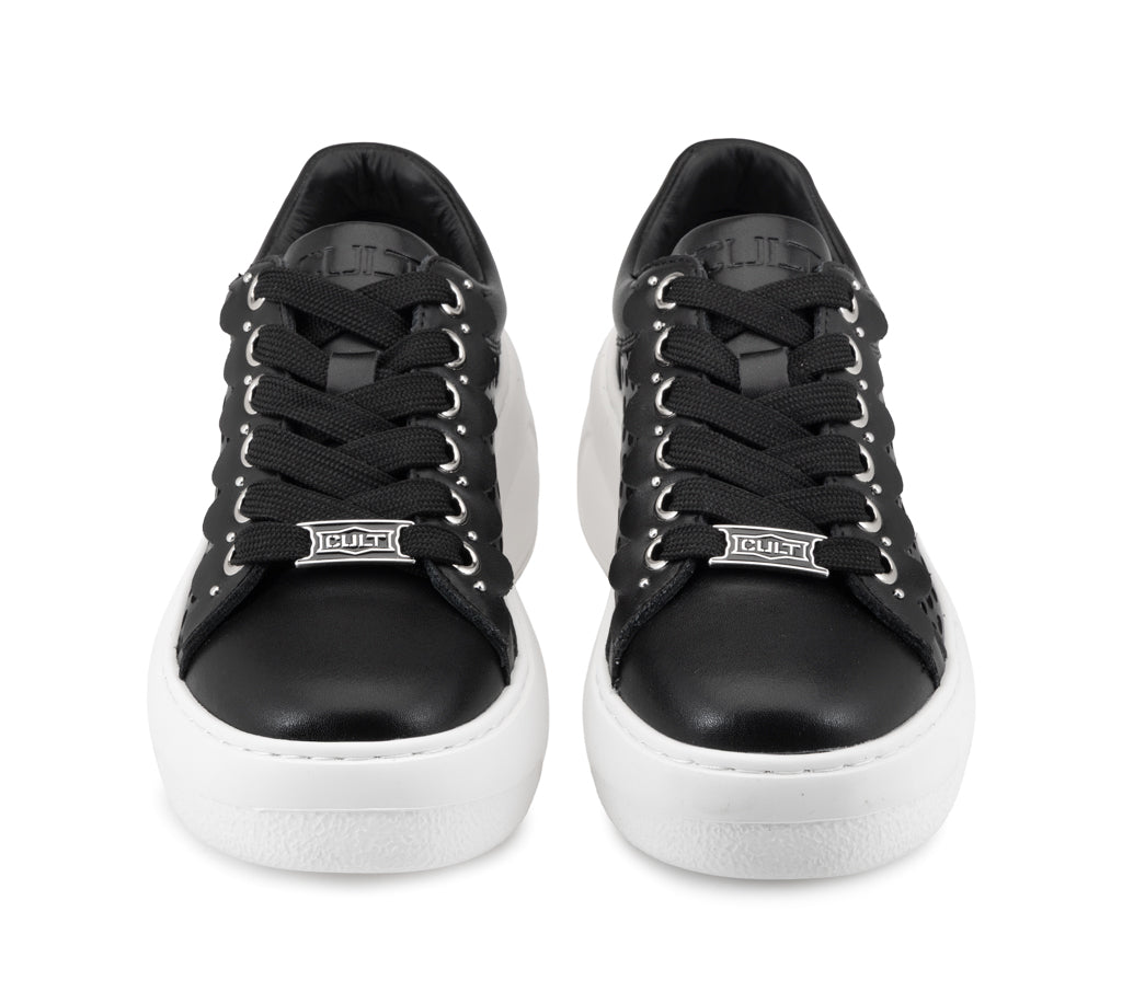La sneaker Nirvana definisce il nuovo codice glam rock di Cult con l'esclusivo pattern ovale laserato, fil rouge della collezione SS26. La tomaia in pelle nera, rifinita da bordi smerlati e borchie, poggia su un'audace suola platform scultorea. Un mix perfetto di leggerezza visiva e attitudine ribelle per non passare inosservata.