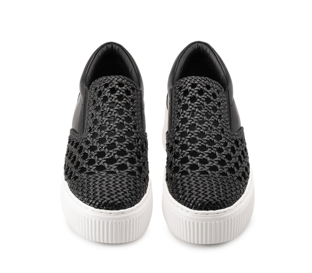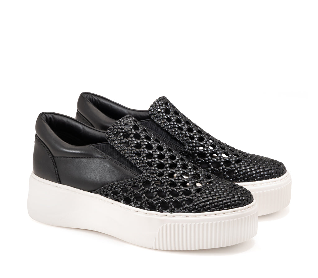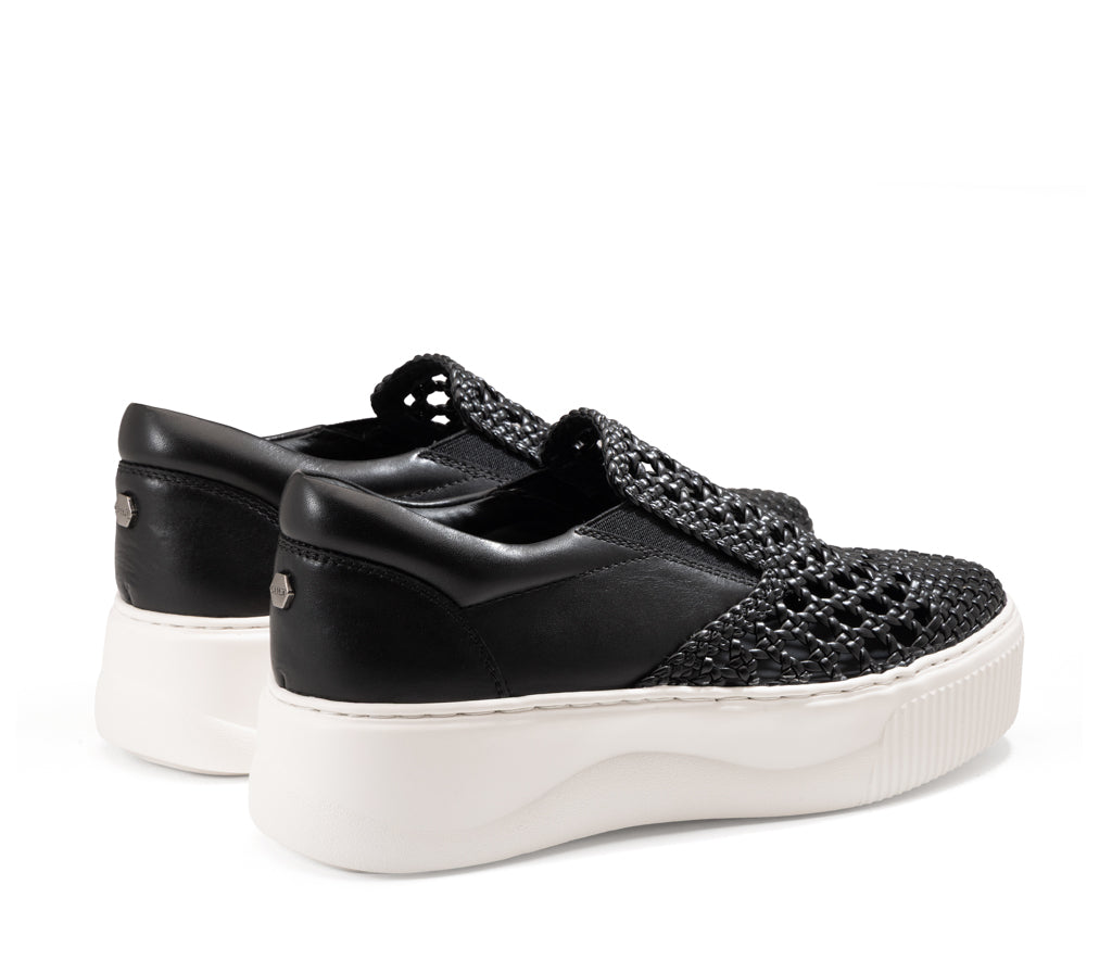 L’animo rock incontra il design d’avanguardia: questa slip-on unisce pelle e vegan leather in un gioco di intrecci audaci. Una silhouette indipendente rifinita dall’iconica maxi platform per un look glam senza compromessi.