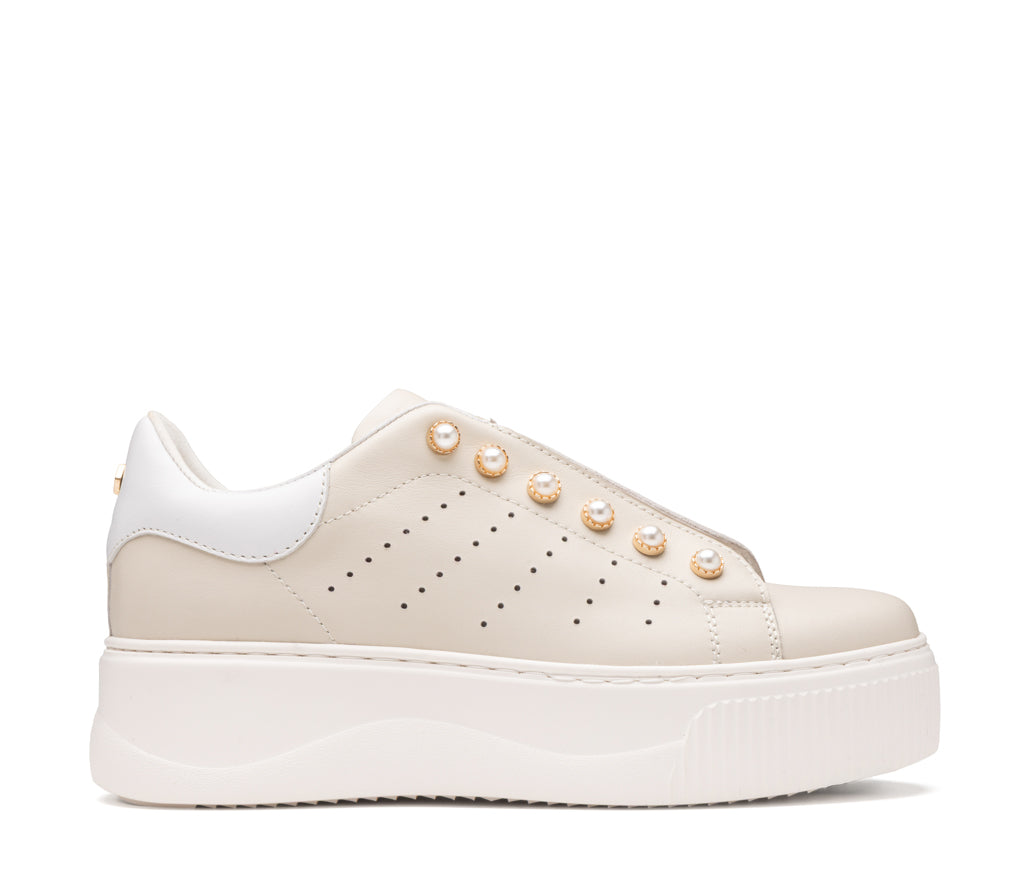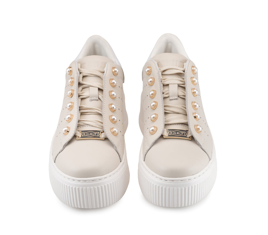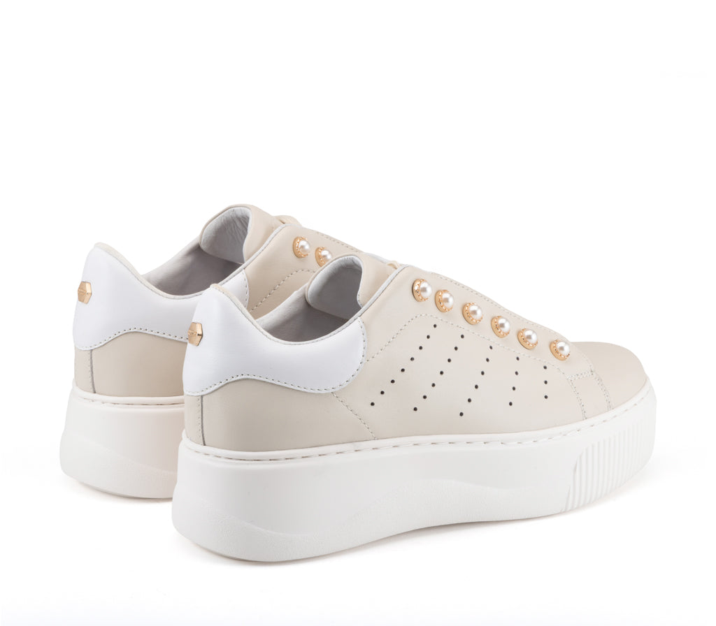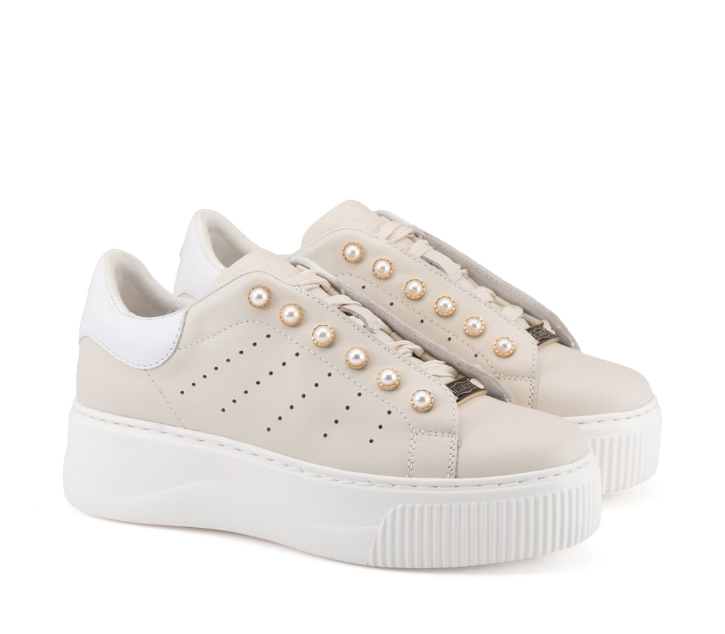 L'eleganza incontra la ribellione: questa sneaker in pelle ridefinisce lo stile glam-rock con dettagli di perle borchiate e una maxi platform decisa. Il perfetto equilibrio tra raffinatezza indipendente e attitudine urban.