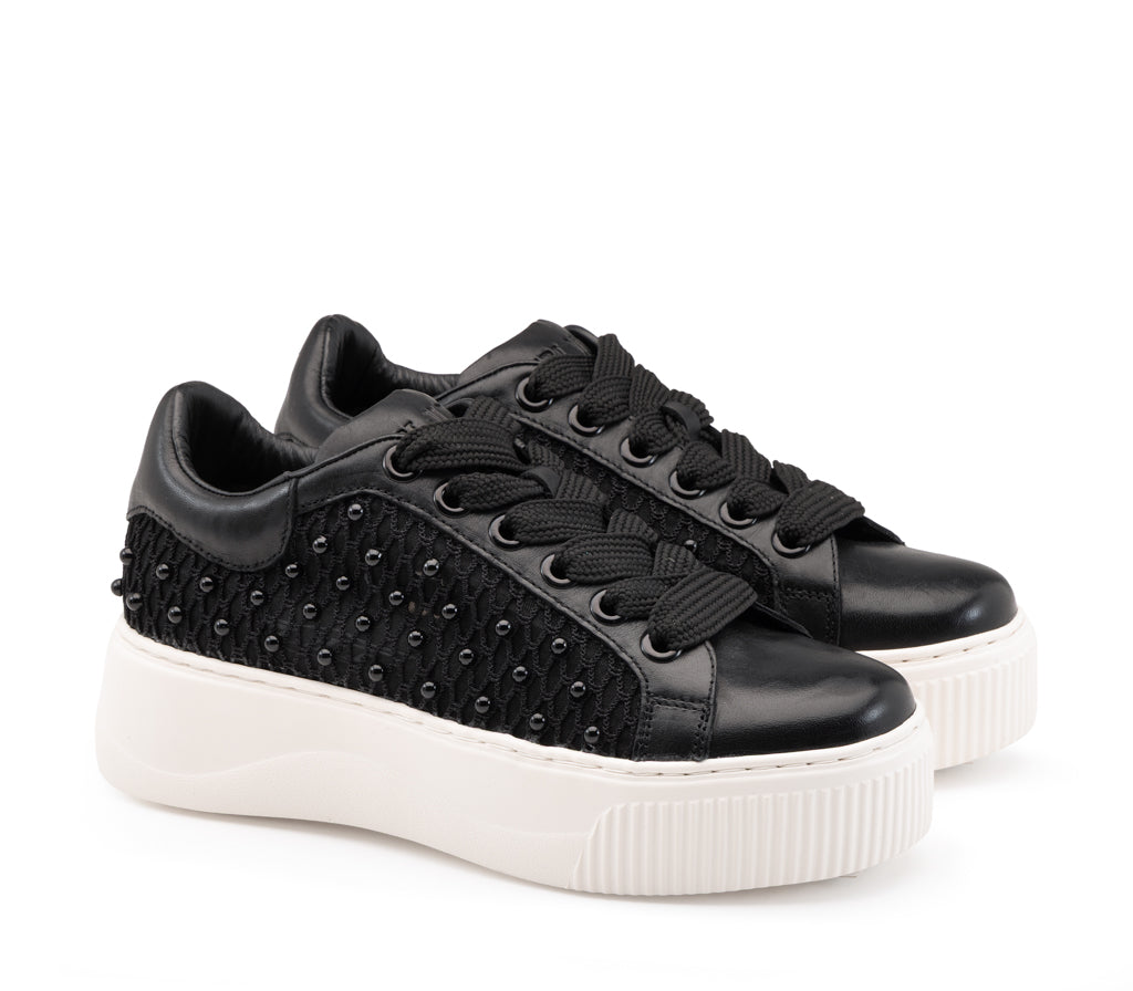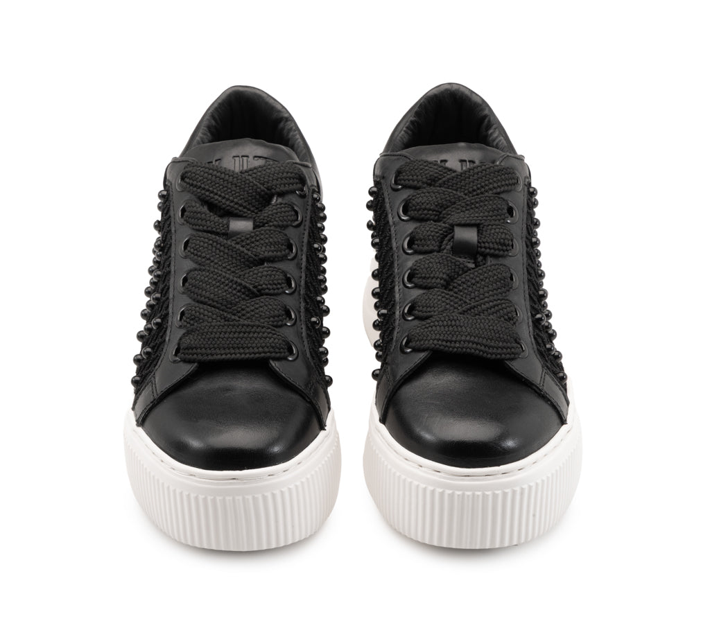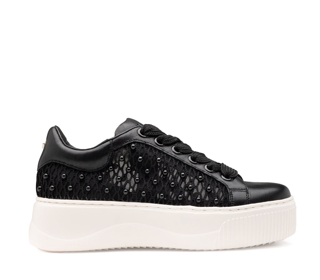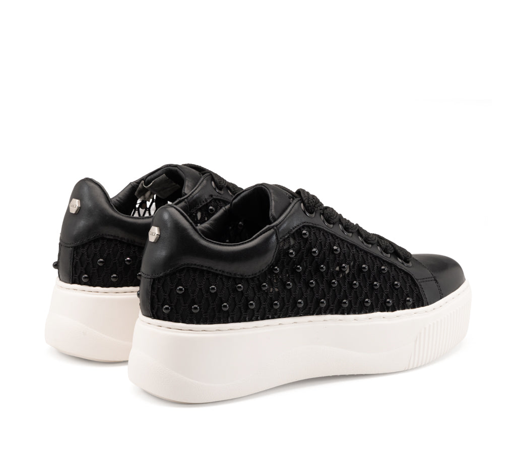 L’oscurità si fa preziosa: questa sneaker in pelle nera sfida le convenzioni con una texture a rete e micro-borchie tono su tono. La maxi platform a contrasto bianco esalta un'attitudine rock, audace e profondamente indipendente.