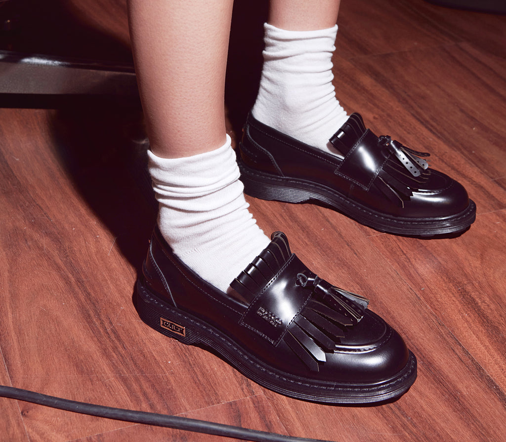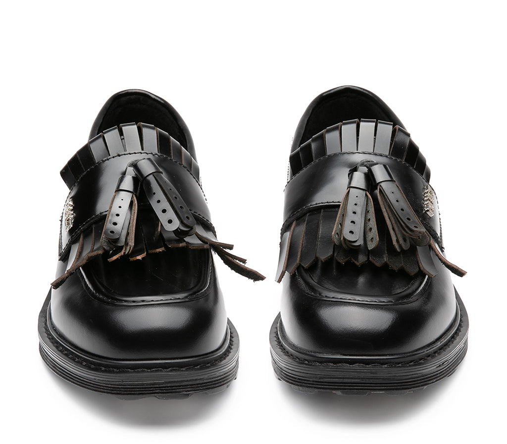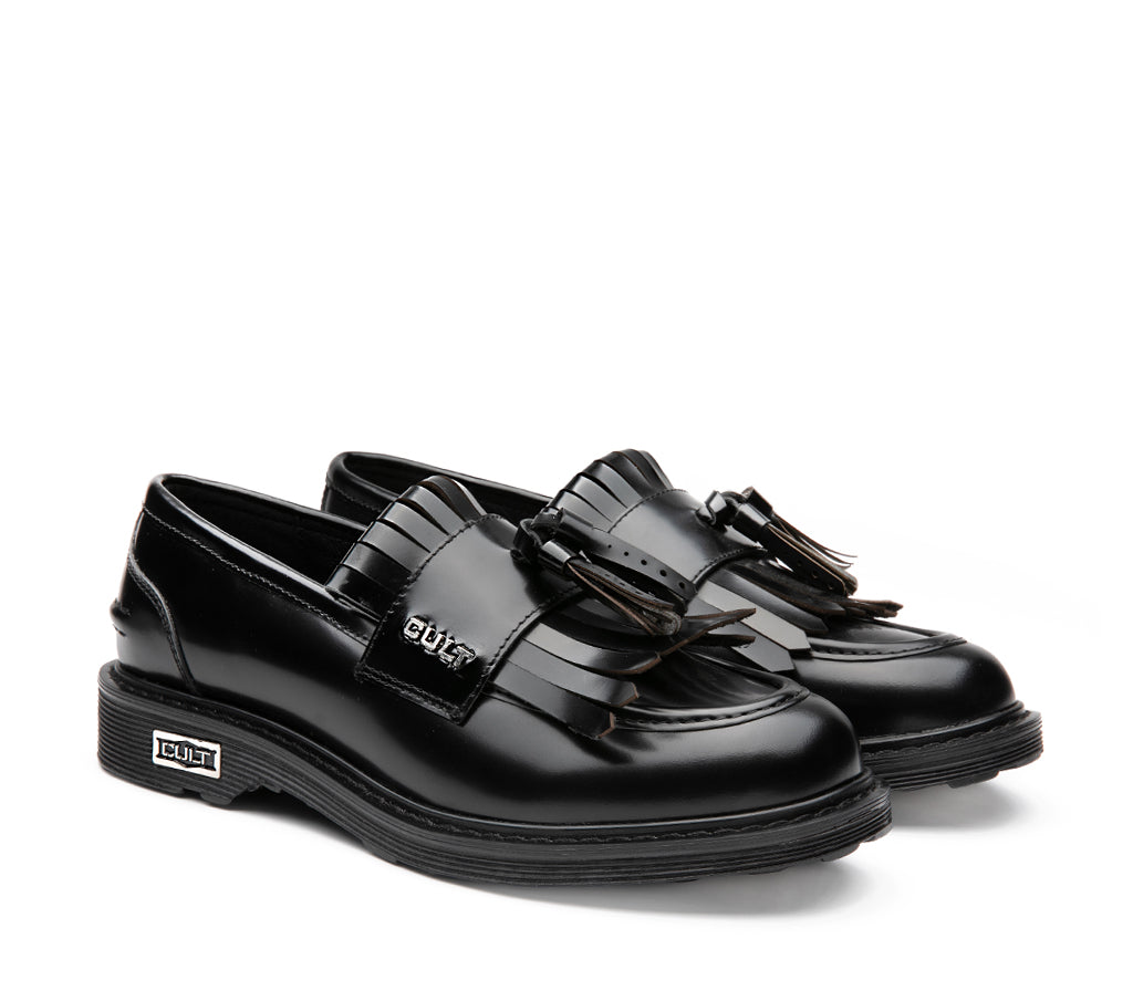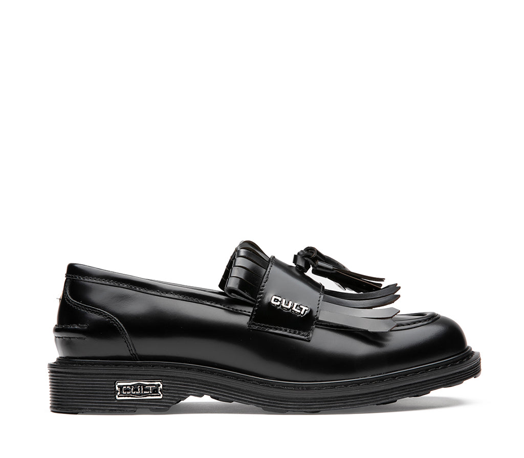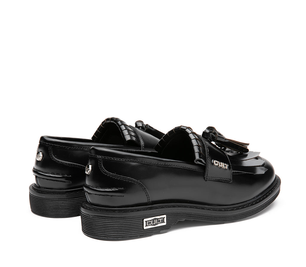 Women's black leather low loafers with a shiny finish, inspired by Cult's rebellious aesthetic. The model is embellished with bangs and front tassels that add a retro touch to the design. The clean lines and minimal design are enhanced by the platform sole and solid construction. Ideal for a bold and contemporary look.