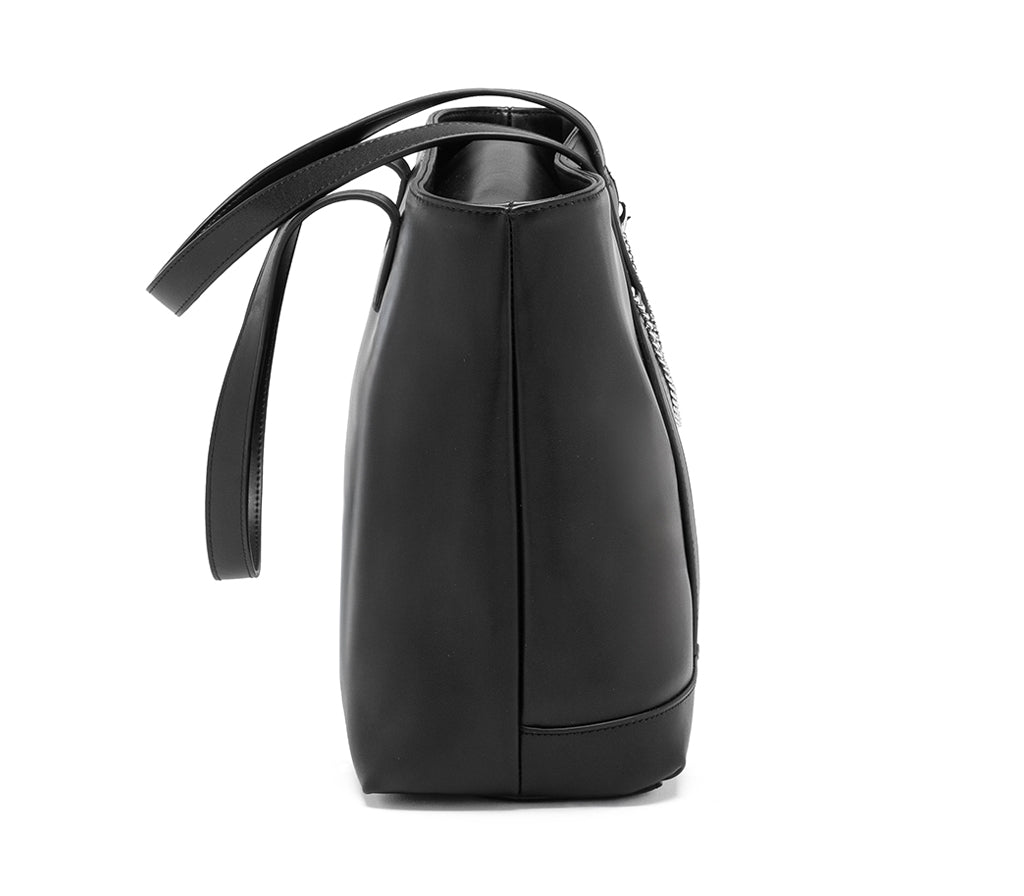 The Jennifer shopper is the ideal accessory for those seeking style and functionality. Made of black faux leather, it features long handles for comfortable shoulder carrying and a decorative chain with hexagonal emblem on the front. Capacious and refined, it is perfect to accompany you on busy days with a touch of class.