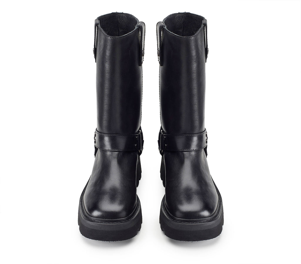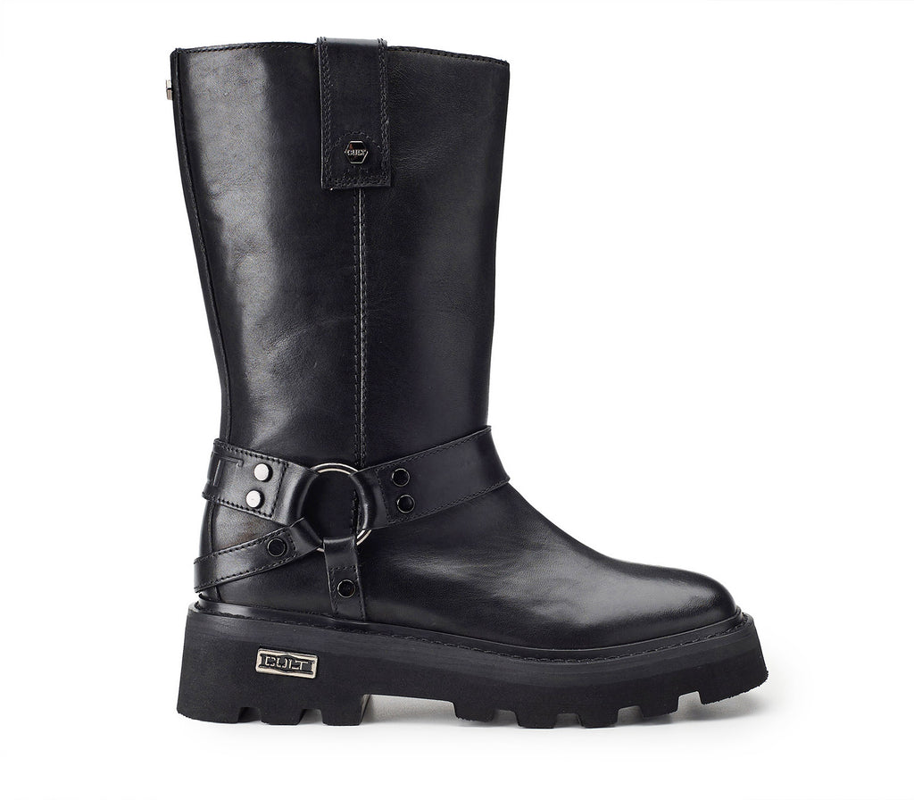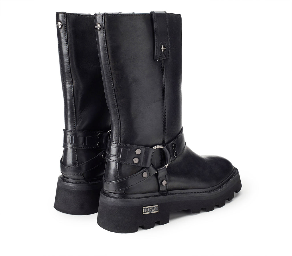 For those who prefer to externalize their strength and boldness, Cult has designed the Skin family biker boots. Made of black leather, they rest on a lightweight EVA+rubber sole, with a square template, the iconic and ever-present Cult metal nameplate and are finished with a gaiter with three ring straps.
