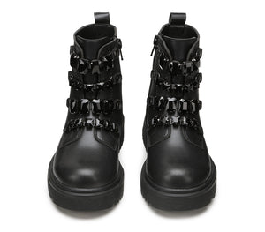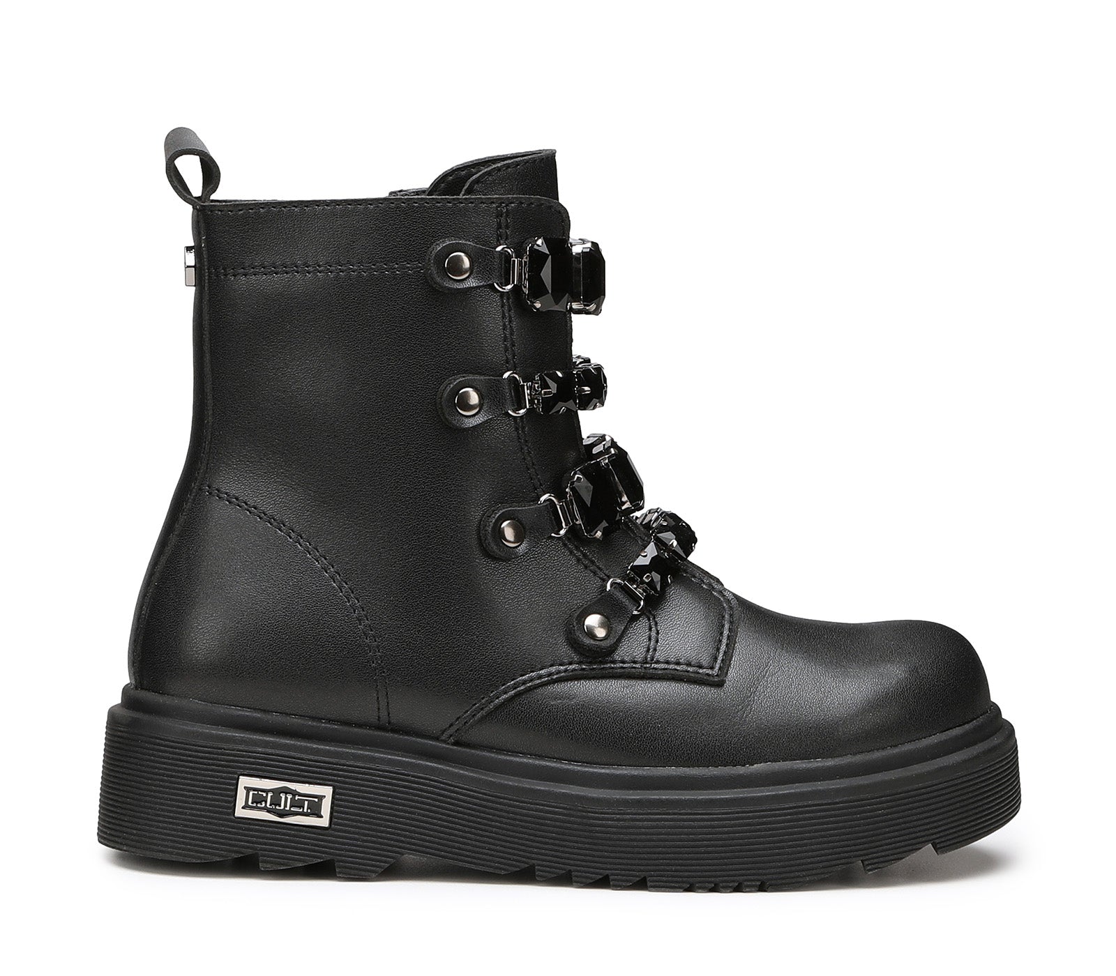 The amphibians in Cult's mini me version are made of soft black faux leather. The design features sturdy rubber soles, internal zippers for easy wearing, and decorative stones in place of laces.