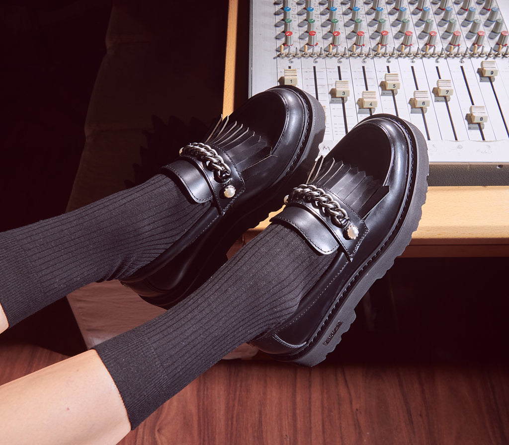 A timeless classic revisited with a modern twist, this black smooth leather loafer is embellished with a metal chain on the cap that gives it an elegant and distinctive touch. Perfect for professional settings or to complete sophisticated looks, it is synonymous with style and sophistication.