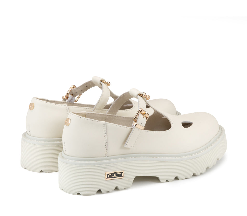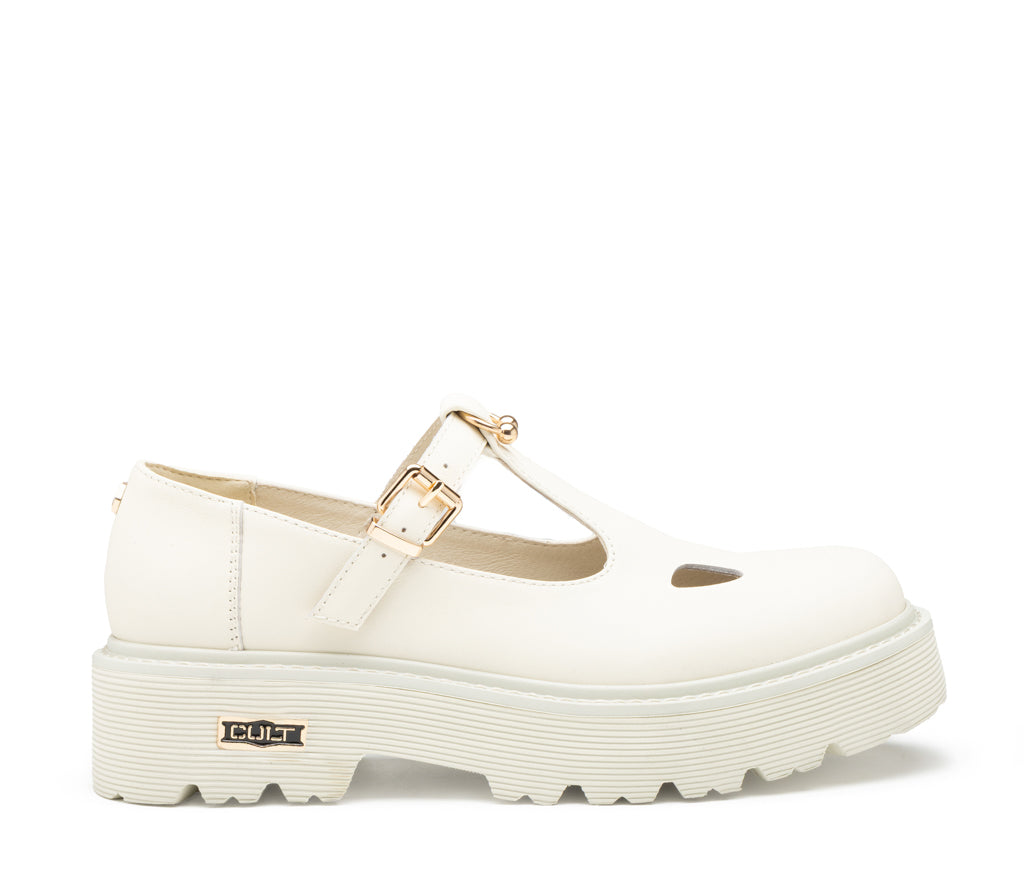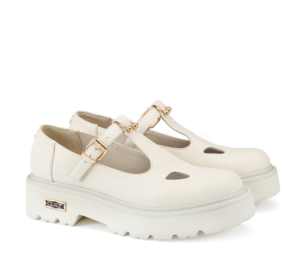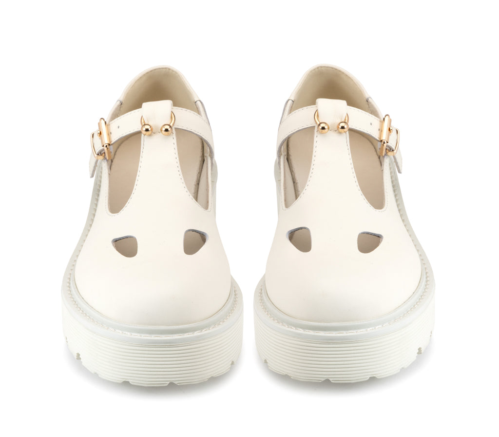Purezza e carattere: Mary Jane in pelle color off-white definita da una silhouette pulita e l'iconica maxi suola platform. Il perfetto equilibrio tra raffinatezza e spirito glam-rock per un look che non passa inosservato.