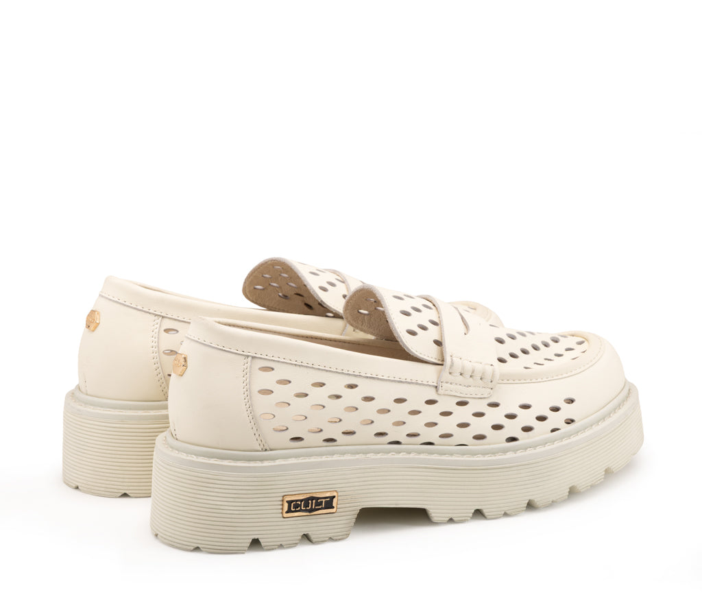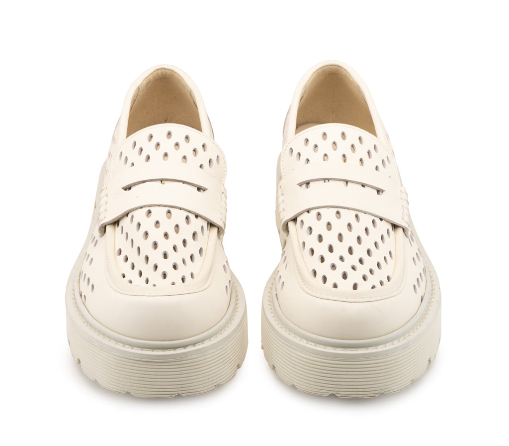 Il mocassino classico incontra l'audacia urbana: interamente in pelle off white, questo modello si distingue per il design traforato ovale all-over e l'iconica maxi suola platform carrarmato. Un'estetica audace per un look glam-rock deciso e indipendente.