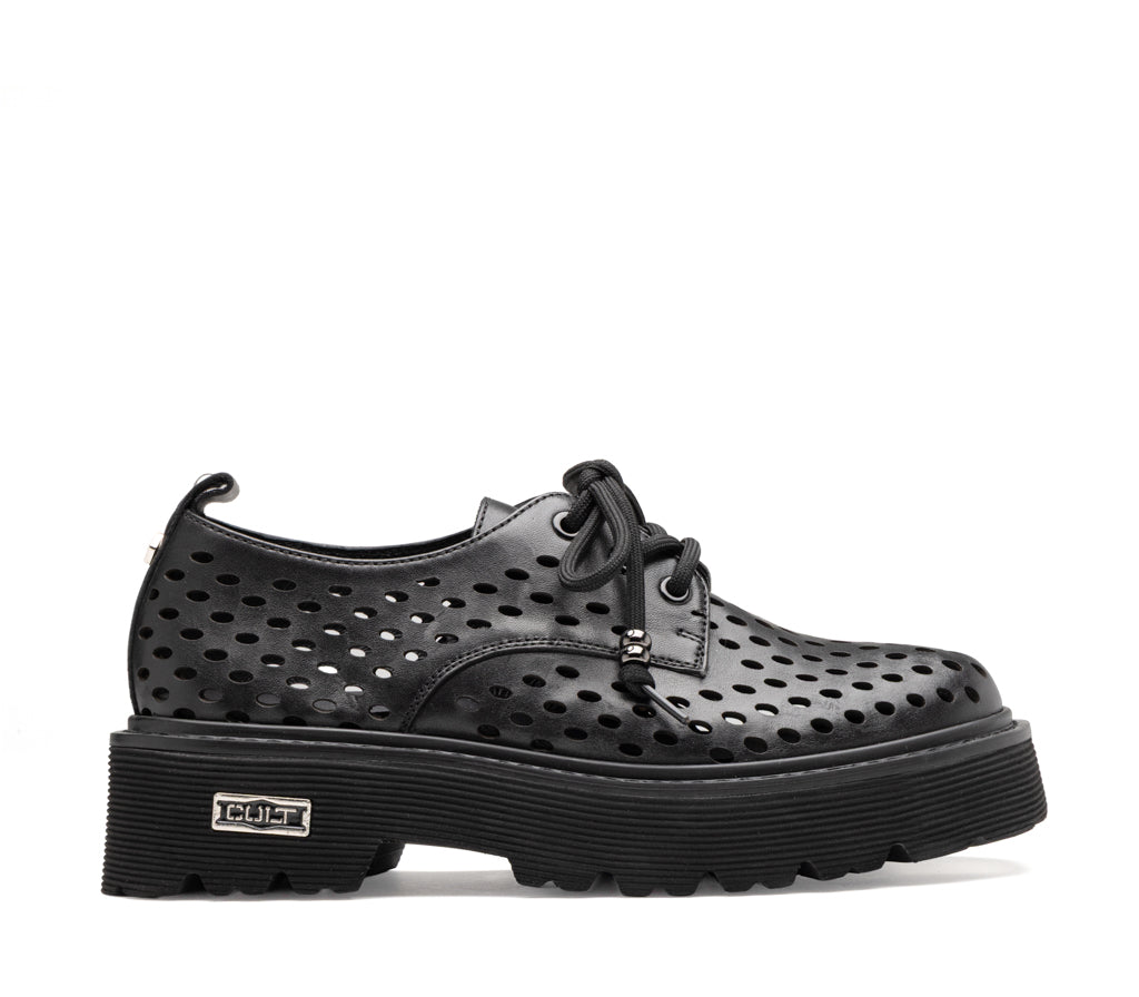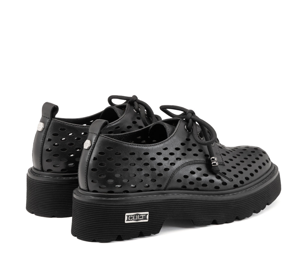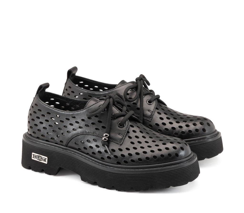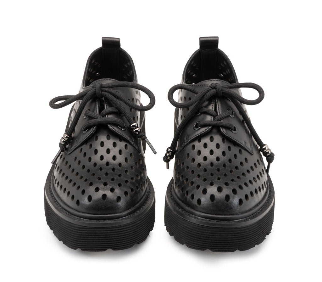 L'eleganza si fa audace: questa stringata in pelle nera stupisce con un design forato all-over che fonde traspirabilità e stile. La maxi suola platform carrarmato completa il look, offrendo un’attitudine indipendente e decisamente glam-rock.