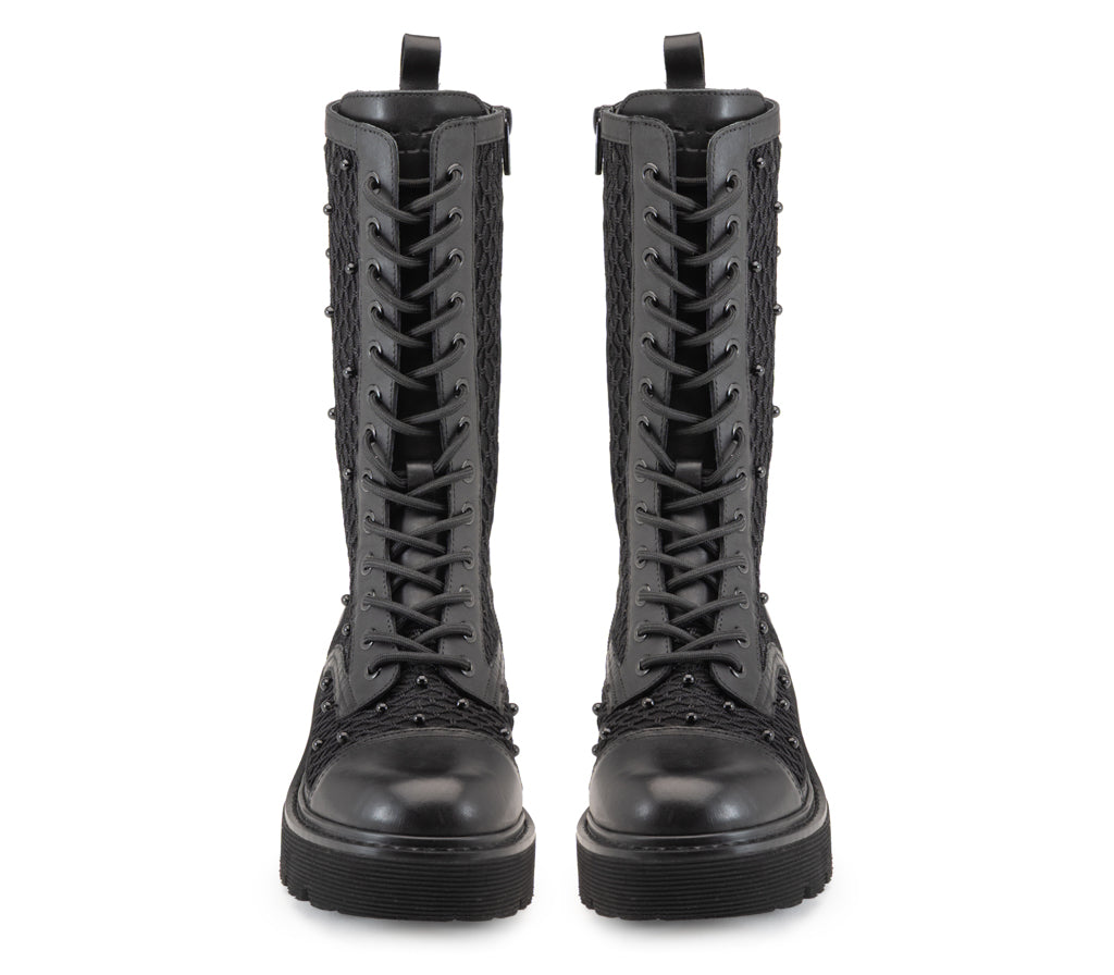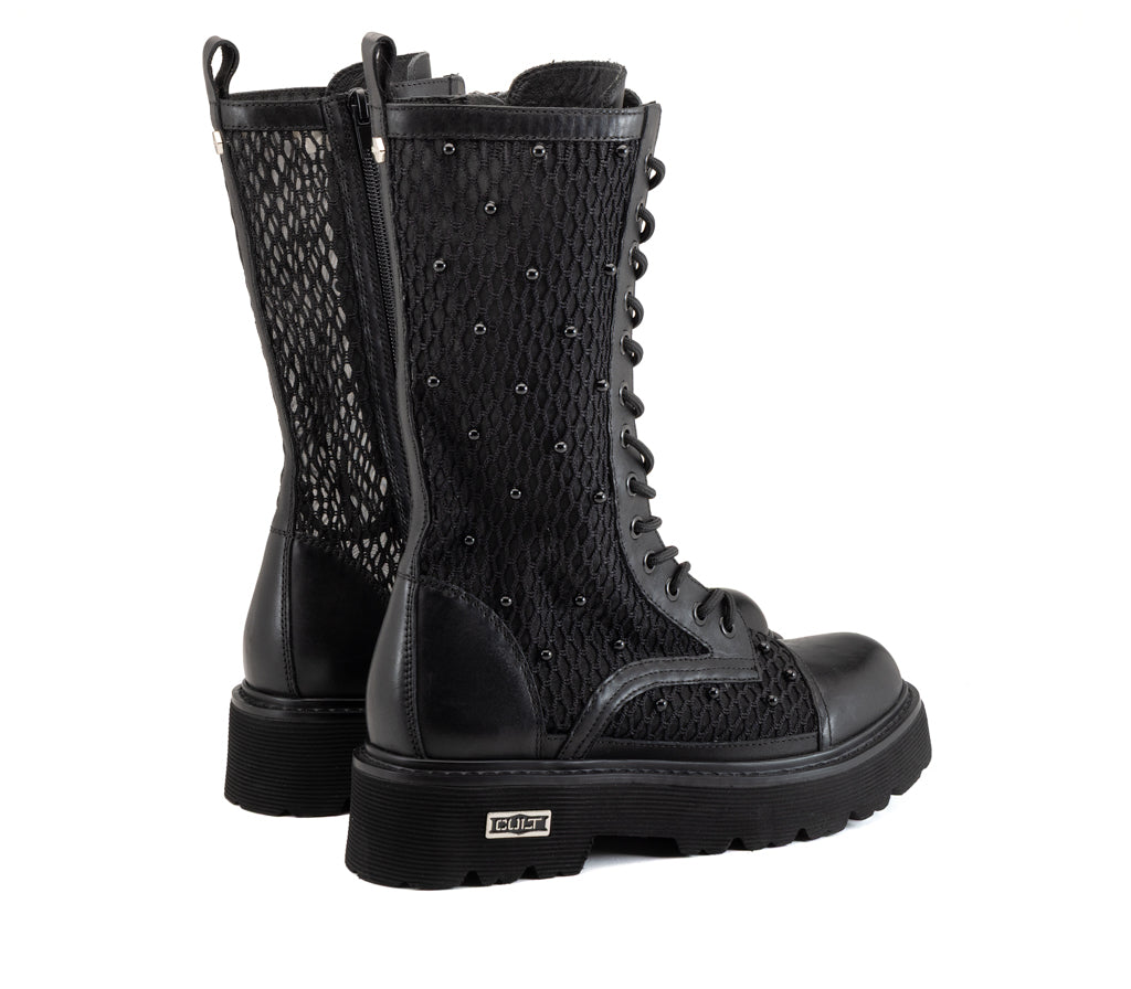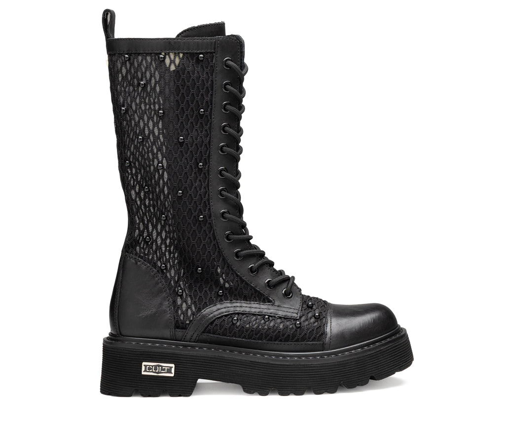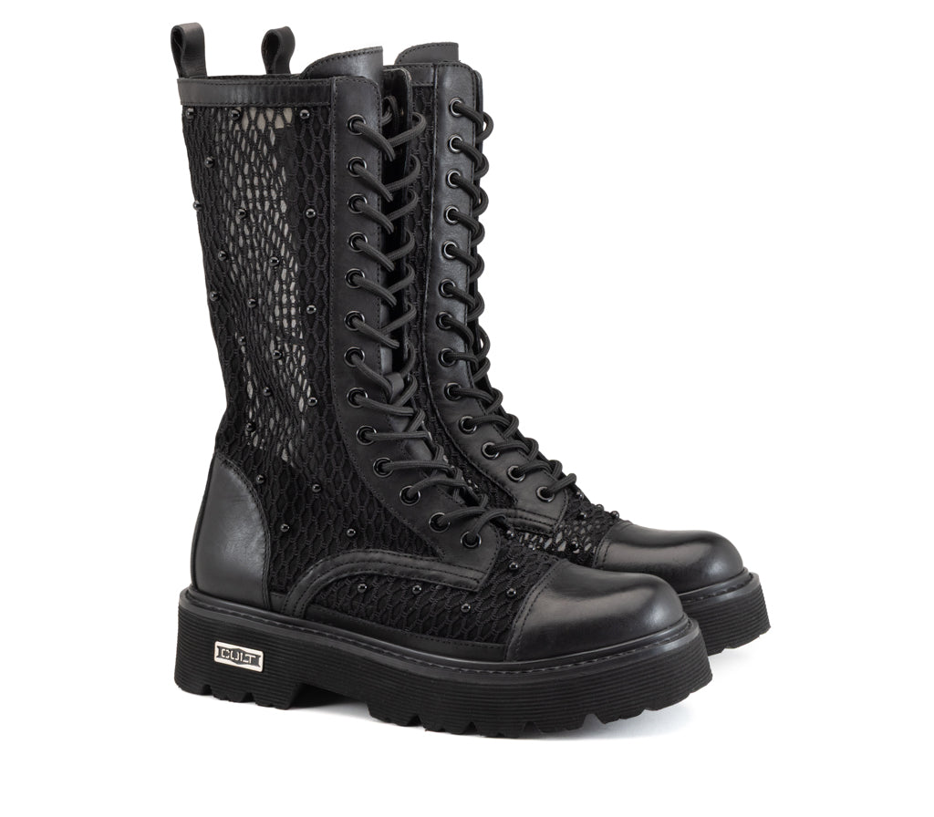 L’iconico stivale Slash by Cult si evolve in chiave glam-rock estiva con un’audace tomaia in mesh traforato e micro-borchie sur-tone all-over. La silhouette slanciata è sorretta dalla leggendaria suola platform carrarmato, fondendo l'anima black del brand con un tocco di ribellione iper-femminile. Un must-have per un look street-edge senza compromessi.
