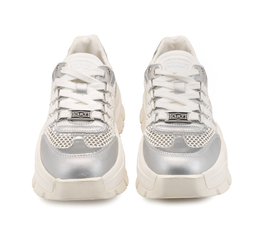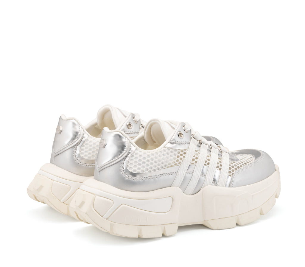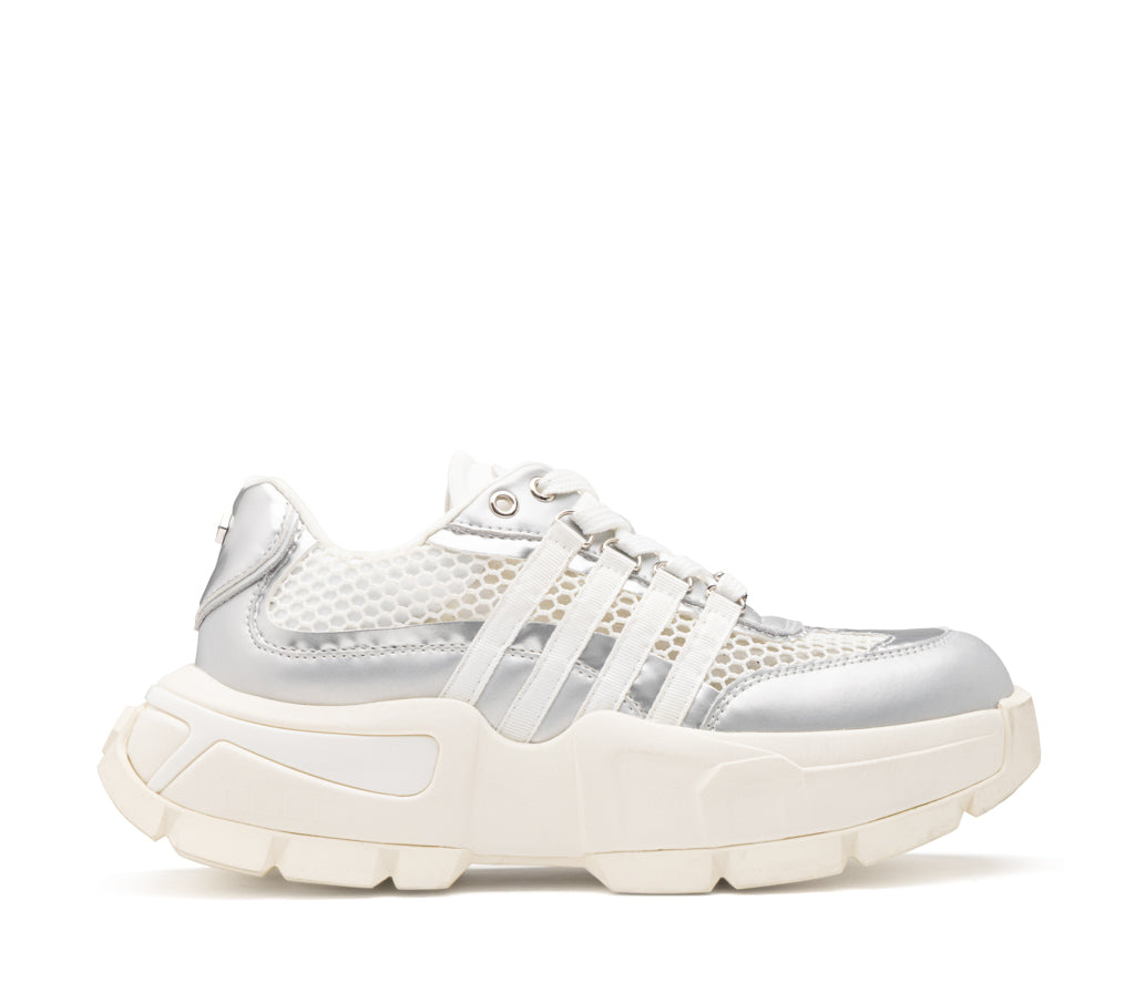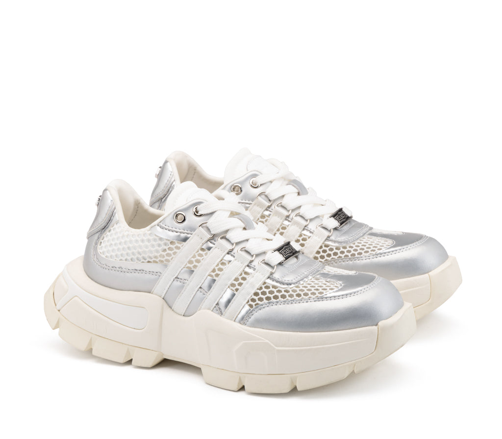 Design futuristico e attitudine street si fondono nella sneaker Taylor. La tomaia in mesh a nido d'ape è esaltata da inserti in pelle silver metallizzati e una struttura a bande laterali che ne enfatizza il dinamismo. La maxi suola carrarmato ultra-light completa questo modello iconico, perfetto per chi cerca un look audace e d'avanguardia senza compromessi.