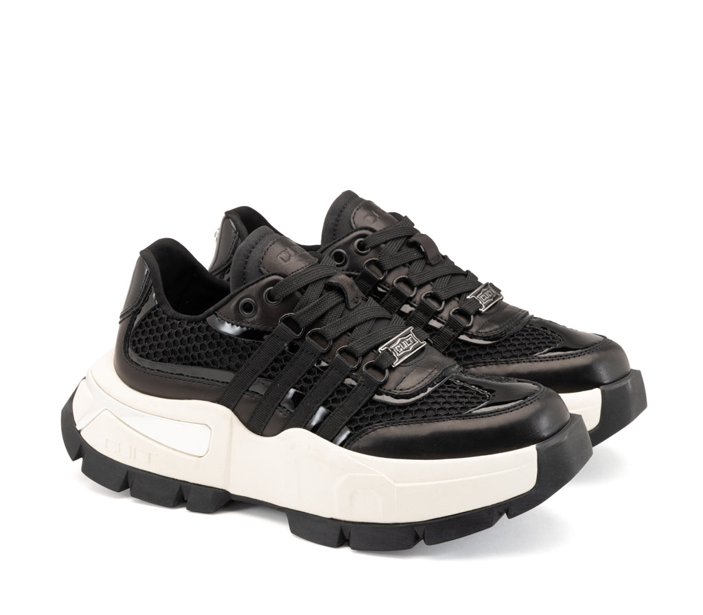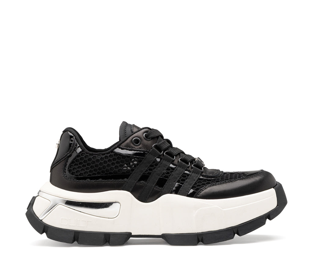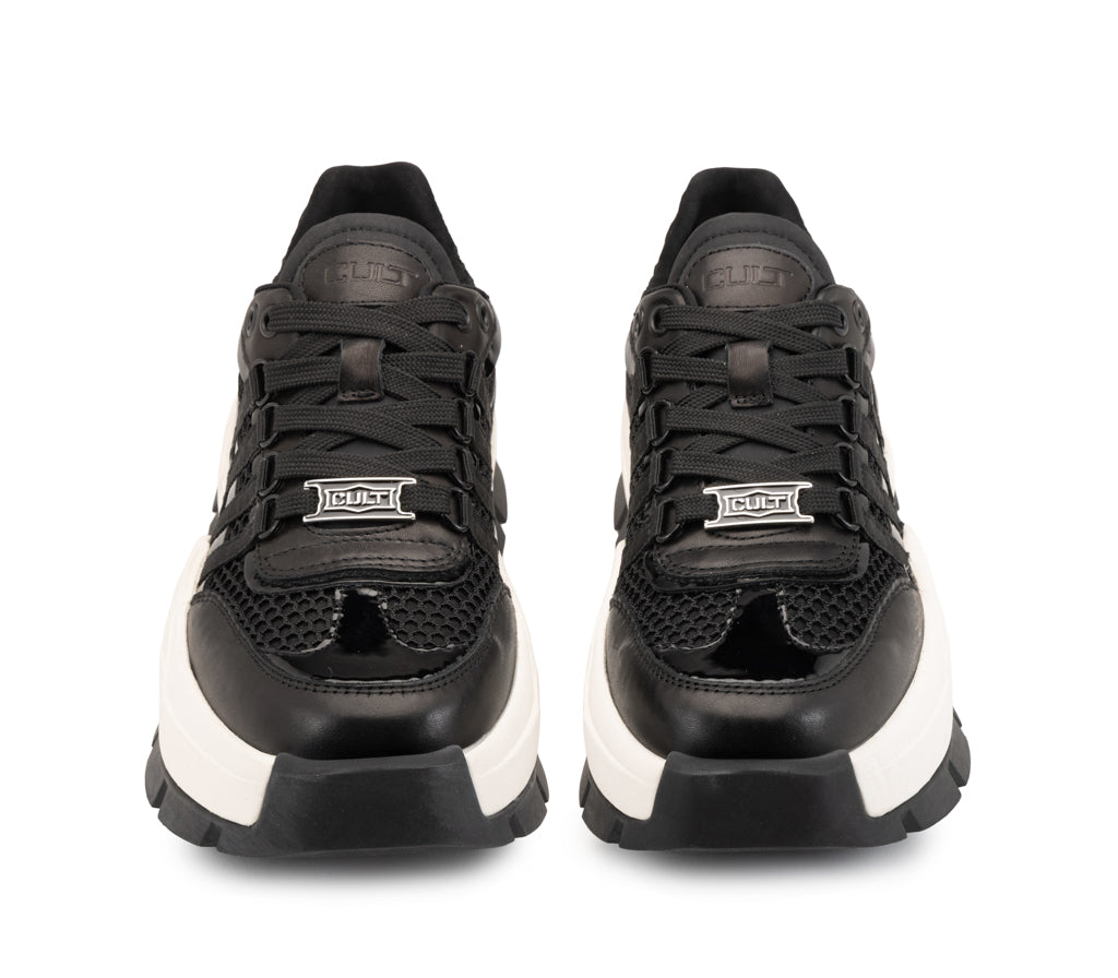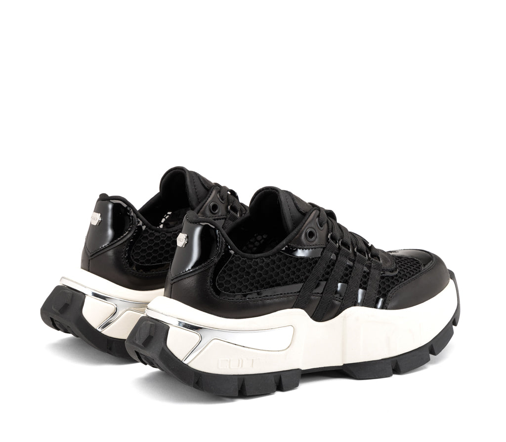 L'anima più dark di Cult si esprime nella Taylor black: un mix magnetico di mesh a nido d'ape e dettagli metallizzati tono su tono. La struttura tecnica con bande laterali e l'audace suola carrarmato ultra-light definiscono una sneaker dal carattere forte e d'avanguardia. Il manifesto definitivo dello stile urban-rock contemporaneo