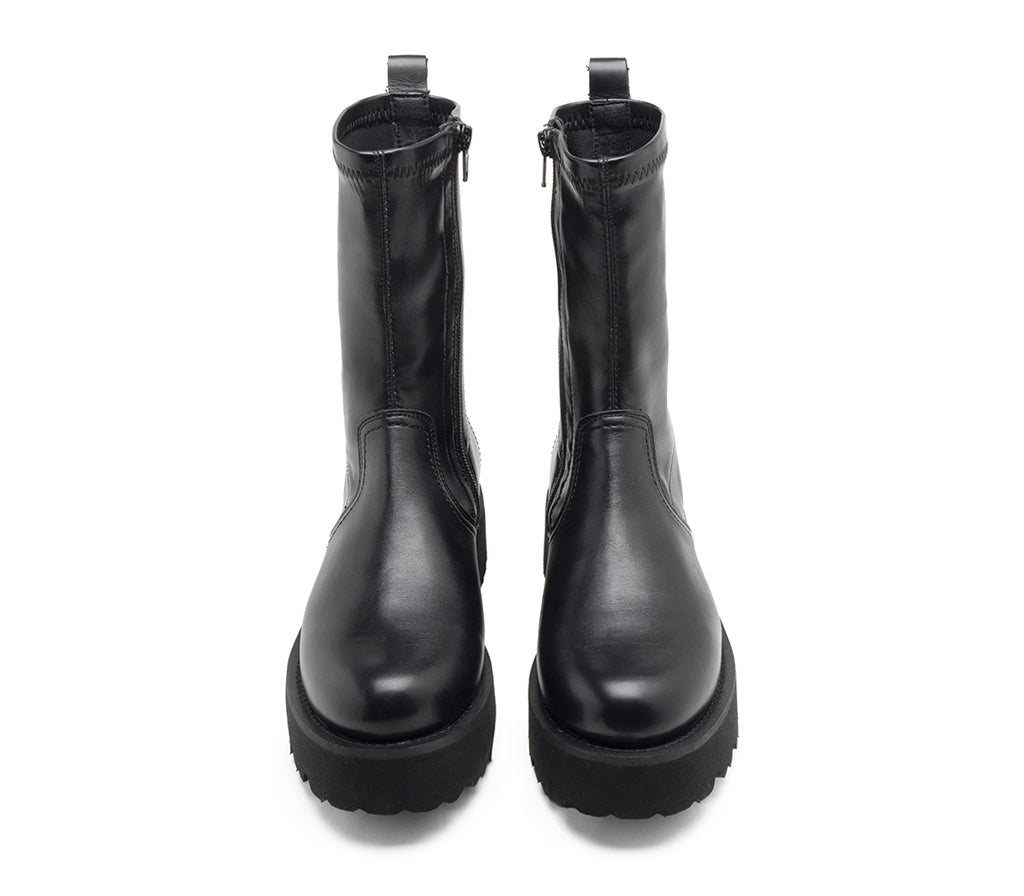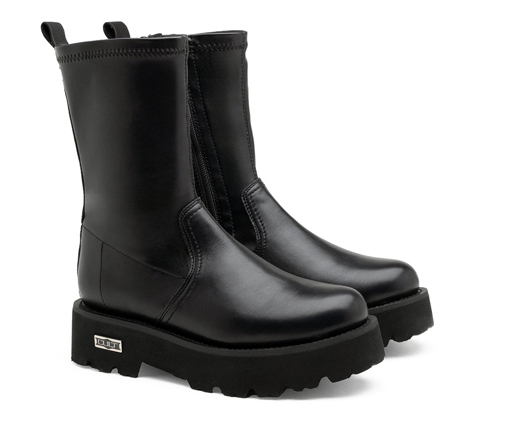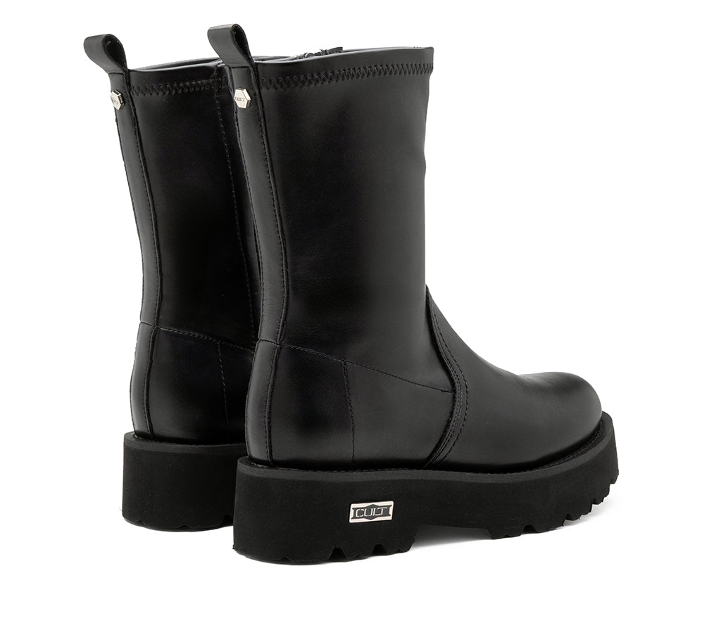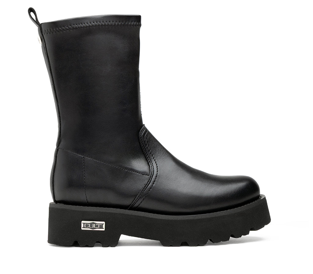 Ankle boots made from black vegan leather, featuring a slim design with a stretch upper that wraps around the ankle with femininity. The soft upper follows the silhouette with a minimalist look, while the lugged sole adds height and modern character. The metallic CULT logo on the side adds the brand's unmistakable signature. A versatile style with glam-rock appeal, perfect for adding a bold touch to both everyday outfits and edgier urban looks.These shoes contain no animal-derived components in the upper, inner lining, treatments, or finishes, while maintaining 100% of the CULT DNA. Totallyanimal-free.