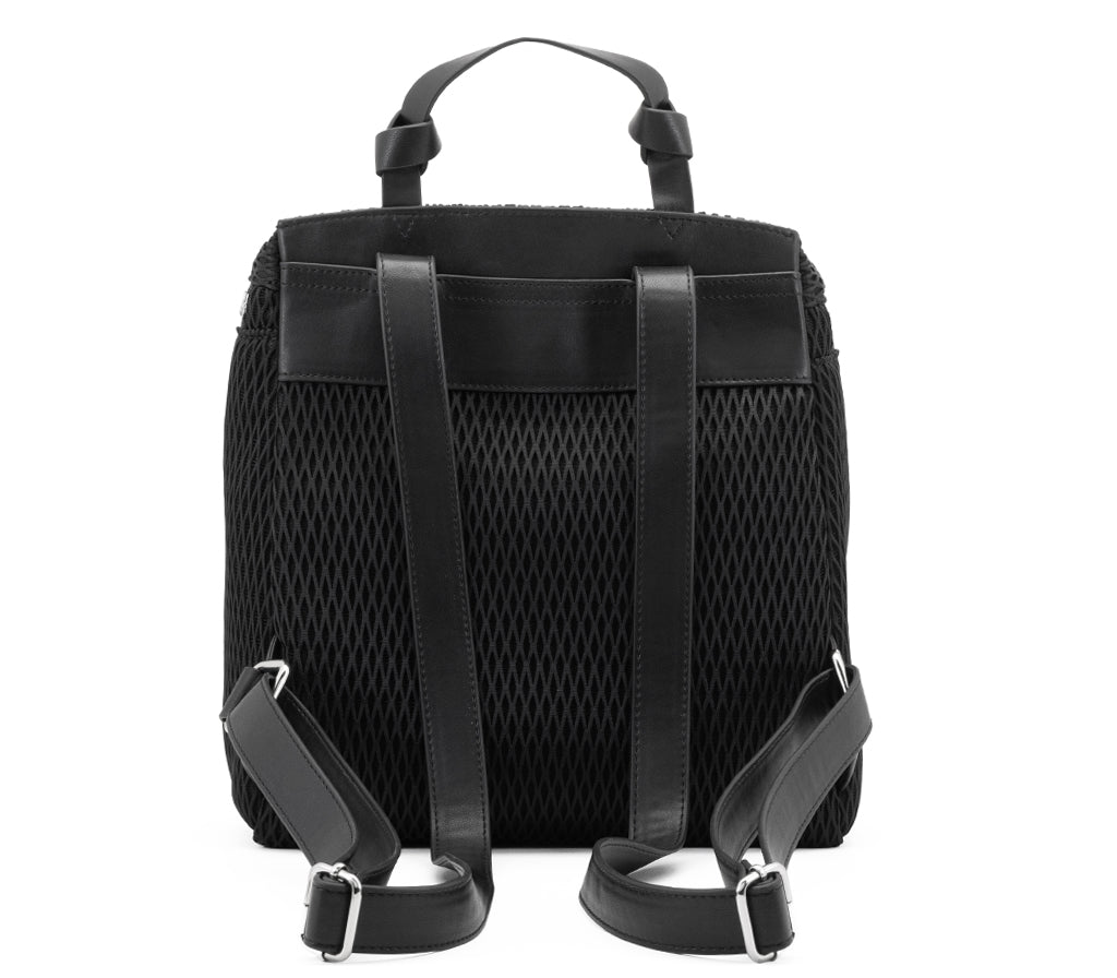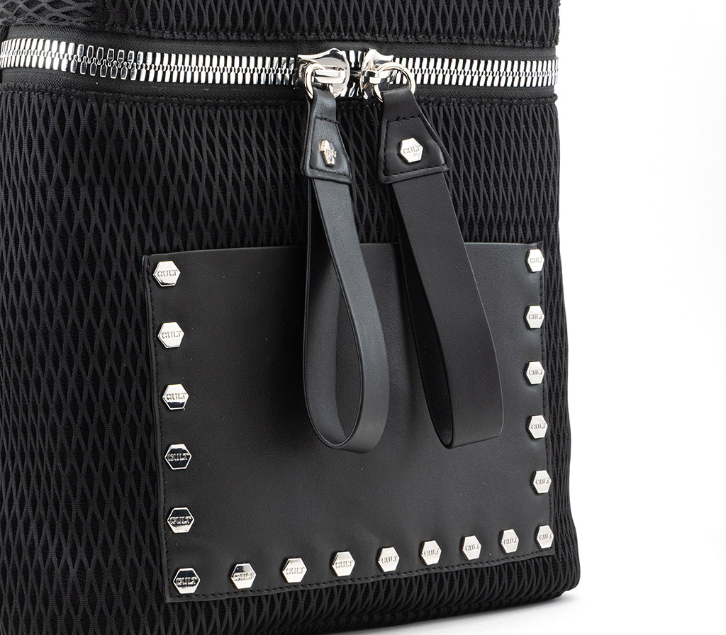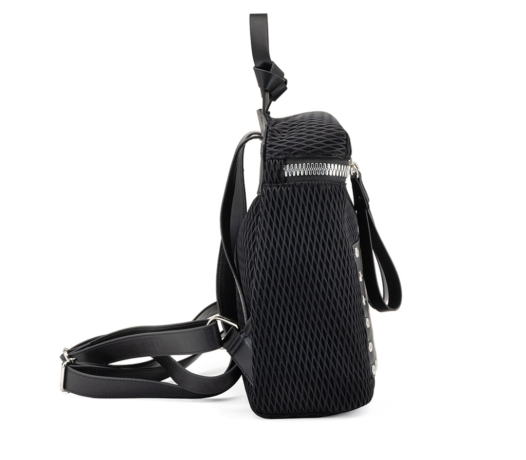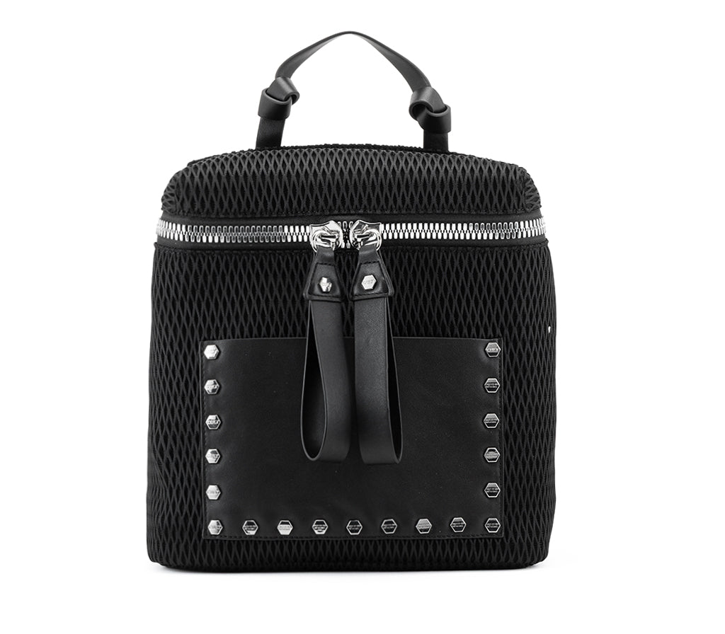 Innovazione tessile e dettagli industrial definiscono lo zaino Holiday per la stagione SS26, un accessorio che riscrive i canoni dell'urbanwear contemporaneo. Realizzato in un sofisticato tessuto tecnico a rete tridimensionale nera, questo zaino si distingue per la maxi zip metallica a contrasto e la tasca frontale in ecopelle liscia, incorniciata da una fila di iconiche borchie silver. Con il suo design strutturato e l'anima profondamente tecnologica, è l'alleato ideale per chi vive la città con dinamismo e spirito rock. Dimensioni: 26x29x11 cm.